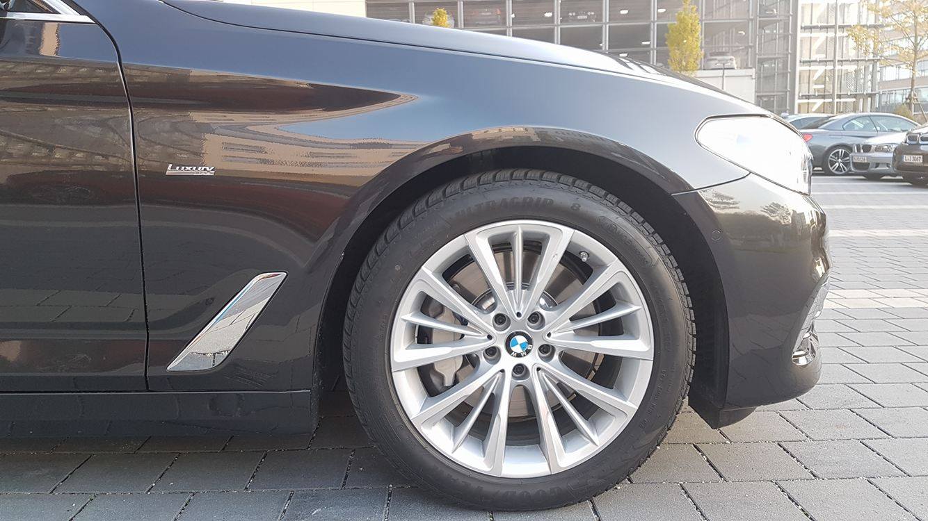 Dank der Fotos aus der Nähe können wir auch Details wie die aus aerodynamischen Gründen geschlossenen Nieren-Blenden, die Tagfahrlicht-Ringe der Voll-LED-Scheinwerfer oder den Übergang zwischen Motorhaube und Nieren genauer betrachten. Und weil der gezeigte BMW 5er G30 bereits auf Winterreifen steht, sehen wir die Limousine auch erstmals auf etwas alltäglicheren Felgen mit relativ kleinem Durchmesser.