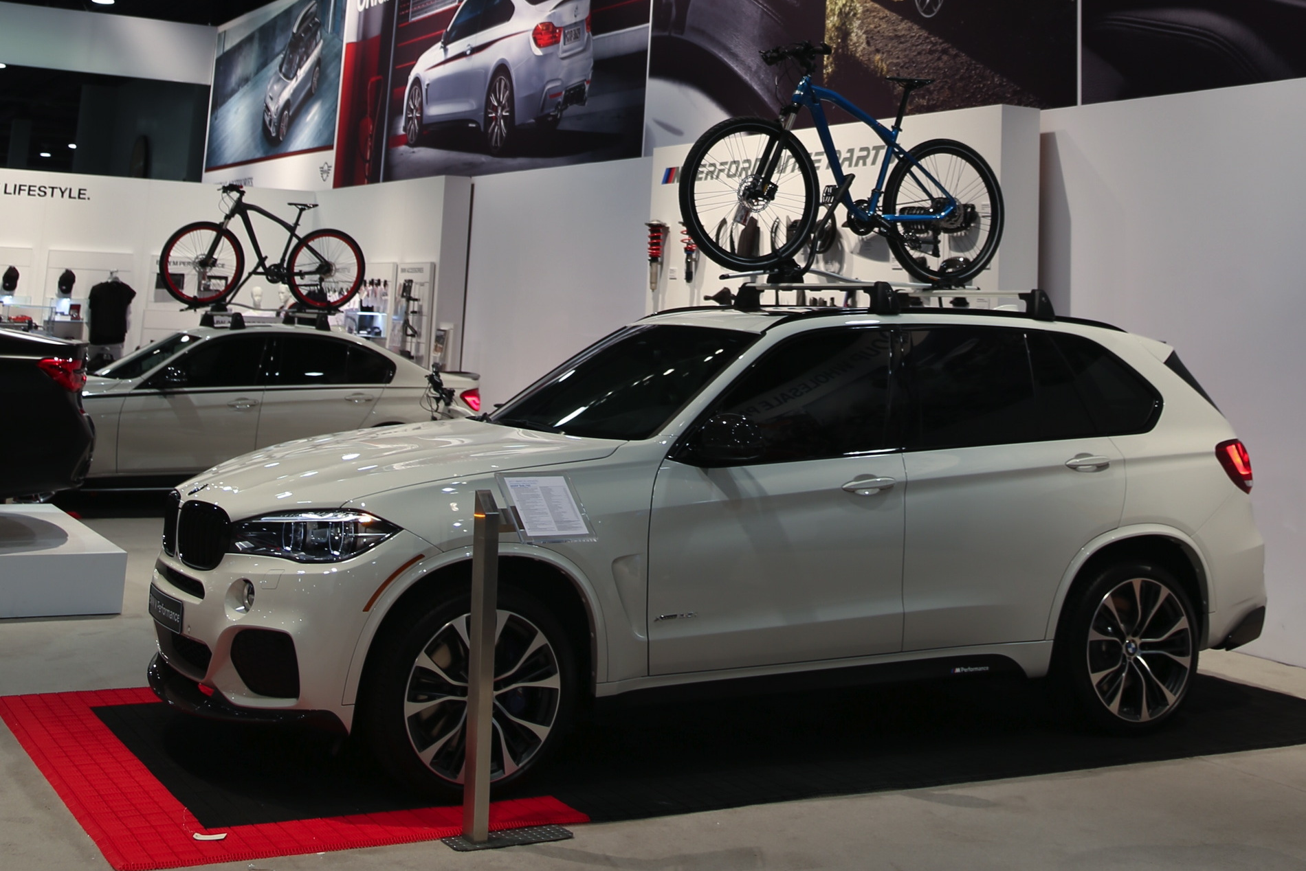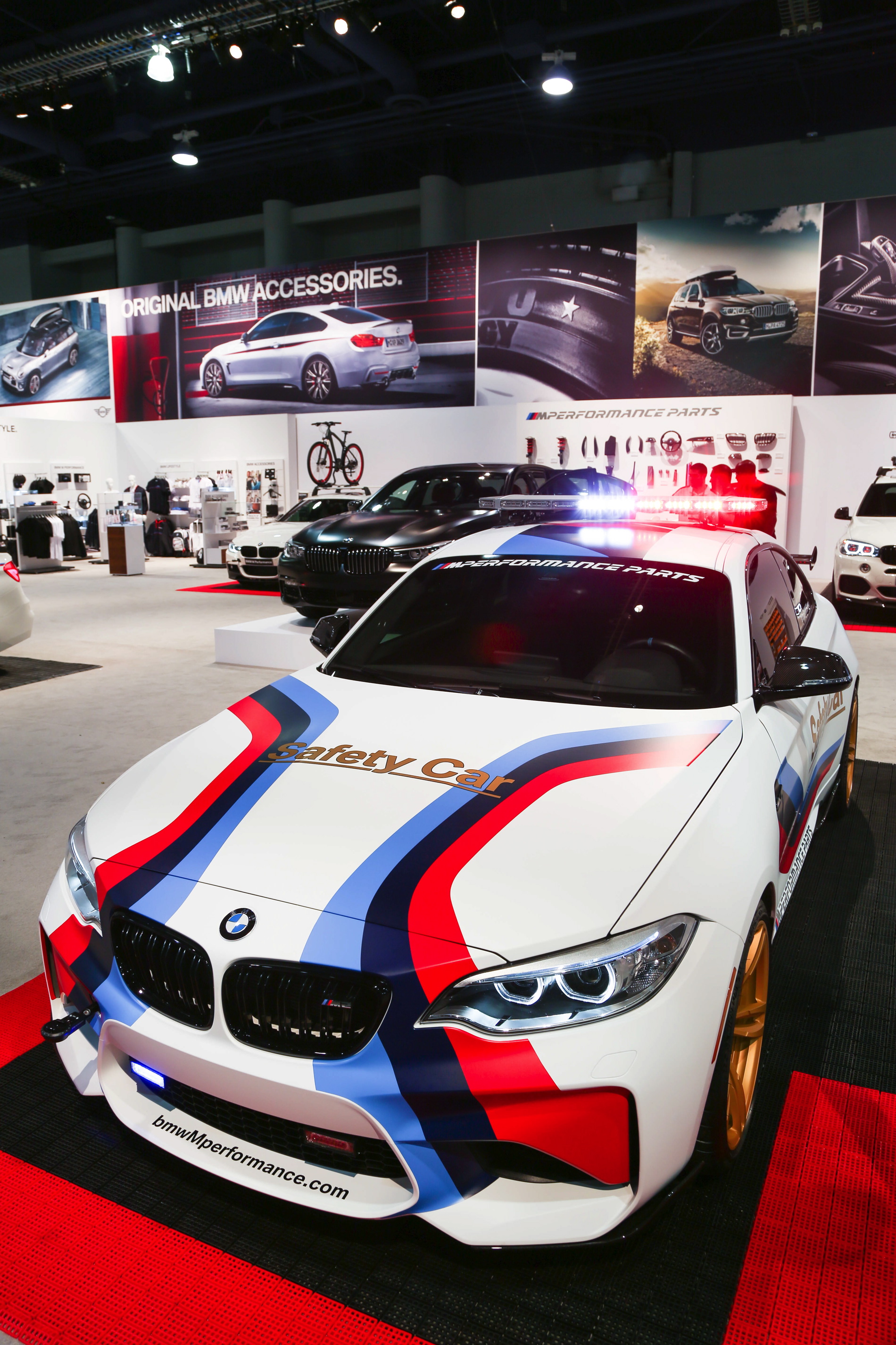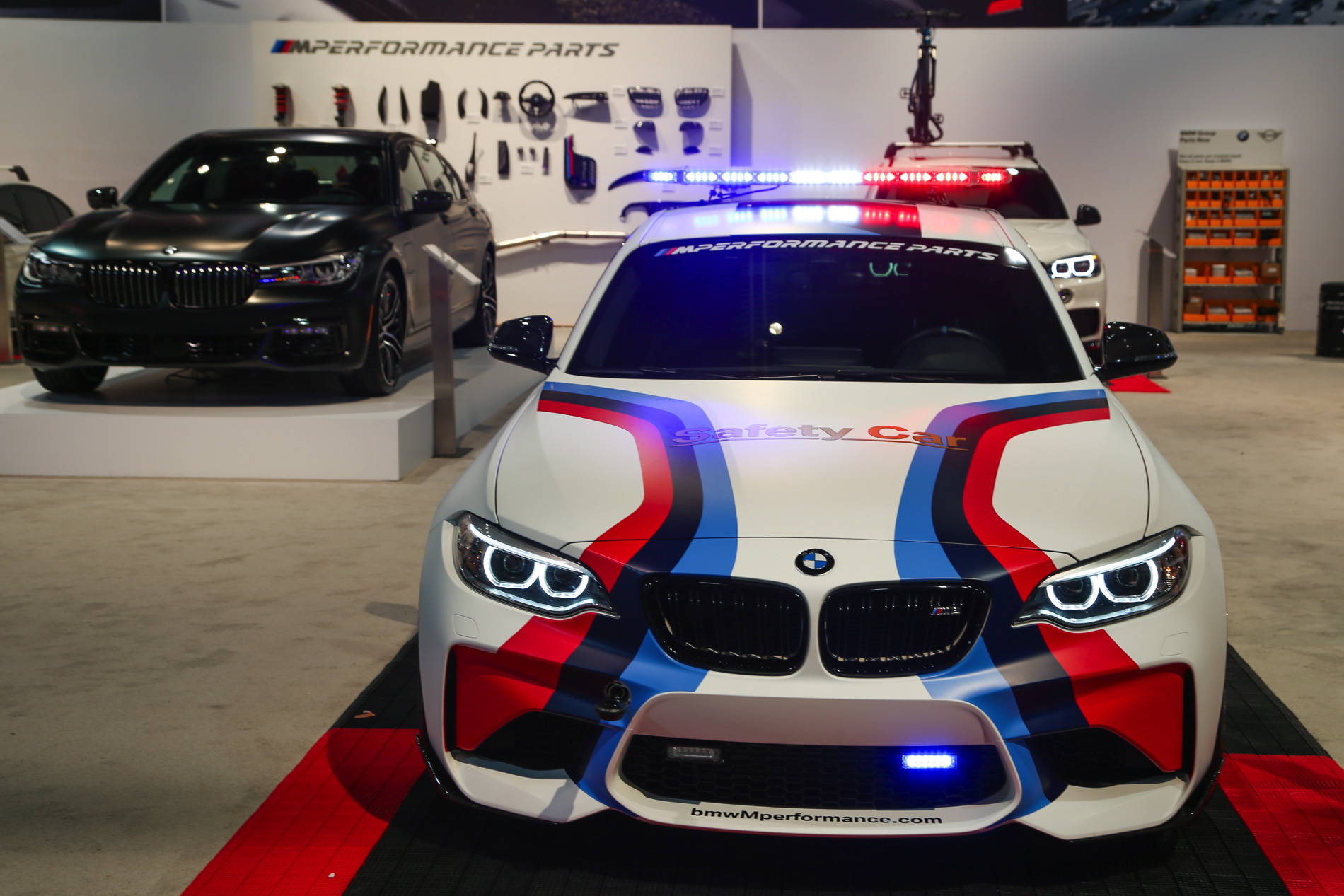 Ein weiteres Highlight am M Performance-Stand ist das BMW M2 Safety Car für die MotoGP, das in den Farben von BMW Motorsport glänzt und natürlich auch dank der wild blinkenden Lichtanlage auf dem Dach alle Blicke auf sich zieht. Dass man auch ohne derartige Lichttechnik auffallen kann, zeigen ein BMW 340i und ein BMW X5 mit zahlreichen Tuning-Komponenten aus dem M Performance-Programm.