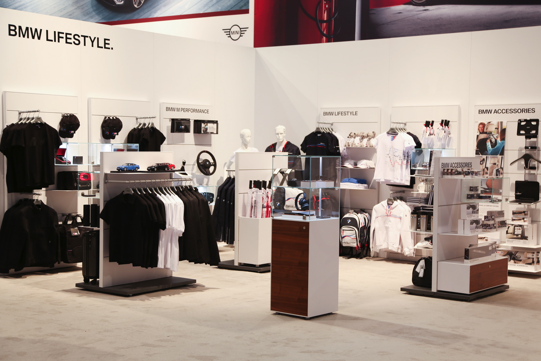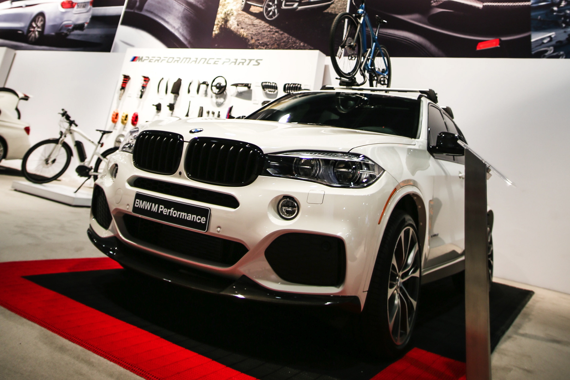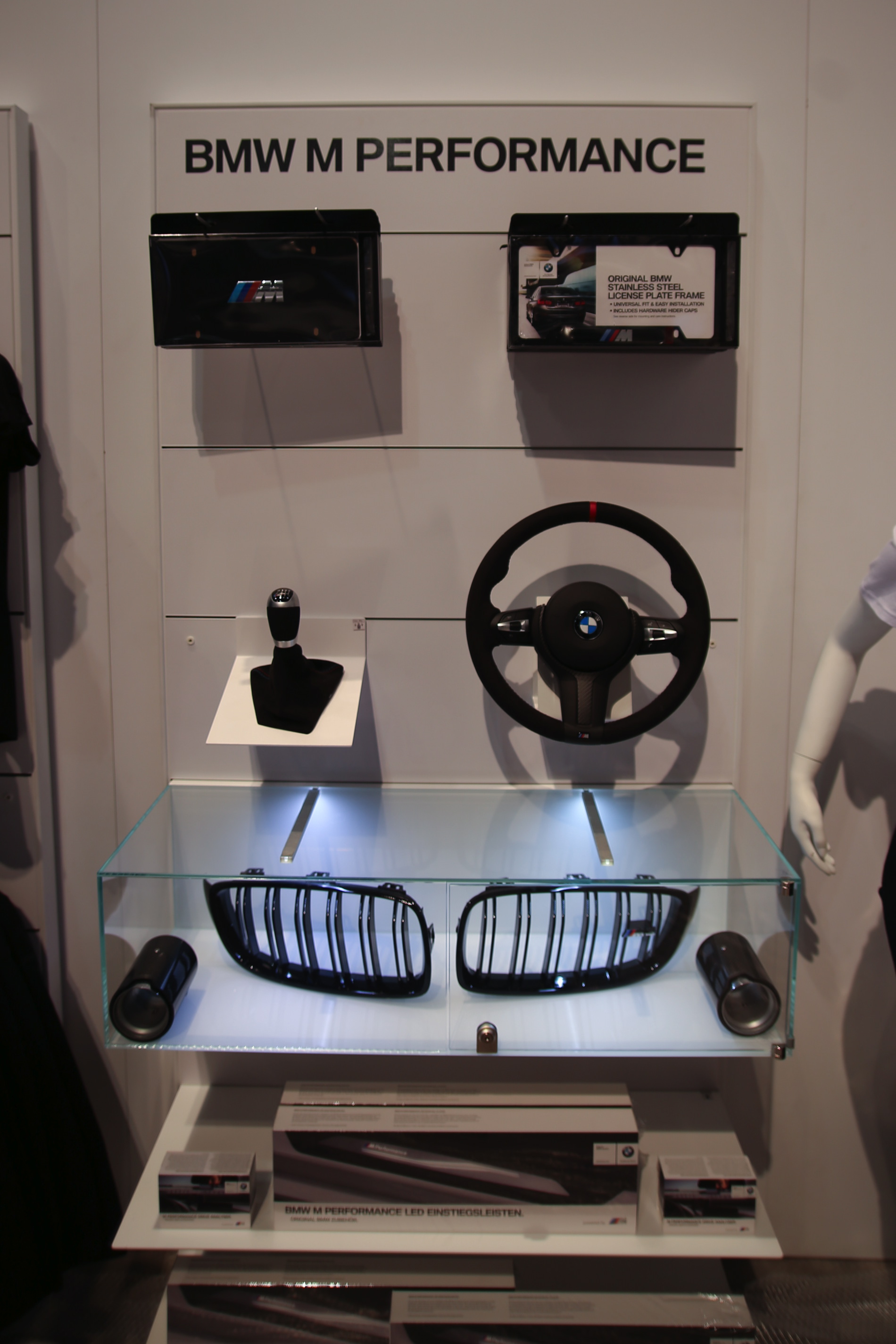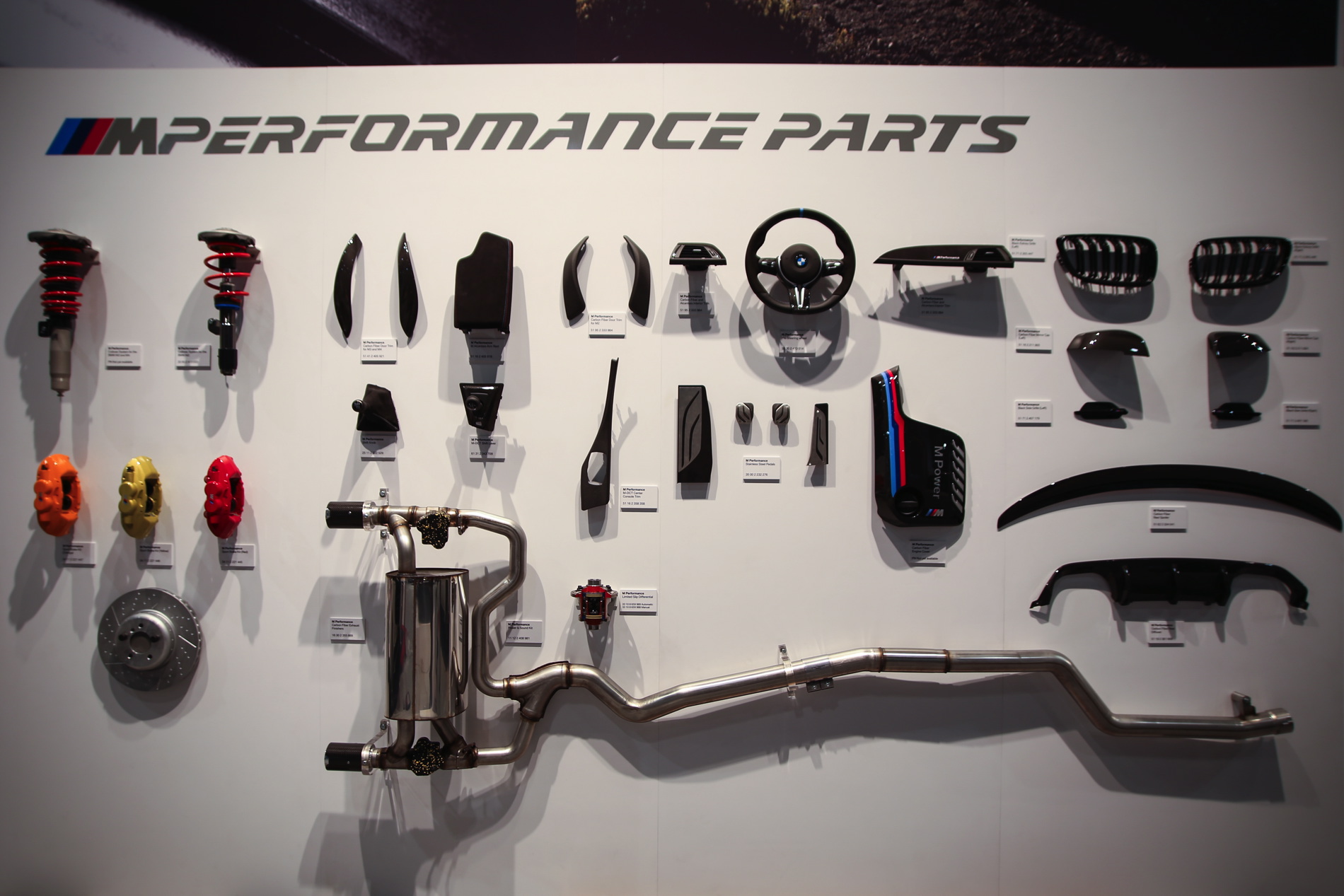 Neben den hochgerüsteten Fahrzeugen stellt BMW M Performance auf der eigenen Ausstellungsfläche bei der SEMA Las Vegas auch zahlreiche Komponenten vor, die keinen Platz an einem der Autos gefunden haben und die mittlerweile durchaus beachtliche Bandbreite des werkseigenen Tuning-Programms demonstrieren: Fast alle Baureihen lassen sich mit Hilfe des erst vor wenigen Jahren aus der Taufe gehobenen Projekts auf die eine oder andere Art und Weise sportlich veredeln.