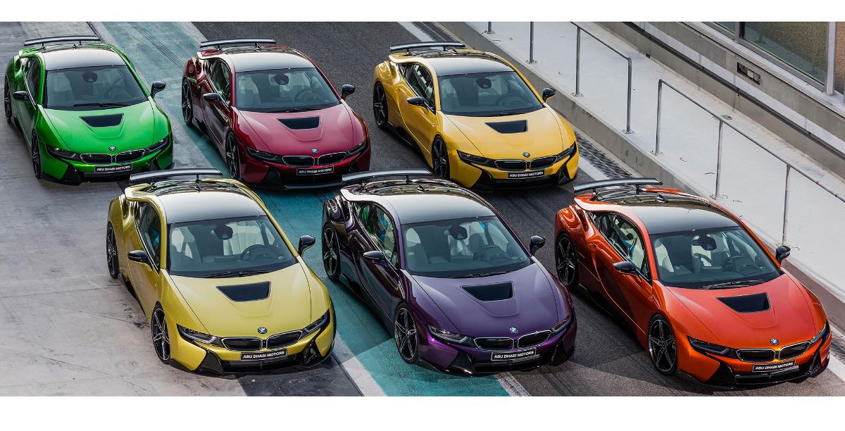 In der Vergangenheit haben wir schon häufiger über die farbenfrohen BMW i8 von Abu Dhabi Motors berichtet, nun gibt es neue Fotos mit allen sechs Exemplaren des Hybrid-Sportwagens Seite an Seite. Die arabische Website wheels.ae zeigt vier erste Fotos von den einzigartig lackierten Flügeltürern, die dank ihrer extrem kräftigen Farben enorme Exklusivität versprechen und sich nochmals erheblich stärker von der automobilen Masse abgrenzen als ein serienmäßiger BMW i8.
