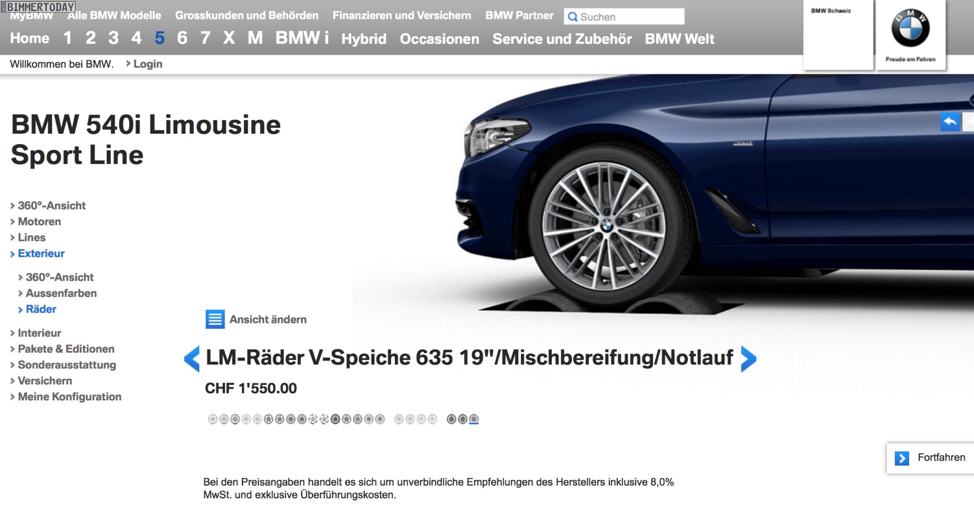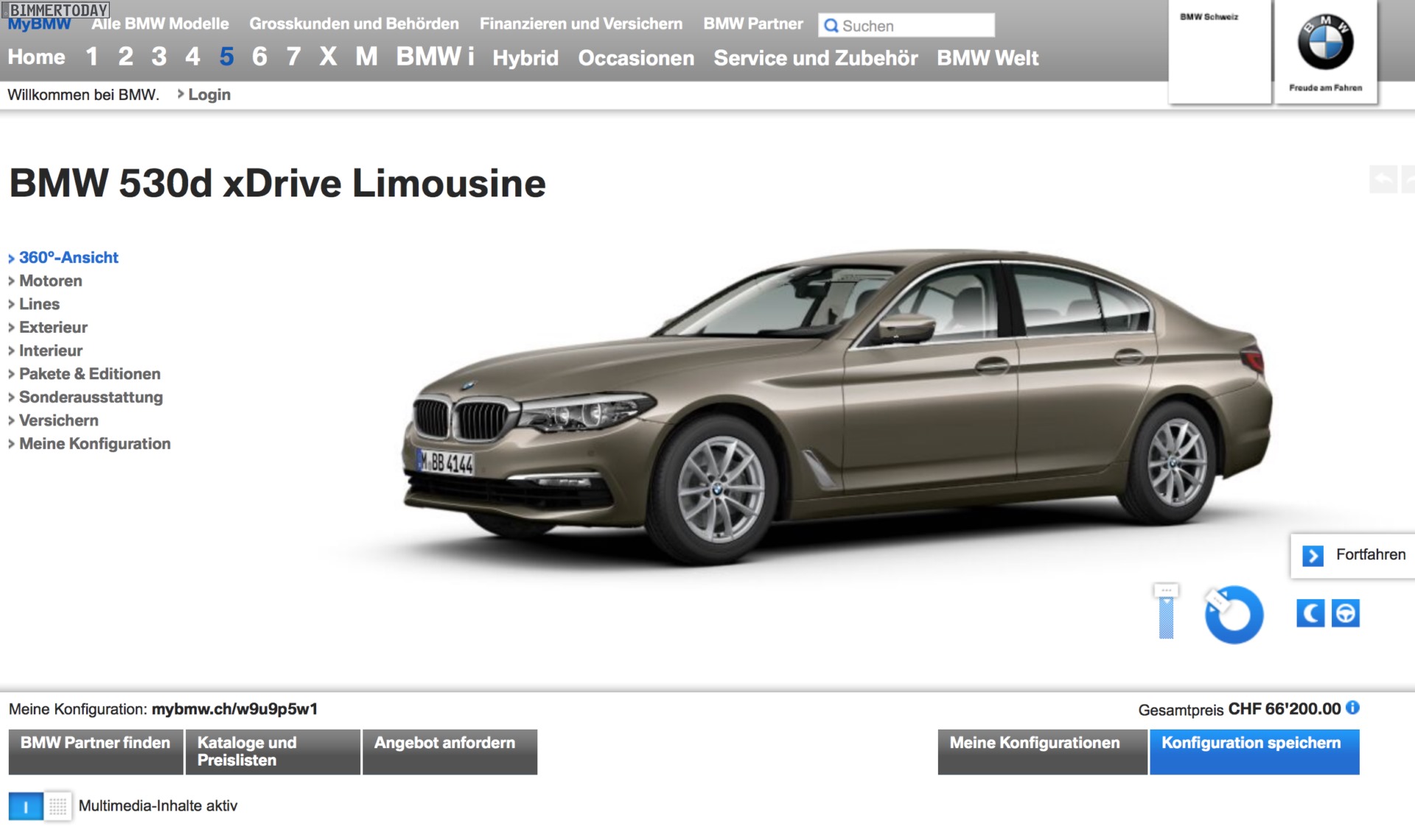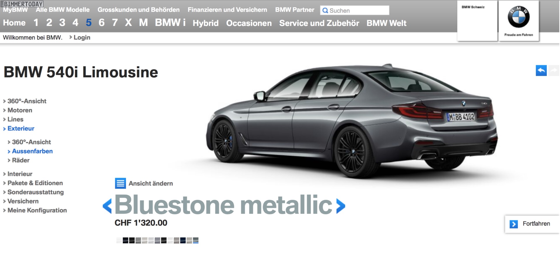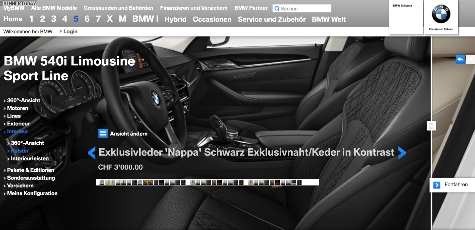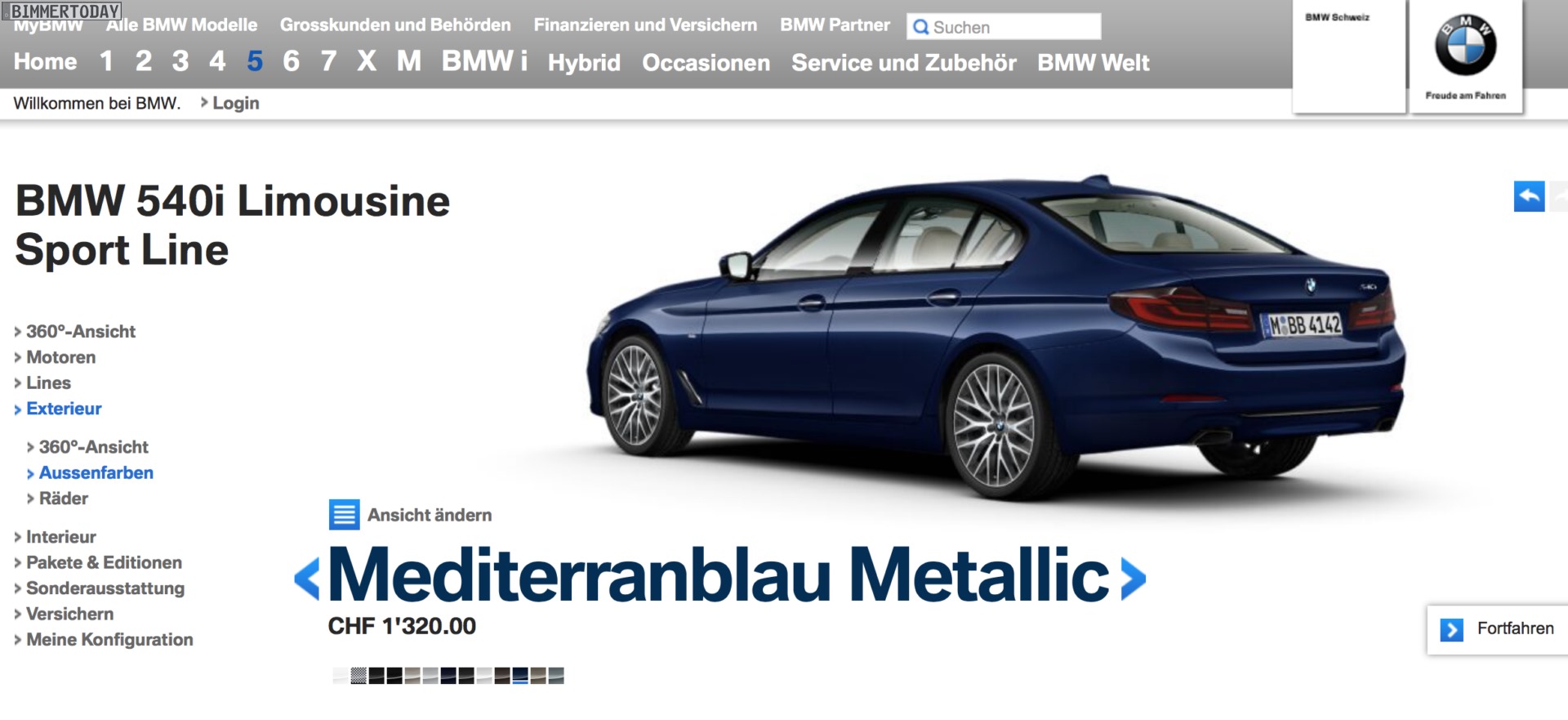 Der Konfigurator auf bmw.de lässt noch ein wenig auf sich warten, aber in der Schweiz kann man den neuen BMW 5er G30 schon jetzt problemlos konfigurieren. Auf bmw.ch wurde die siebte Generation der Business-Limousine bereits vollständig in den Online-Konfigurator eingepflegt und lässt sich nun nach Herzenslust den eigenen Vorstellungen und (Farb-) Wünschen anpassen. Zwar unterscheiden sich Preise und einige wenige Details vom deutschen Markt, mit Hilfe der G30-Preisliste lässt sich aber auch hier schnell Klarheit schaffen.