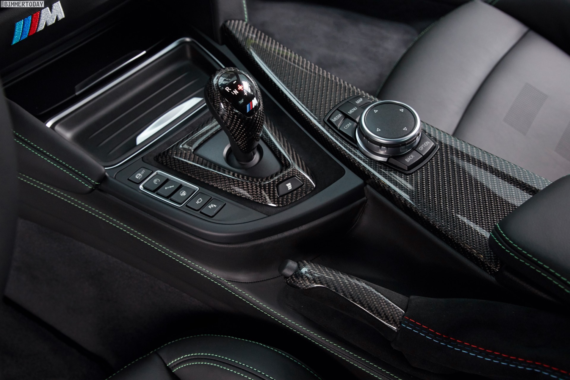 Die Individual-Lackierung in Java Grün wird auch im Innenraum wieder aufgegriffen und findet sich nicht nur an den Kontrastnähten von Sitzen, Türen und beledertem Armaturenbrett. Auch die Akzentleisten am Lenkrad, in den Türen und am unteren Rand der Carbon-Interieurleisten sind in Javagrün lackiert und machen den von Marco Wittmann konfigurierten M4 zu einem ganz besonderen Exemplar des Sportcoupés.