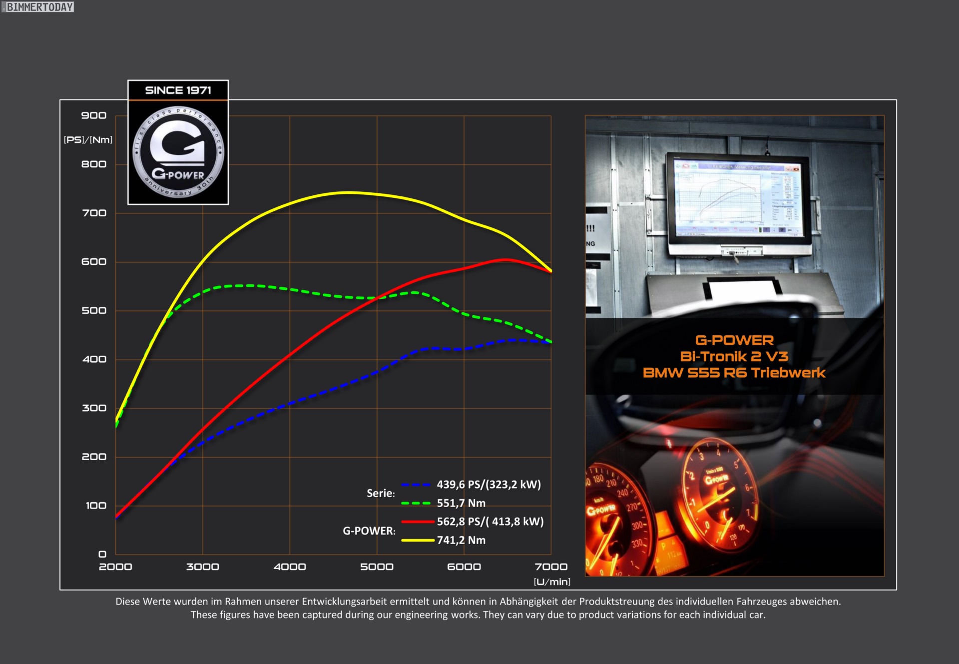 Welches Potenzial der Biturbo-Motor auch ohne Wassereinspritzung bietet, zeigt die Leistungssteigerung von G-Power: Mit Hilfe modifizierter Turbolader, Downpipes ohne Kats und einer Titan-Abgasanlage wird Hardware-seitig die Basis dafür geschaffen, was die Bi-Tronik 2 V3 vollendet. Die Kennfeld-Änderung erhöht die Motorleistung auf 600 PS, das maximale Drehmoment legt sogar noch stärker zu und wird von G-Power mit 740 Newtonmeter angegeben.