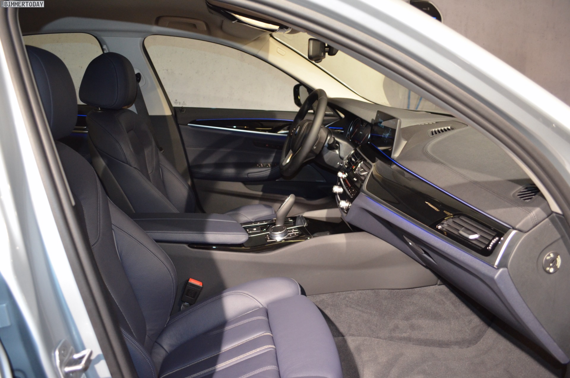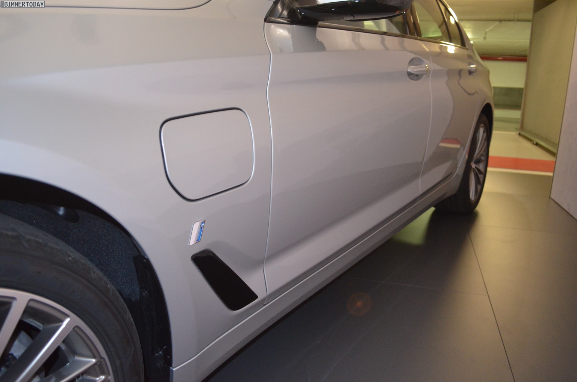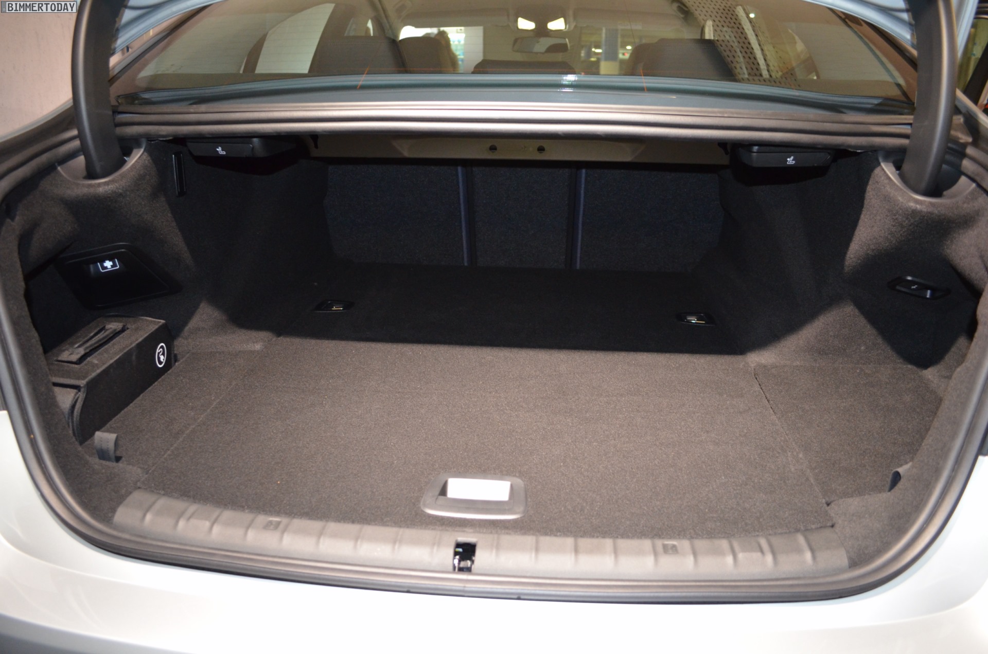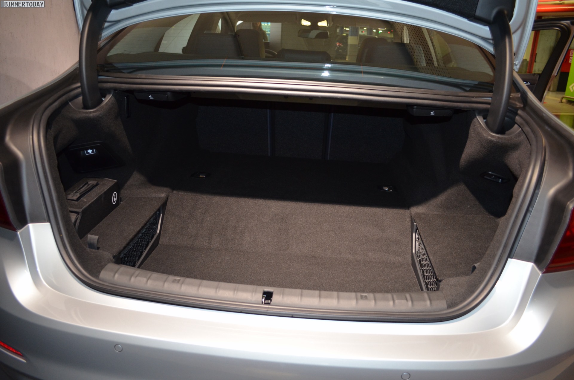 Zwar durften wir in Portugal noch nicht ans Steuer des BMW 530e, einige Fotos konnten wir aber bereits machen. Besonders spannend ist dabei ein Blick in den Kofferraum, denn dieser fällt etwas kleiner als den 5ern mit nur einem Motor und Kraftstofftank aus. Wie unsere Fotos zeigen, befindet sich im Kofferraum eine Stufe, die allerdings durch eine clevere Boden-Platte zu einer ebenen Fläche verändert werden kann – diese Ebene ist dann allerdings mehrere Zentimeter höher als bei den übrigen Varianten und sorgt für einen entsprechend reduzierten Stauraum.