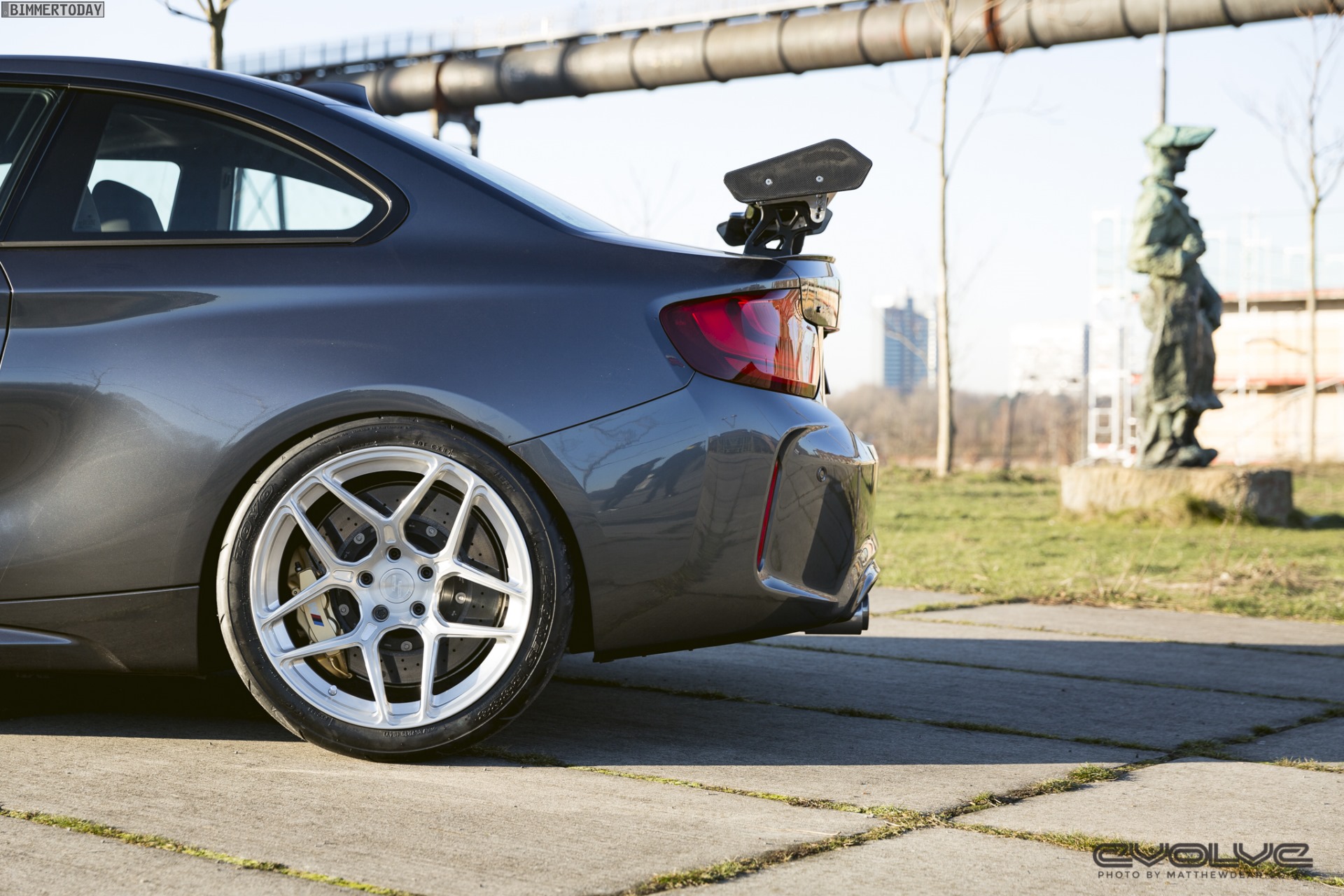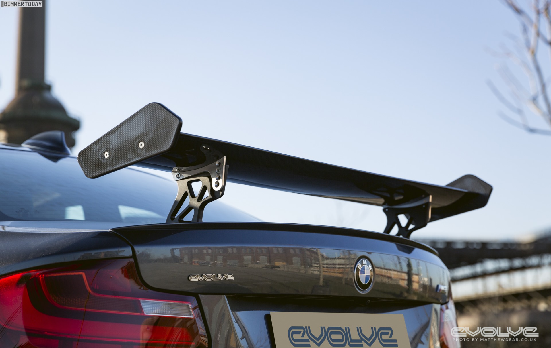 Zumindest auf den ersten Blick sind es dann aber doch Bauteile wie das Carbon-Dach, die Motorhaube im Stil des großen Vorbilds aus der M4-Familie und der einstellbare Heckflügel, die den BMW M2 GTS von Evolve Automotive klar von seinen serienmäßigen Brüdern abheben. Dach, Motorhaube und Heckflügel stammen aus dem Programm von Edison Composites, dazu kommen eine Frontlippe und ein Diffusor-Einsatz von RKP.