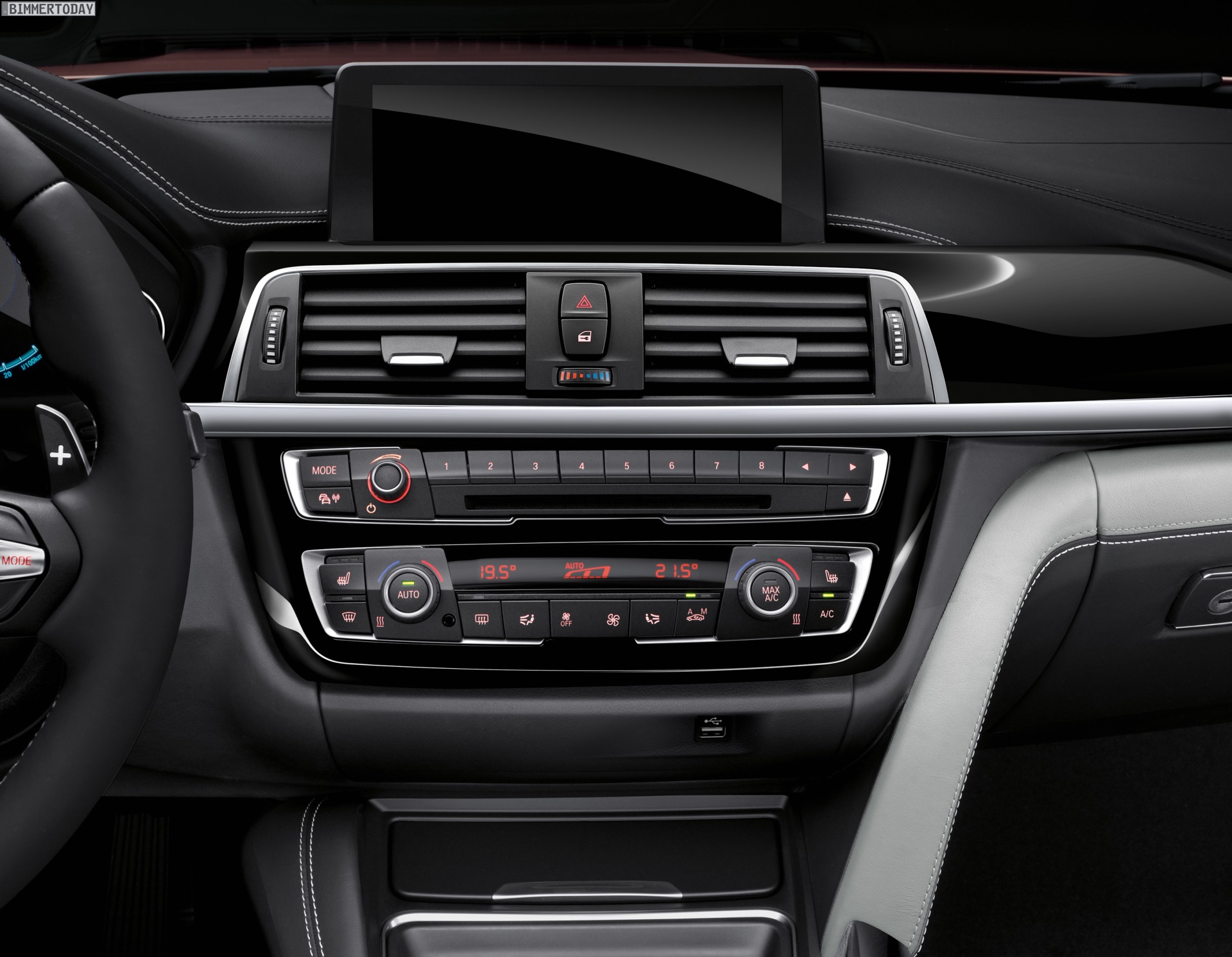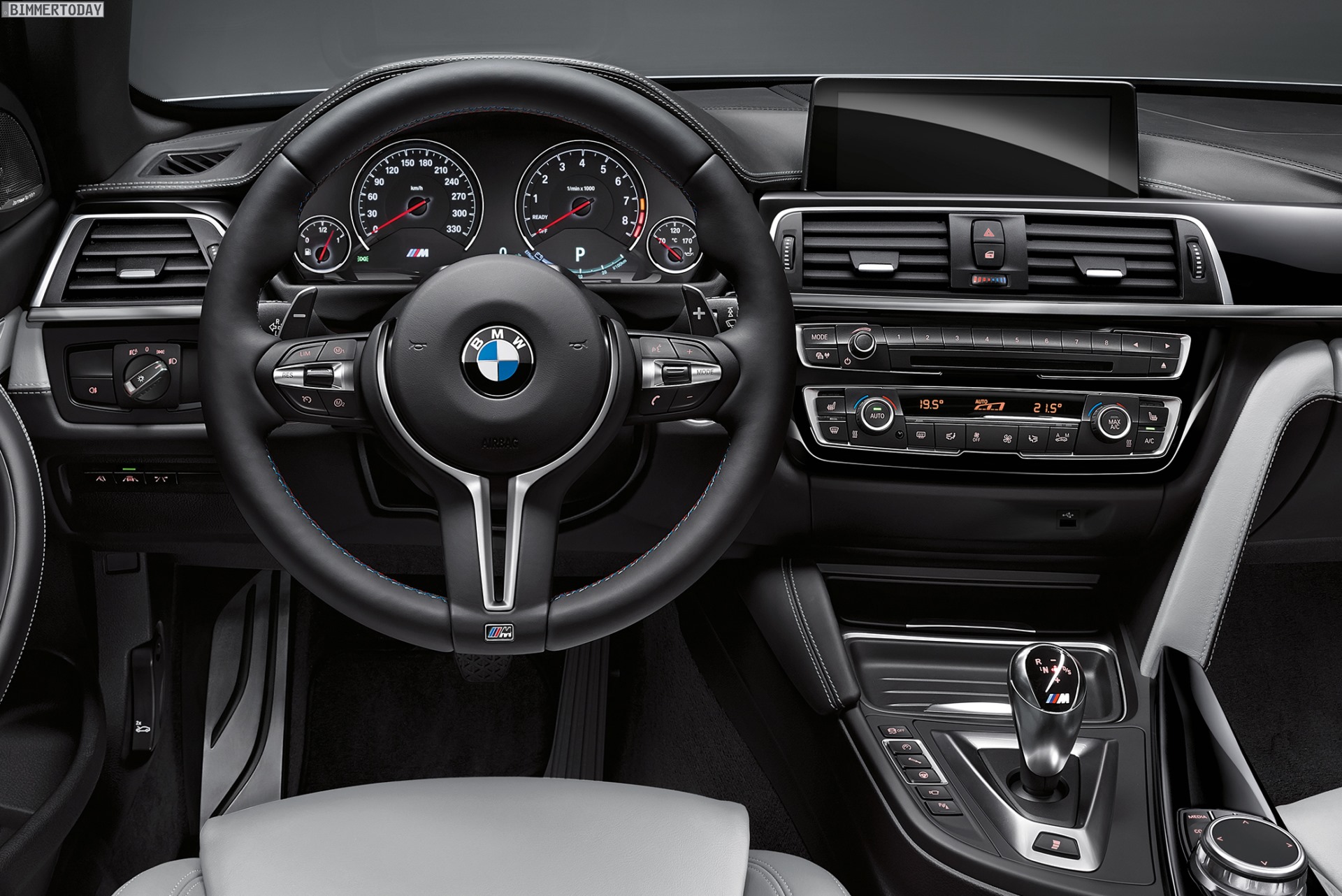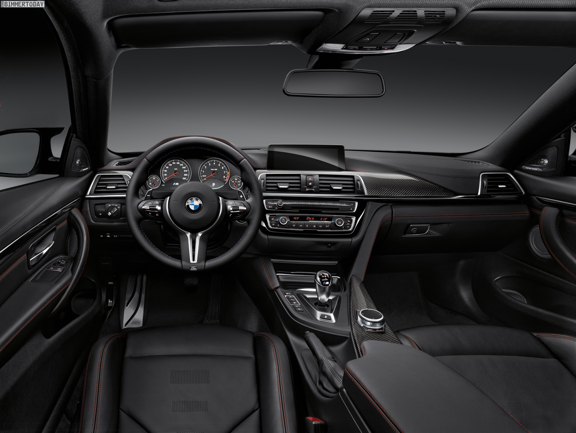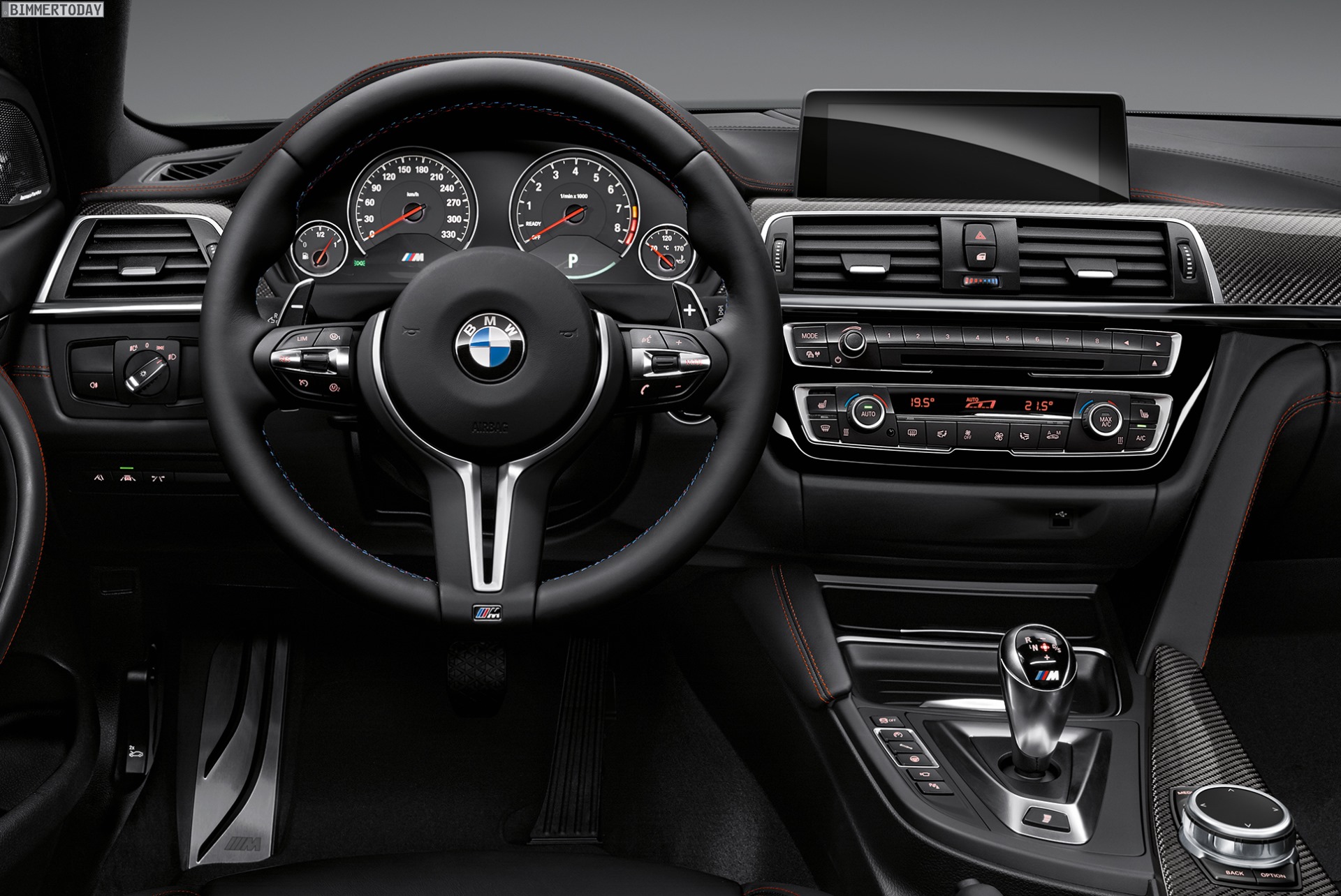 Im Innenraum bringt das BMW M4 Facelift 2017 ein überarbeitetes Design der beleuchteten M4-Logos in den Rückenlehnen der Sportsitze mit sich, außerdem sorgen Details wie kleinere Galvanik-Elemente und eine doppelte Ziernaht auf dem Instrumententräger für einen noch etwas edleren Eindruck. Das Navigationspaket ConnectedDrive mit iDrive in Kachel-Optik und Features vom WLAN-Hotspot bis zum induktiven Laden von entsprechend ausgerüsteten Smartphones kommt ebenfalls serienmäßig zum Einsatz.