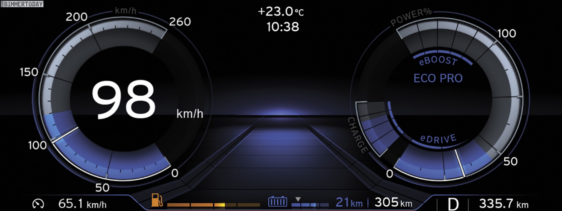 Beinahe umgekehrt verhält sich das multifunktionale Instrumentendisplay im Modus Eco Pro. Beruhigendes Blau und ein auf Geschwindigkeiten bis 120 km/h fokussierter Tacho unterstützen den Fahrer gemeinsam mit Hinweisen zur aktuellen Rekuperationsleistung bei einer möglichst sparsamen Fahrweise.