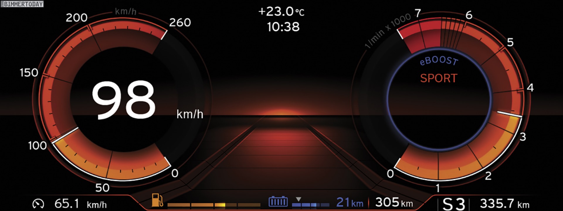 Wechselt der Fahrer in den Sport-Modus, wechselt auch die Anzeige in ein von roten Farben dominiertes Programm. Die Geschwindigkeit wird nun besonders groß als schnell ablesbare Zahl angezeigt, im rechten Bereich lassen sich Gang und Drehzahl blitzschnell ablesen – im Fokus stehen unübersehbar jene Informationen, die für eine besonders sportliche Fahrweise von Interesse sind. Weitere Details wie der Verbrauch rücken klar in den Hintergrund.
