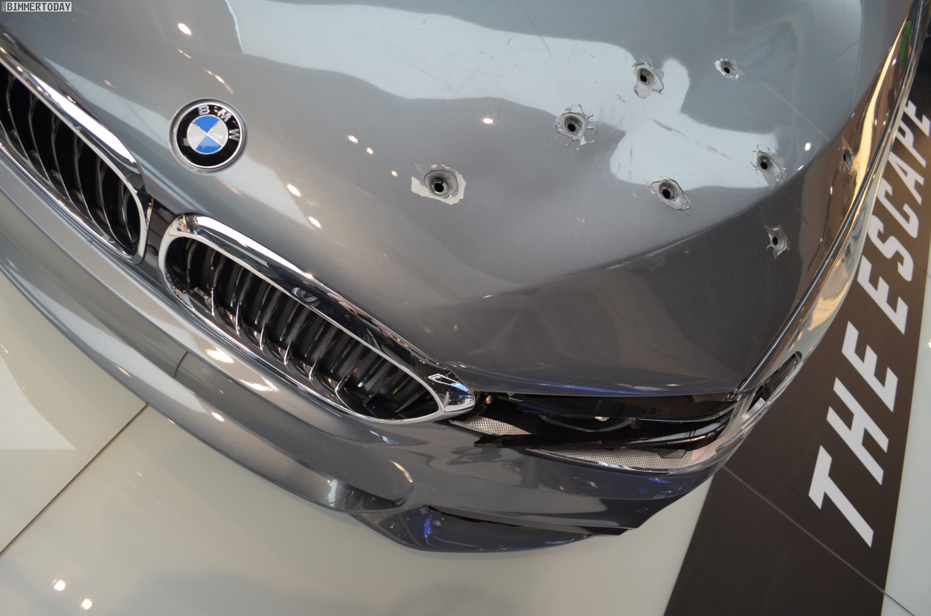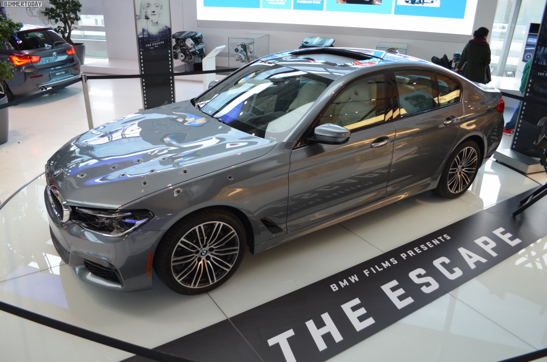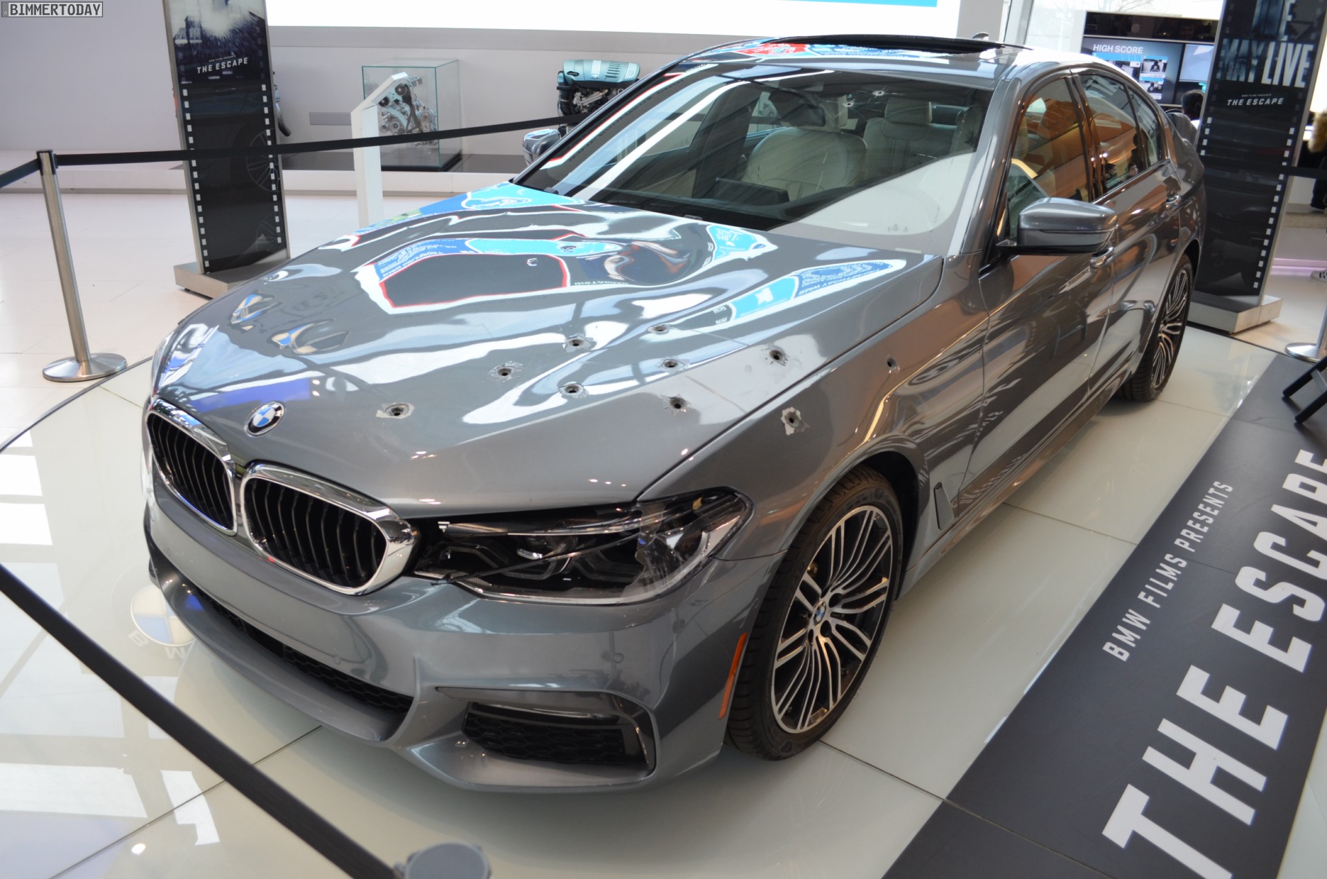 Mit heftigen ‘Schusswunden’ in Motorhaube, Scheinwerfer und vorderem linken Kotflügel kann der neue BMW 5er G30 derzeit in der BMW Welt München bestaunt werden. Die bei den Dreharbeiten zum jüngsten BMW-Film “The Escape” genutzte Limousine trägt unübersehbare Kampfspuren und musste bereits einiges einstecken, verdient aber auch gerade deshalb einen genaueren Blick.