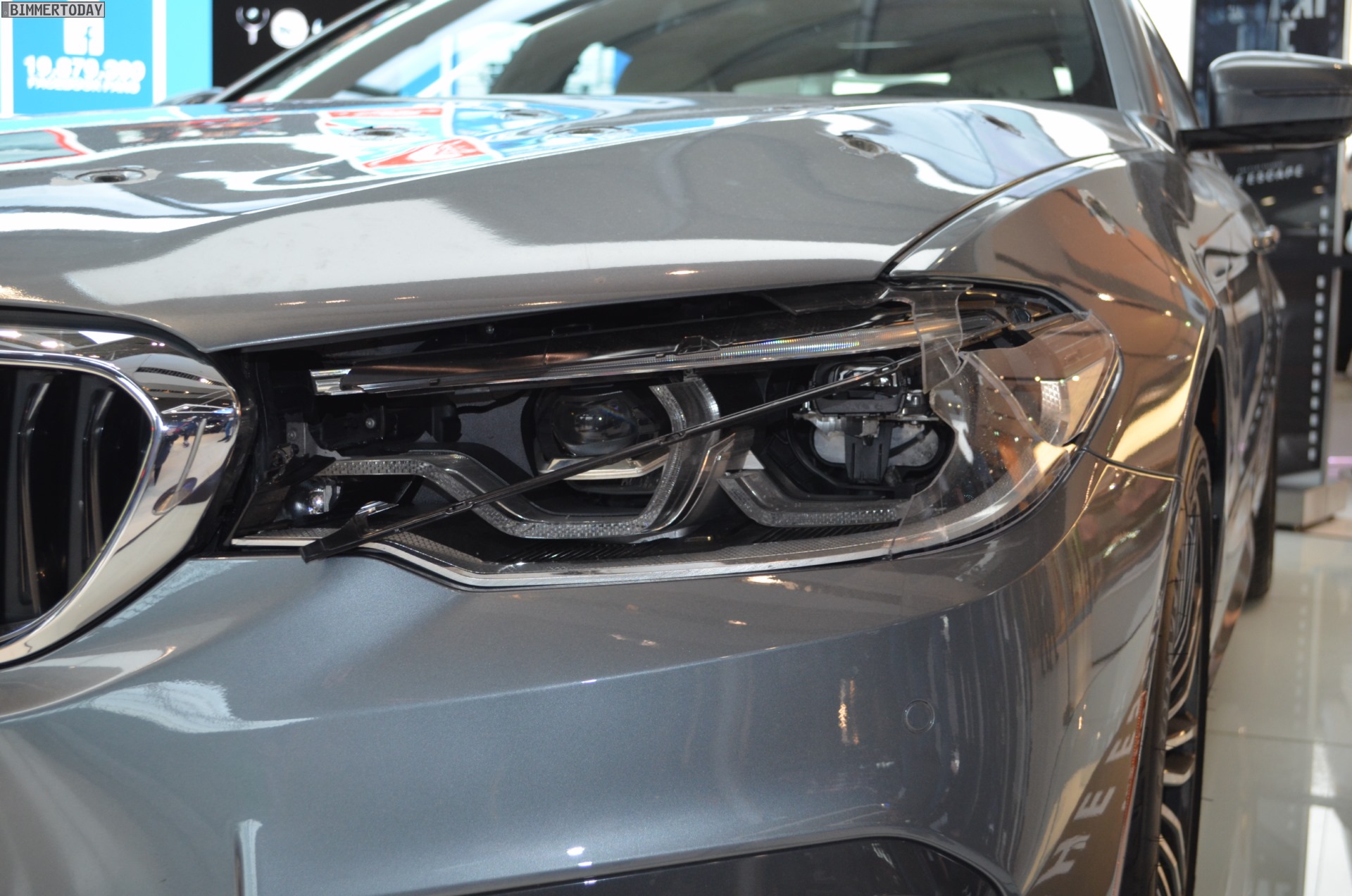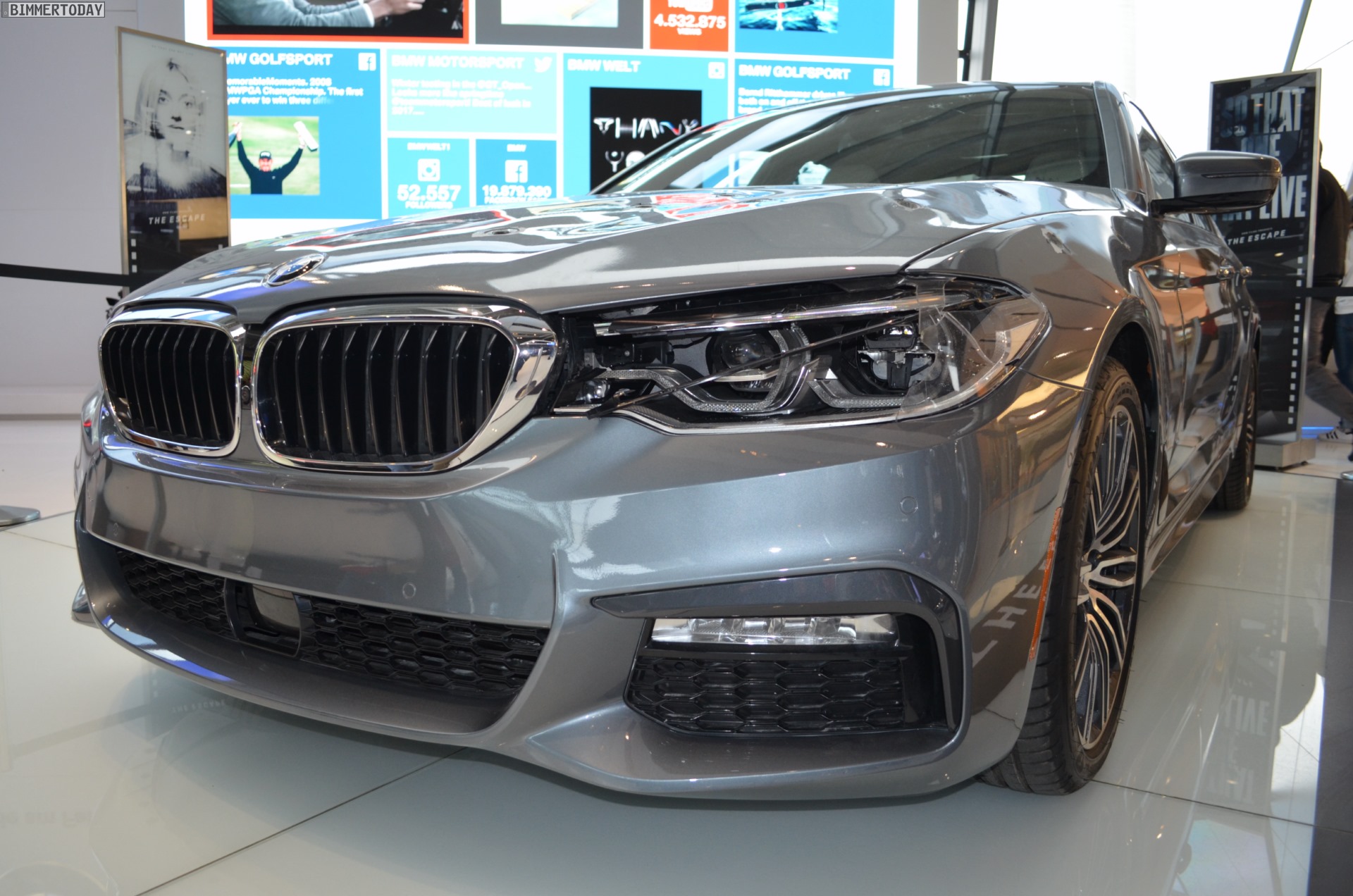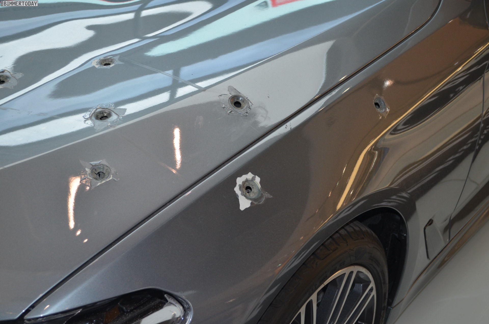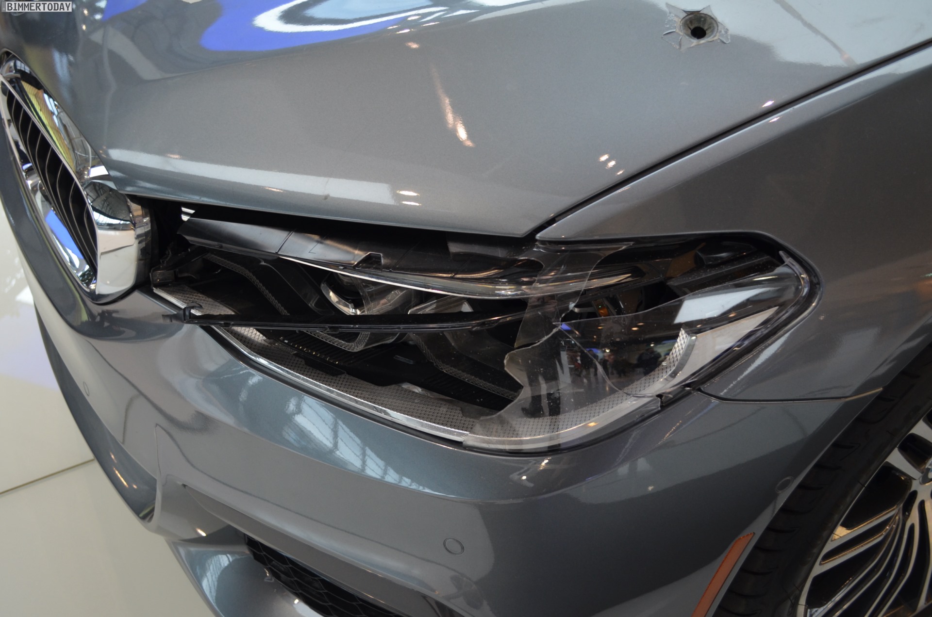 Mit heftigen ‘Schusswunden’ in Motorhaube, Scheinwerfer und vorderem linken Kotflügel kann der neue BMW 5er G30 derzeit in der BMW Welt München bestaunt werden. Die bei den Dreharbeiten zum jüngsten BMW-Film “The Escape” genutzte Limousine trägt unübersehbare Kampfspuren und musste bereits einiges einstecken, verdient aber auch gerade deshalb einen genaueren Blick.