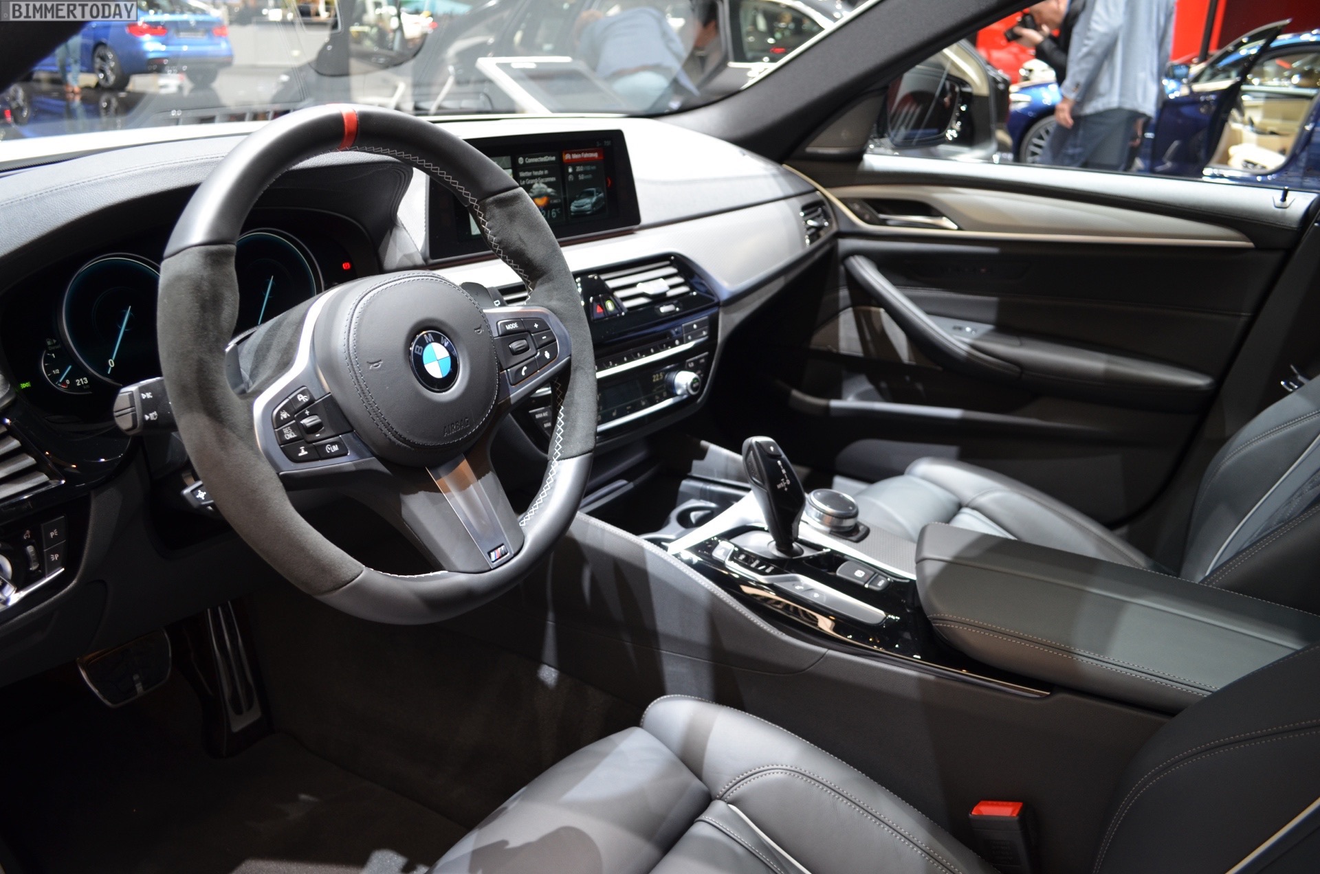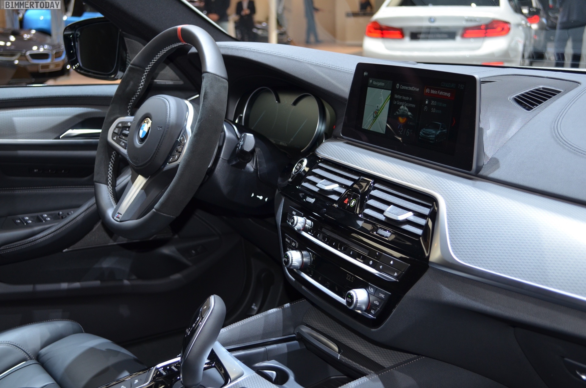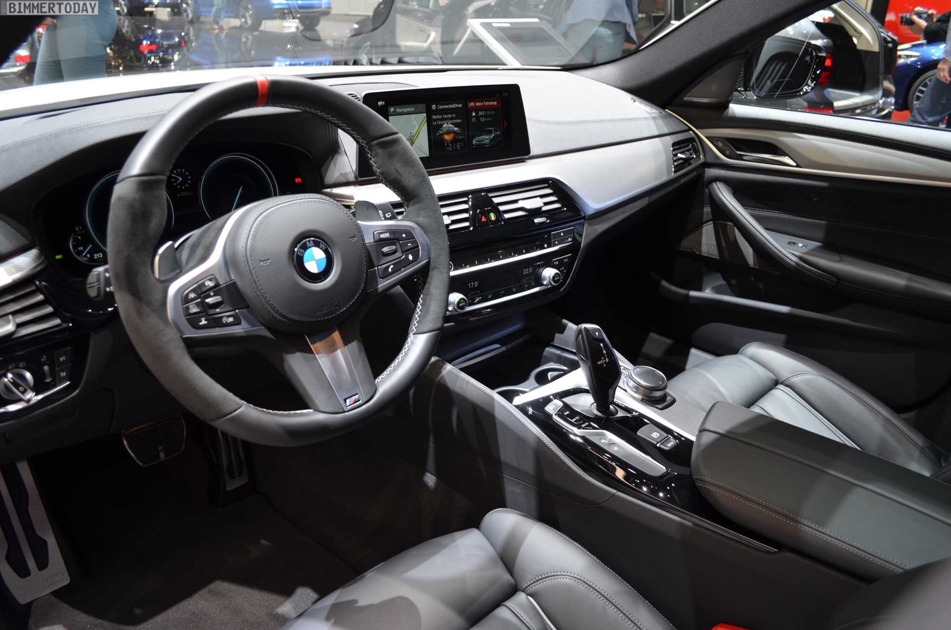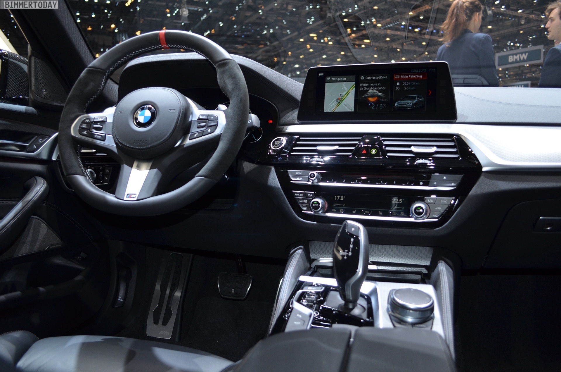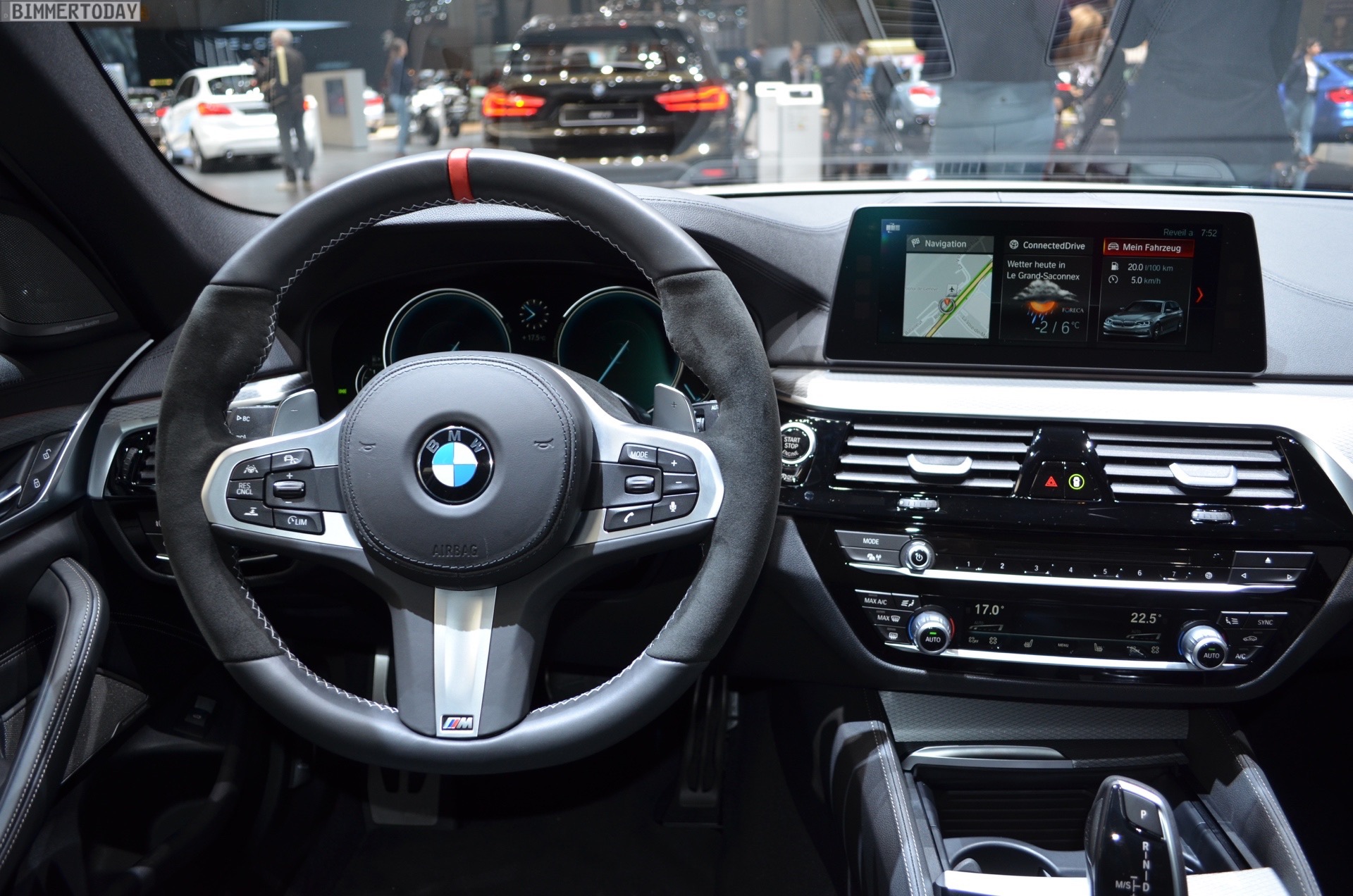 Sportlich veredelt präsentiert sich auch das Interieur des ersten 5er Touring G31 mit Tuning-Teilen. Im Fokus steht dabei das BMW M Performance Sportlenkrad mit Lenkradkranz in Alcantara und roter 12-Uhr-Markierung. Selbstverständlich wird das Lenkrad bei allen Fahrzeugen mit Achtgang-Sportautomatik mit Schaltwippen kombiniert und strahlt so noch mehr Motorsport-Flair aus. Wie das Gesamtpaket wirkt, zeigen unsere Live-Fotos aus Genf: