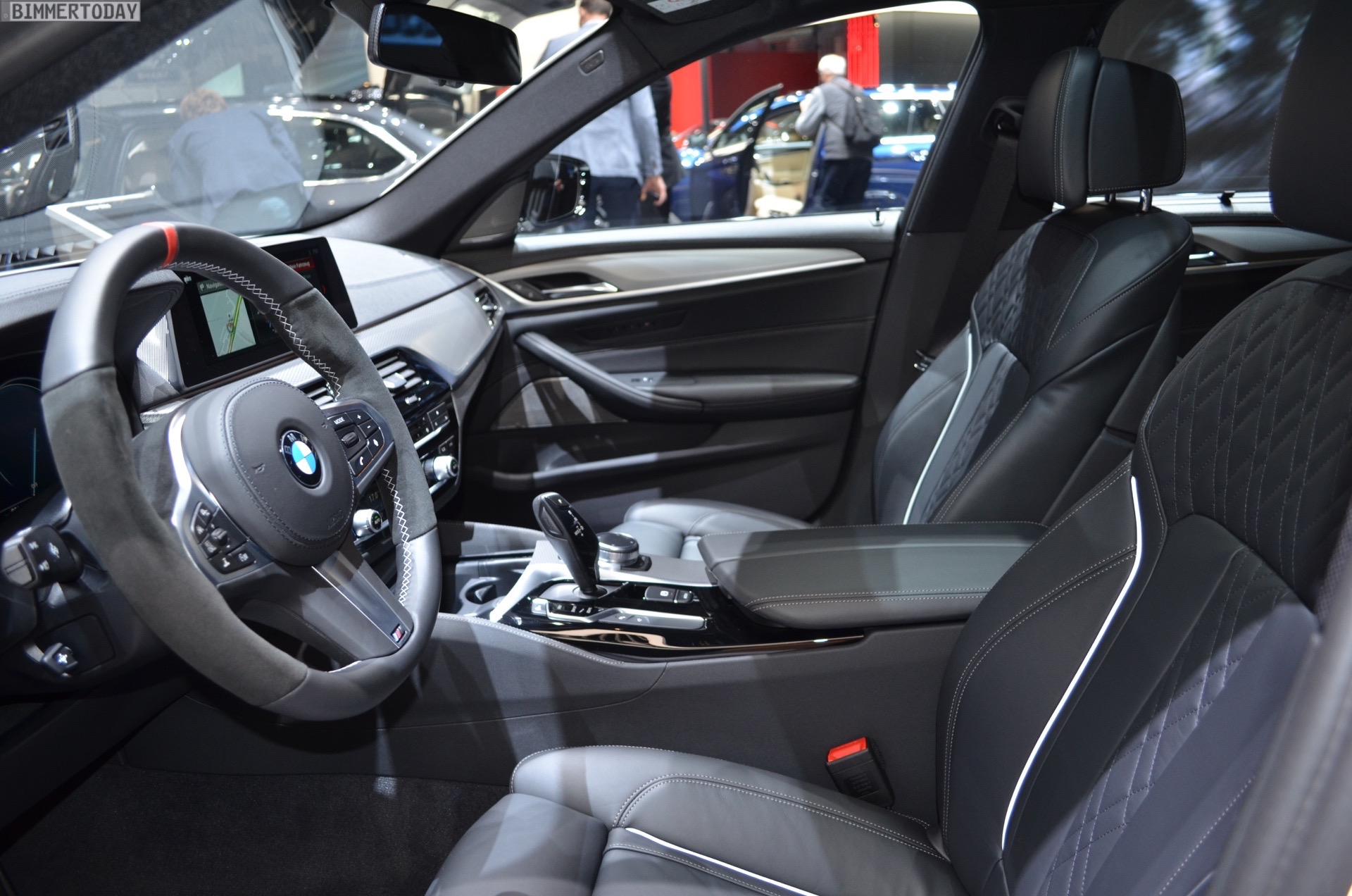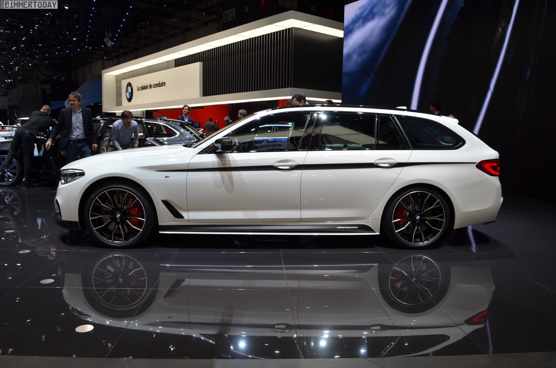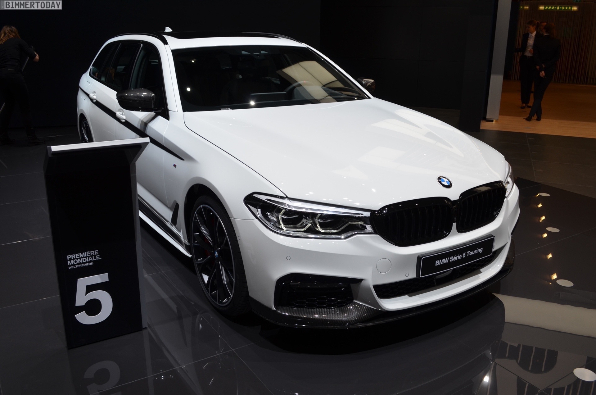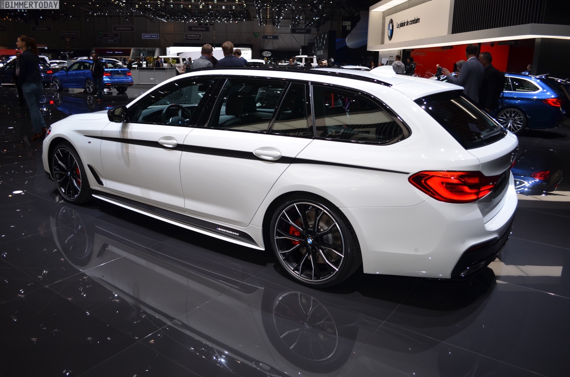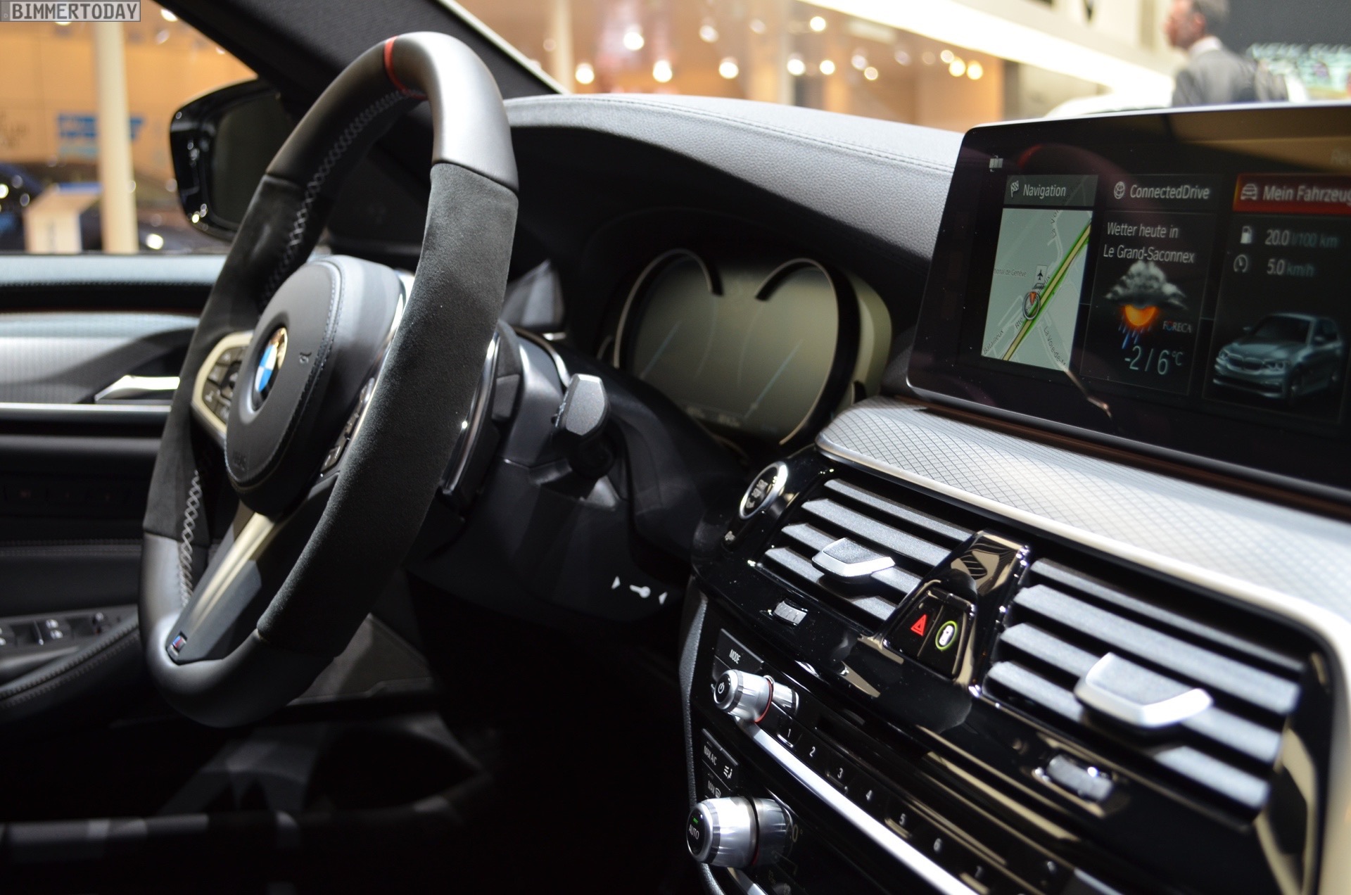 Sportlich veredelt präsentiert sich auch das Interieur des ersten 5er Touring G31 mit Tuning-Teilen. Im Fokus steht dabei das BMW M Performance Sportlenkrad mit Lenkradkranz in Alcantara und roter 12-Uhr-Markierung. Selbstverständlich wird das Lenkrad bei allen Fahrzeugen mit Achtgang-Sportautomatik mit Schaltwippen kombiniert und strahlt so noch mehr Motorsport-Flair aus. Wie das Gesamtpaket wirkt, zeigen unsere Live-Fotos aus Genf: