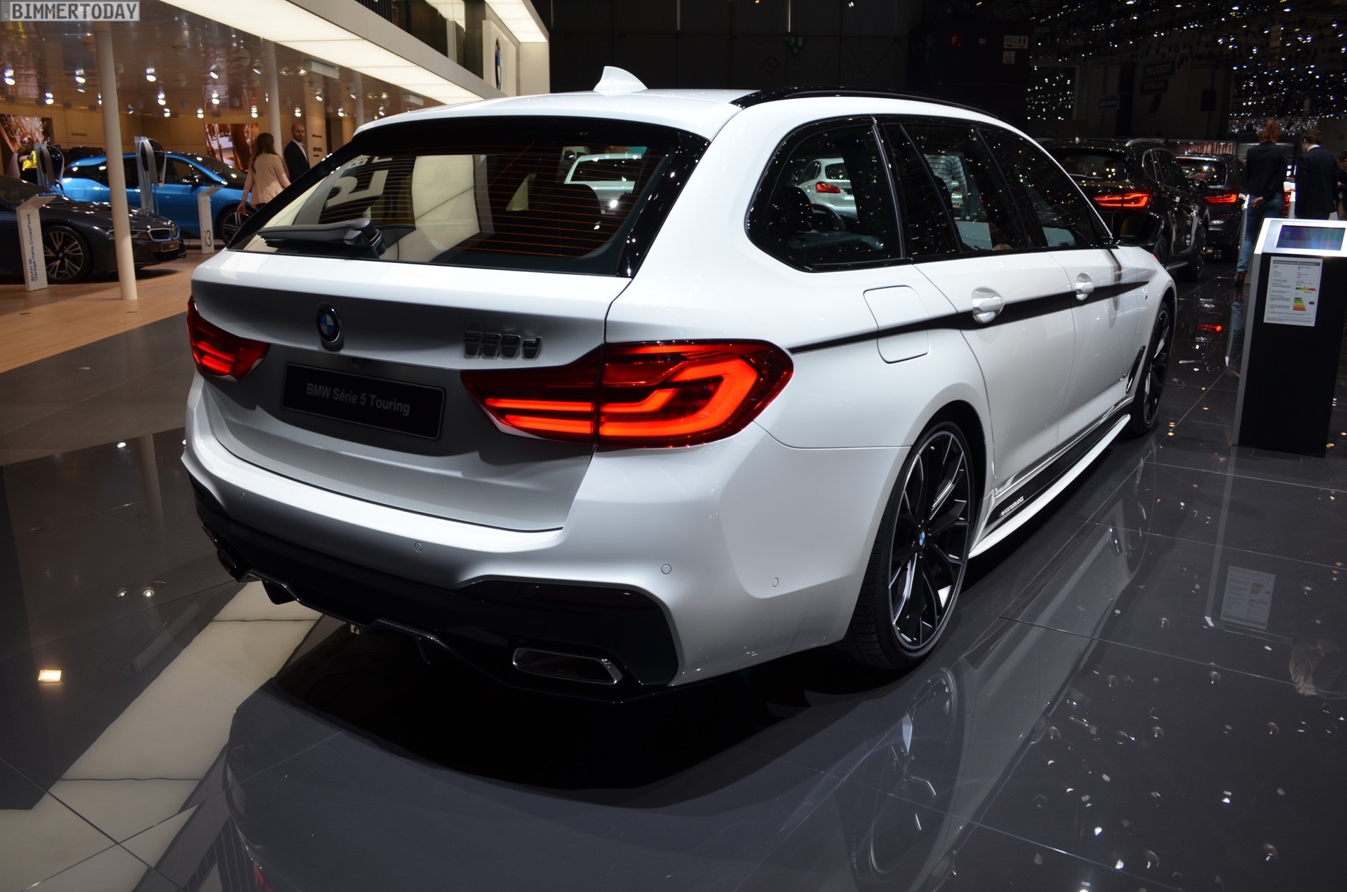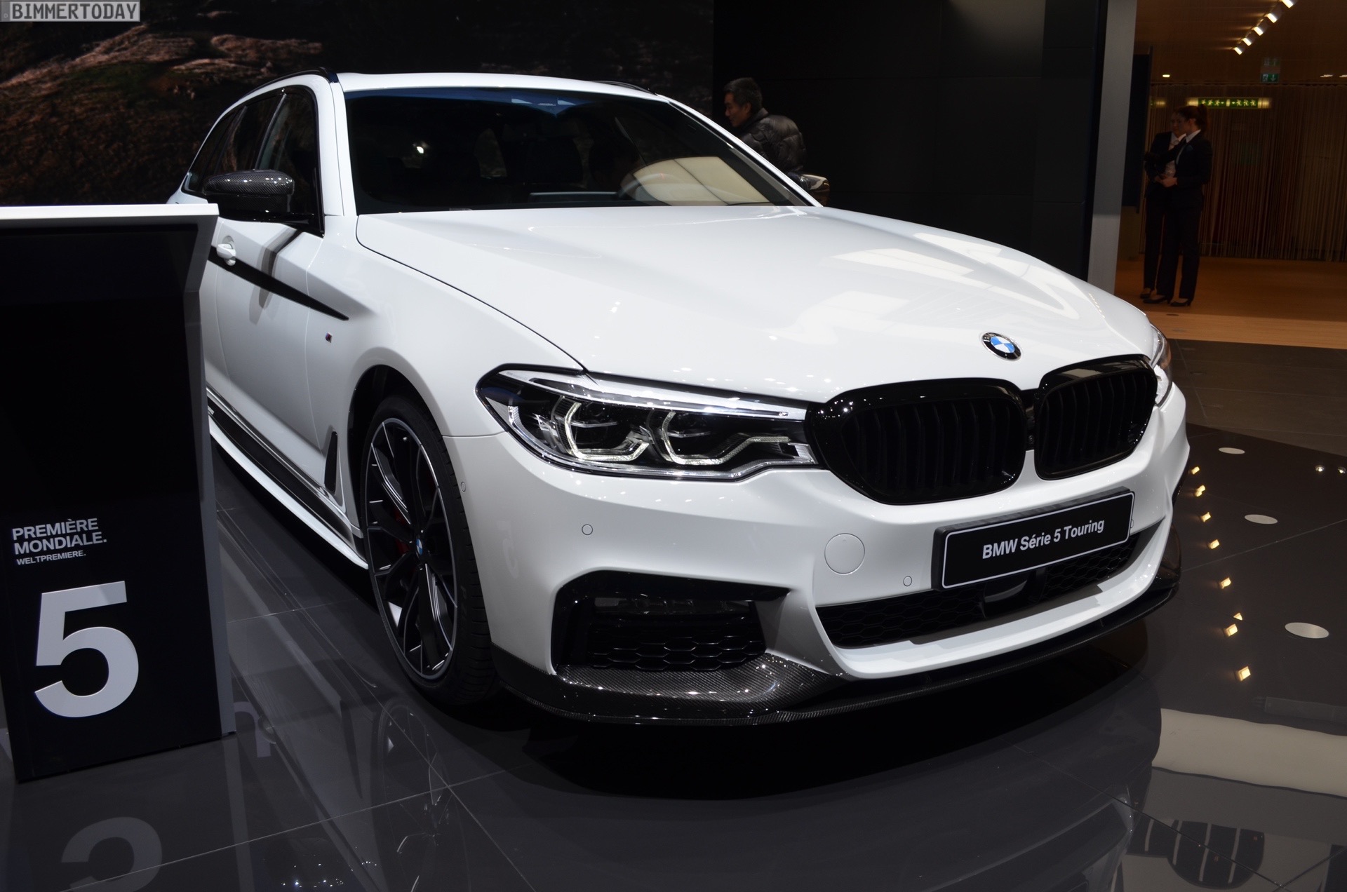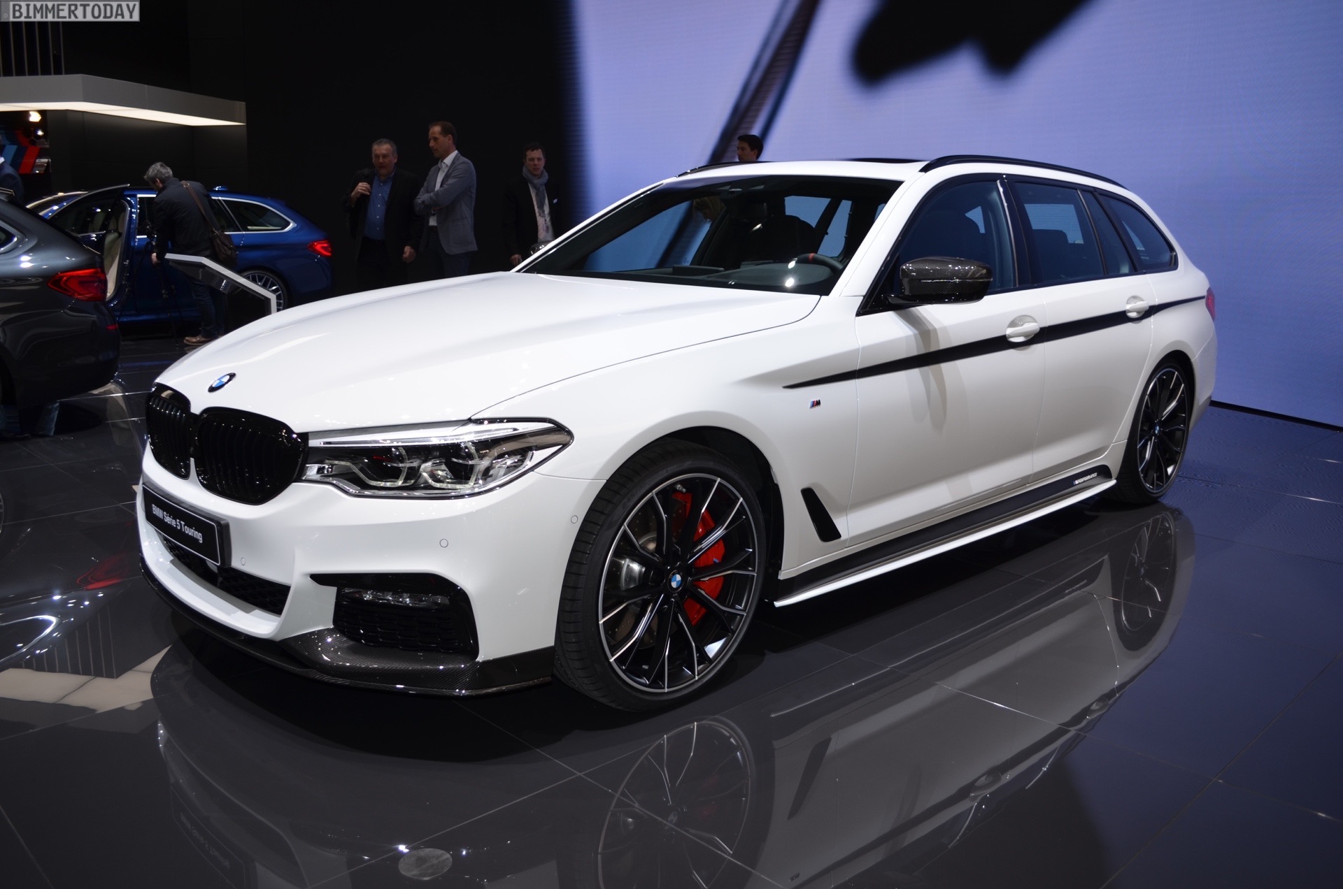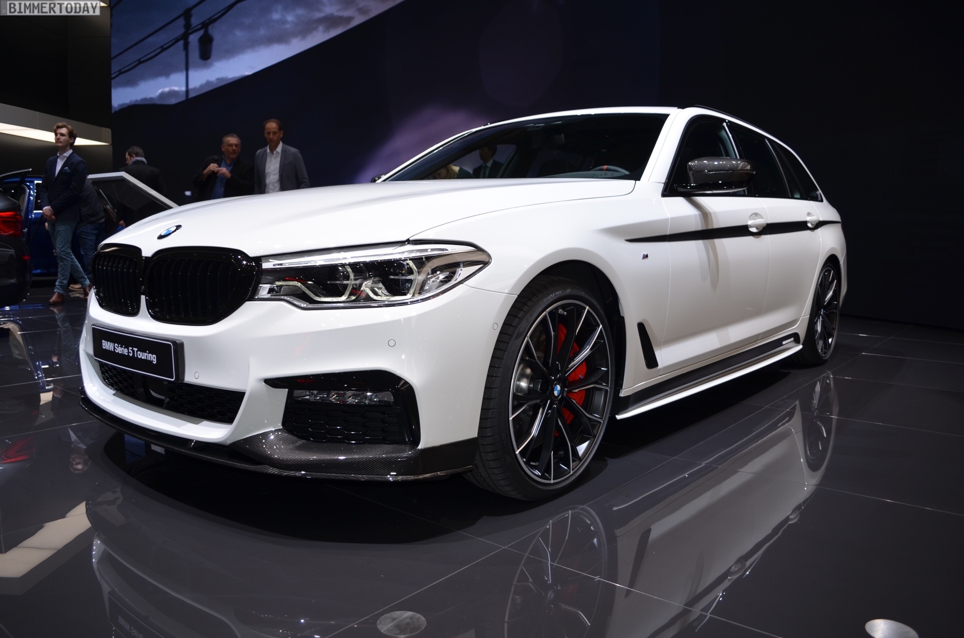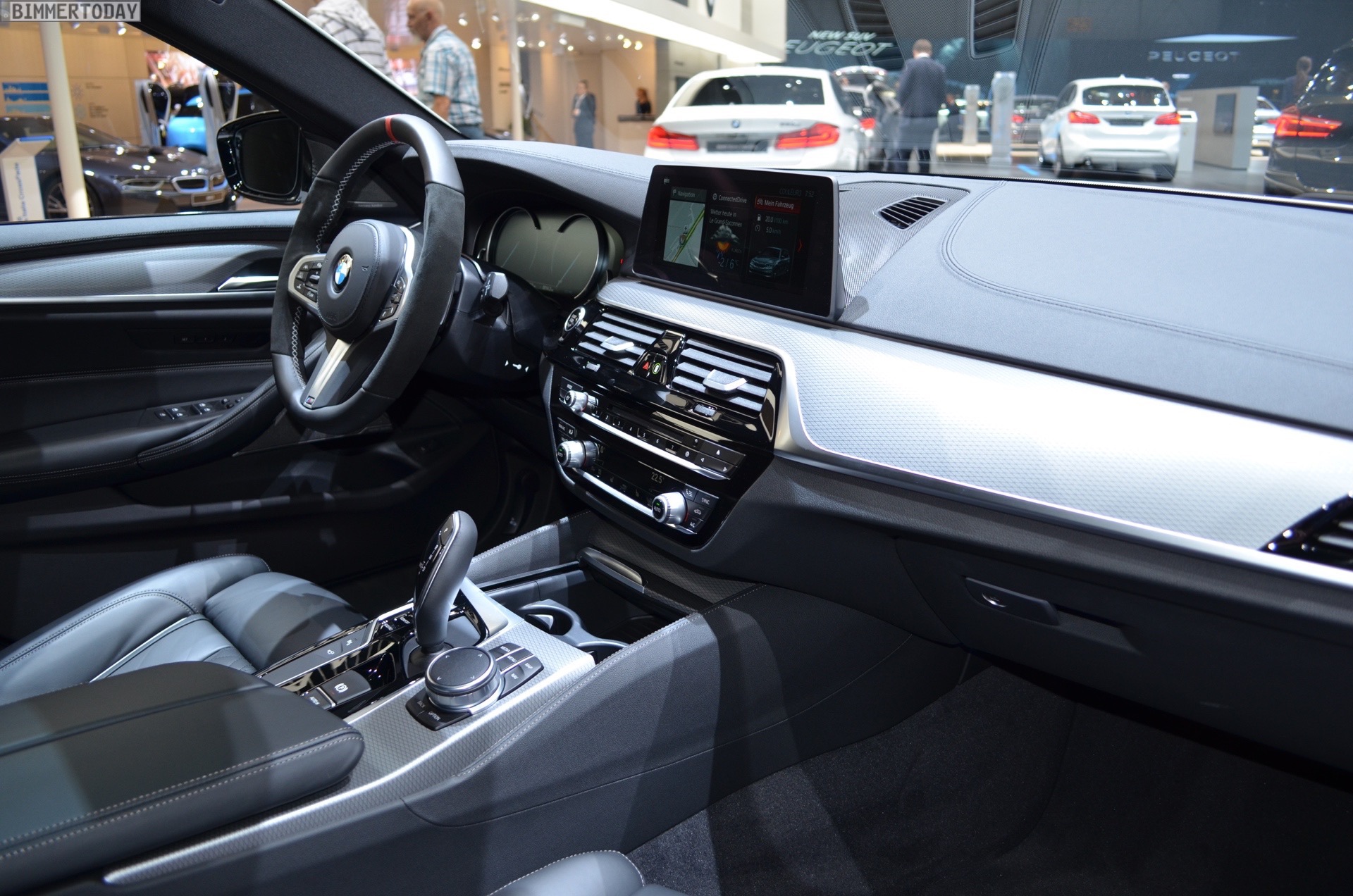 Sportlich veredelt präsentiert sich auch das Interieur des ersten 5er Touring G31 mit Tuning-Teilen. Im Fokus steht dabei das BMW M Performance Sportlenkrad mit Lenkradkranz in Alcantara und roter 12-Uhr-Markierung. Selbstverständlich wird das Lenkrad bei allen Fahrzeugen mit Achtgang-Sportautomatik mit Schaltwippen kombiniert und strahlt so noch mehr Motorsport-Flair aus. Wie das Gesamtpaket wirkt, zeigen unsere Live-Fotos aus Genf: