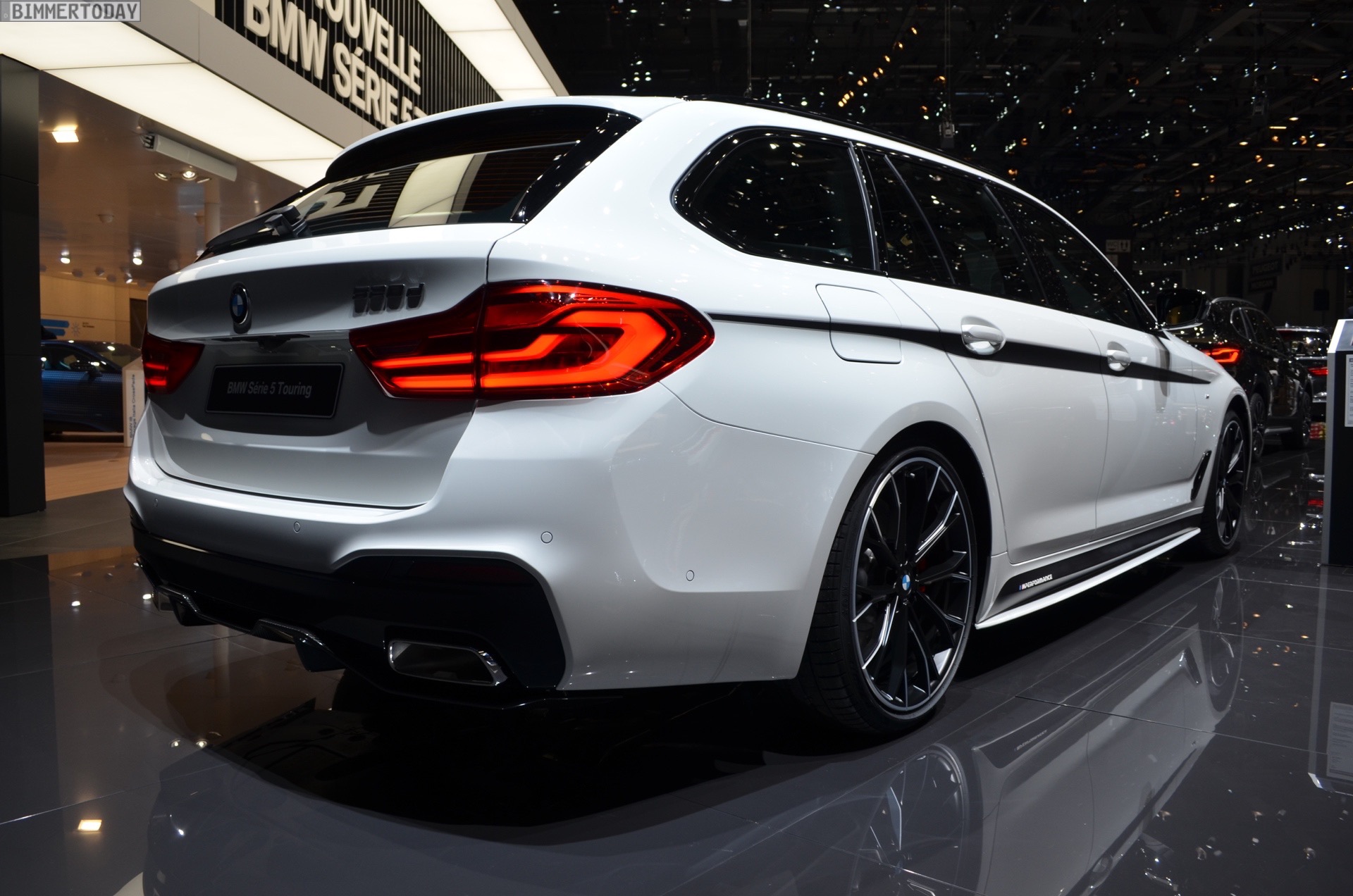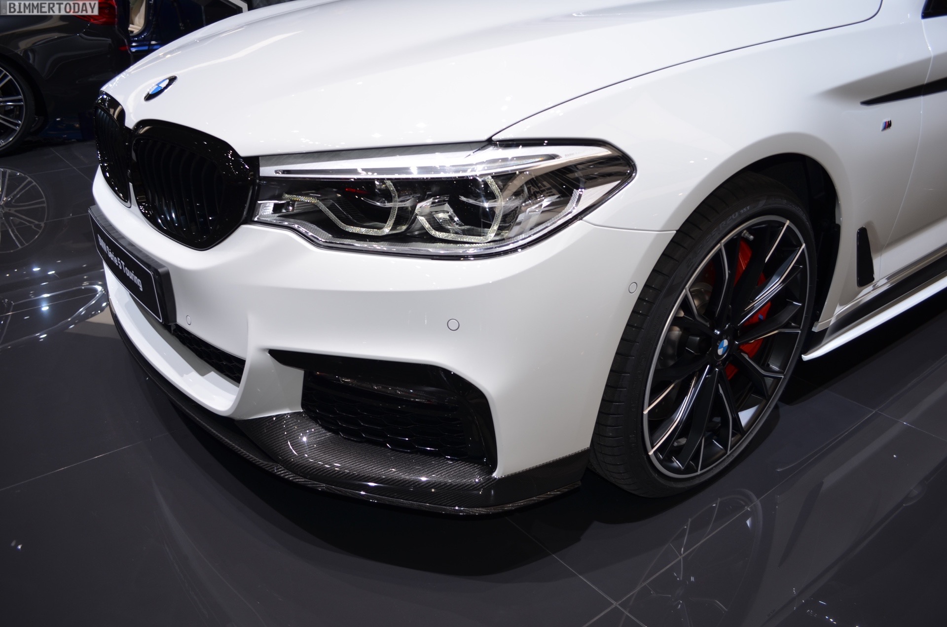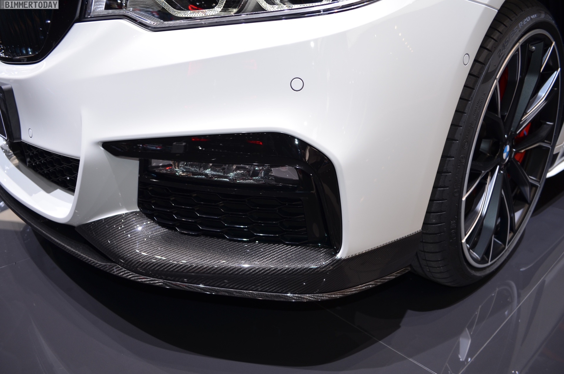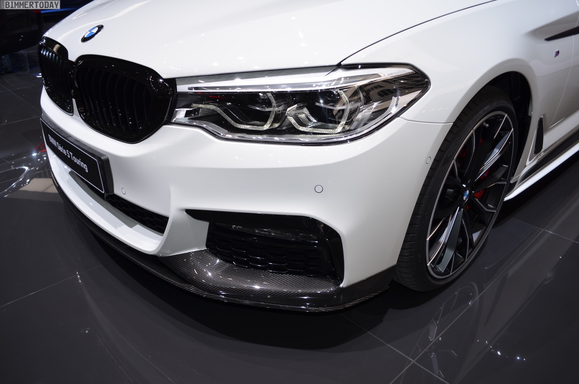 Der echte Hingucker bei der Weltpremiere auf dem Genfer Autosalon 2017 sind aber natürlich die Aerodynamik-Teile für den BMW 5er G31. Aufsätze für die Frontschürze, ein zweiteiliger Diffusor-Einsatz für die Heckschürze sowie mattschwarze Seitenschweller-Aufsätze. Sowohl die Seitenschweller als auch ein Teil der Heckschürzen-Einsätze können auf Wunsch in jeder vom Kunden gewünschten Farben lackiert werden, was zusätzlichen Spielraum zur Individualisierung schafft und uns in den nächsten Jahren so manchen interessanten Anblick bescheren dürfte – beispielsweise in Form von Details am Familien-Kombi, die die gleiche Farbe wie der Roadster fürs Wochenende tragen. Schwarze Nieren und Außenspiegel-Kappen aus Carbon runden den M Performance-Look der Karosserie gemeinsam mit den Zierstreifen sportlich ab.