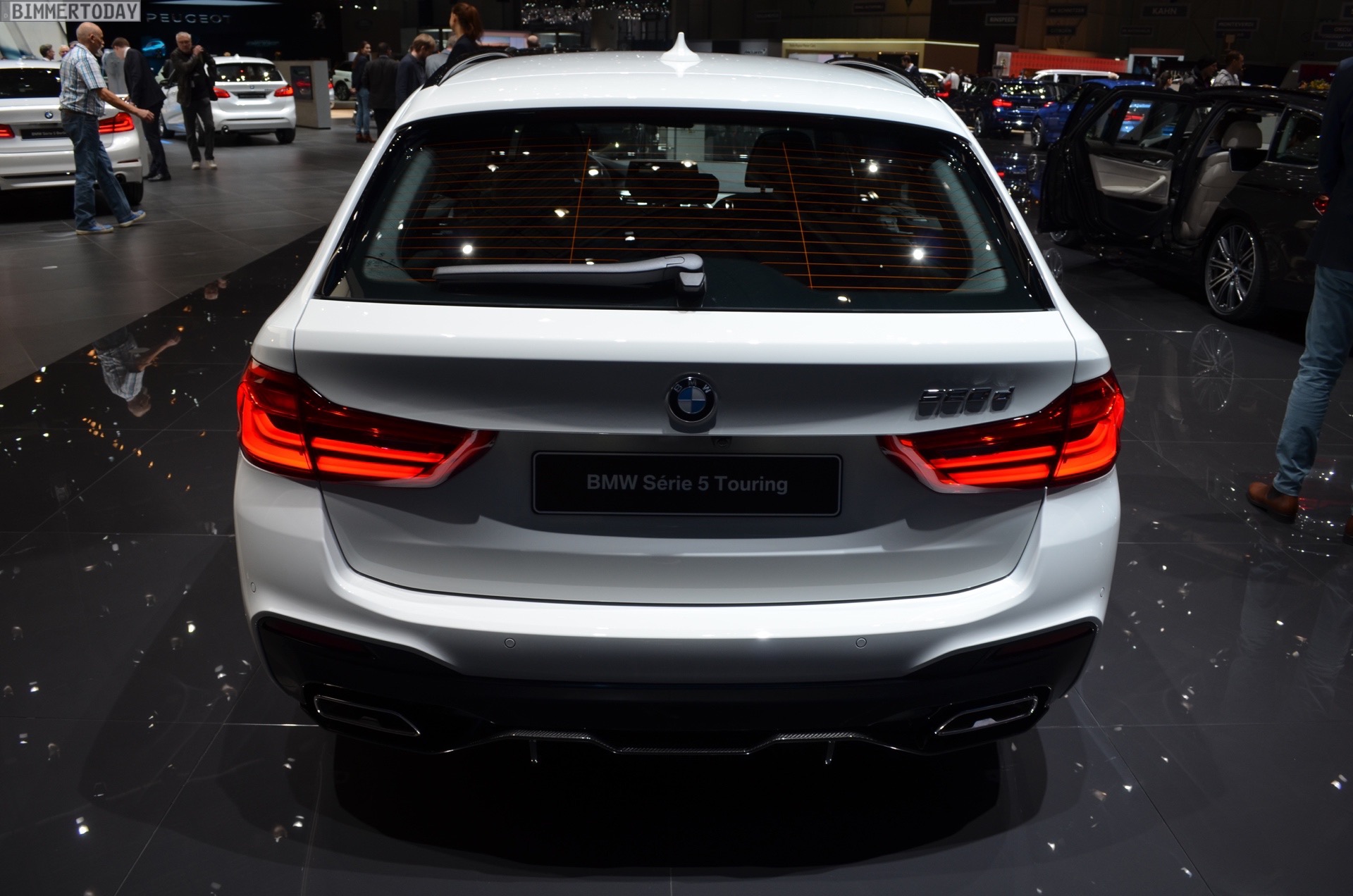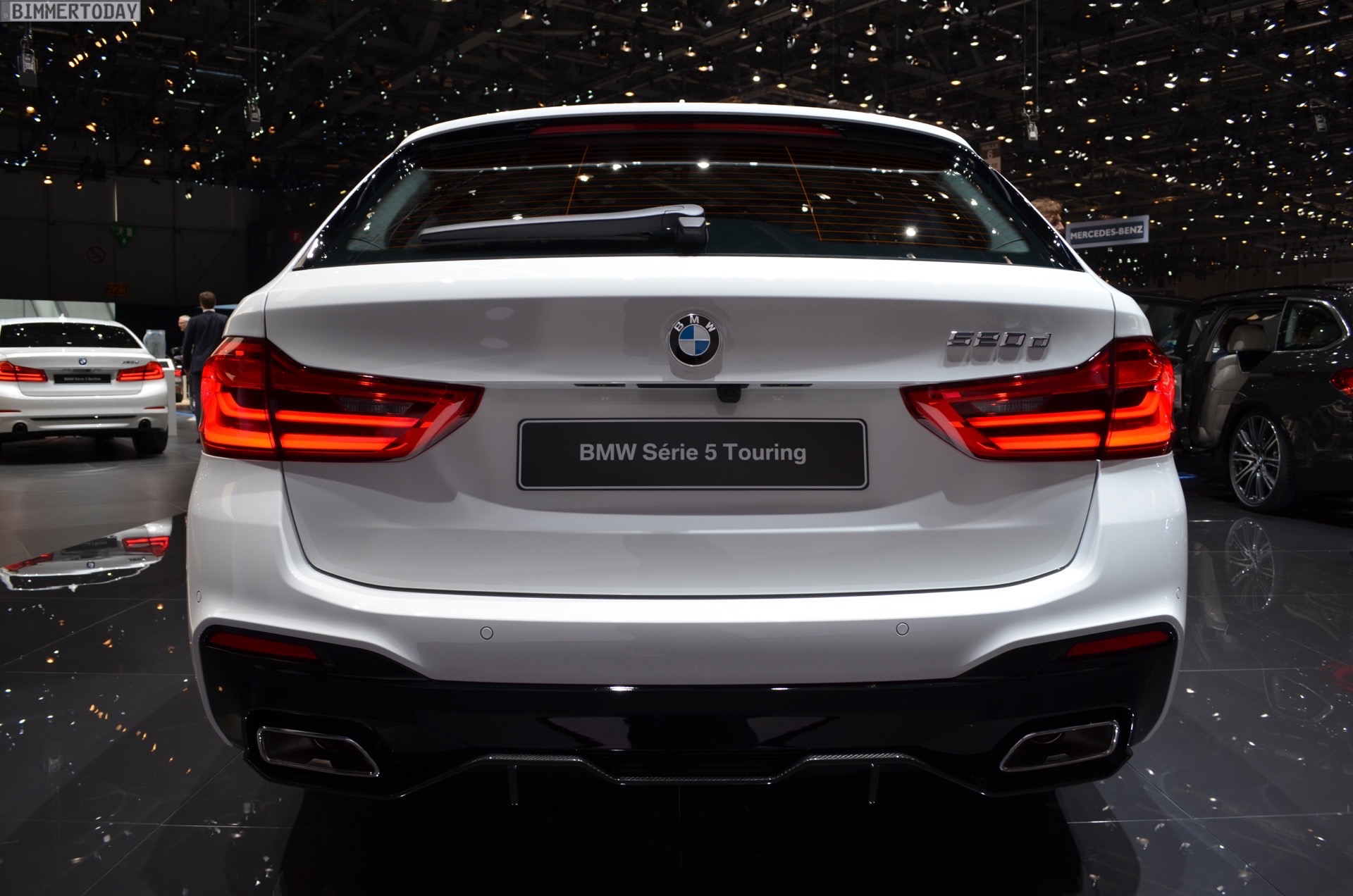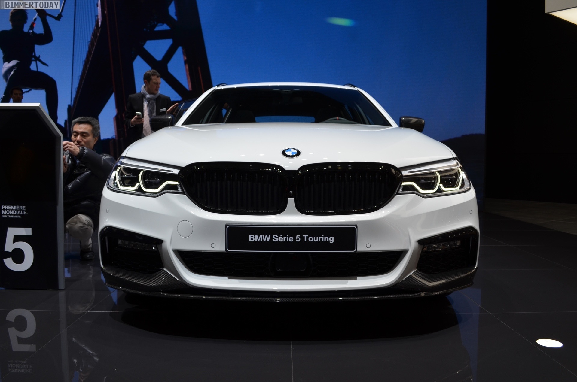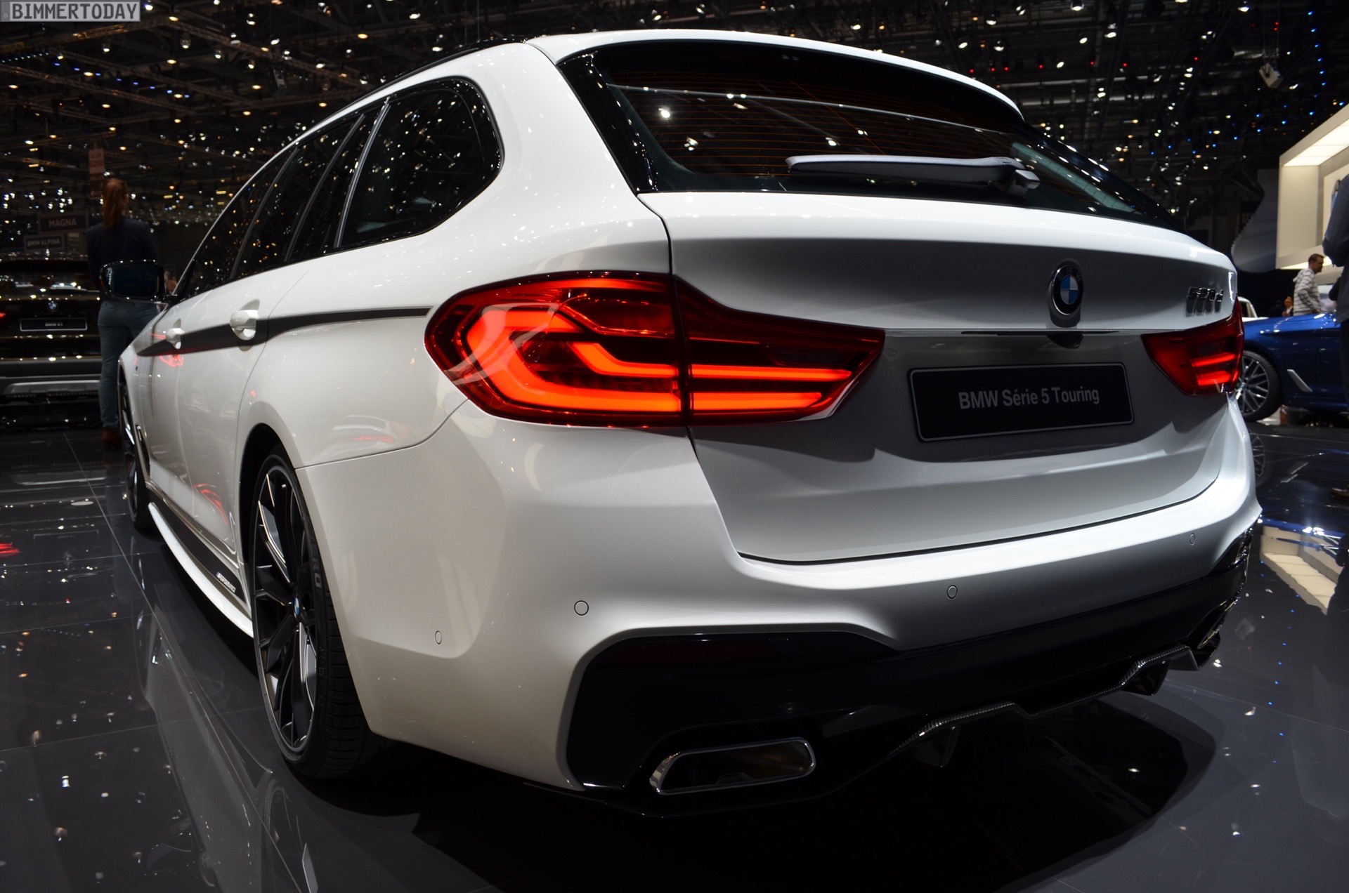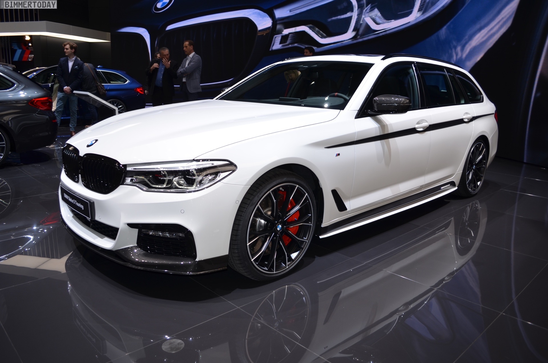Der echte Hingucker bei der Weltpremiere auf dem Genfer Autosalon 2017 sind aber natürlich die Aerodynamik-Teile für den BMW 5er G31. Aufsätze für die Frontschürze, ein zweiteiliger Diffusor-Einsatz für die Heckschürze sowie mattschwarze Seitenschweller-Aufsätze. Sowohl die Seitenschweller als auch ein Teil der Heckschürzen-Einsätze können auf Wunsch in jeder vom Kunden gewünschten Farben lackiert werden, was zusätzlichen Spielraum zur Individualisierung schafft und uns in den nächsten Jahren so manchen interessanten Anblick bescheren dürfte – beispielsweise in Form von Details am Familien-Kombi, die die gleiche Farbe wie der Roadster fürs Wochenende tragen. Schwarze Nieren und Außenspiegel-Kappen aus Carbon runden den M Performance-Look der Karosserie gemeinsam mit den Zierstreifen sportlich ab.
