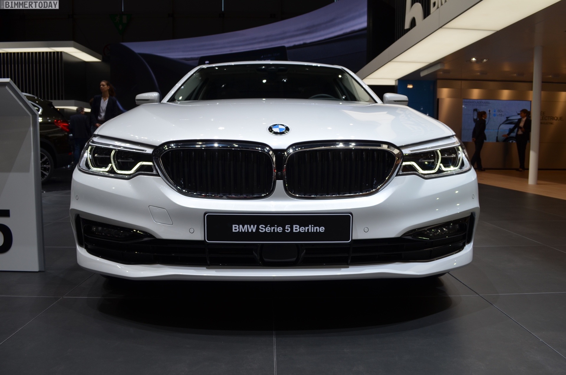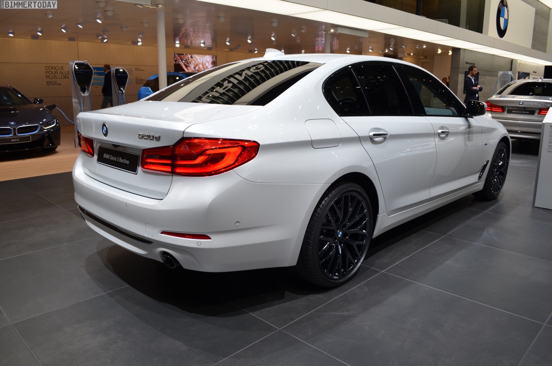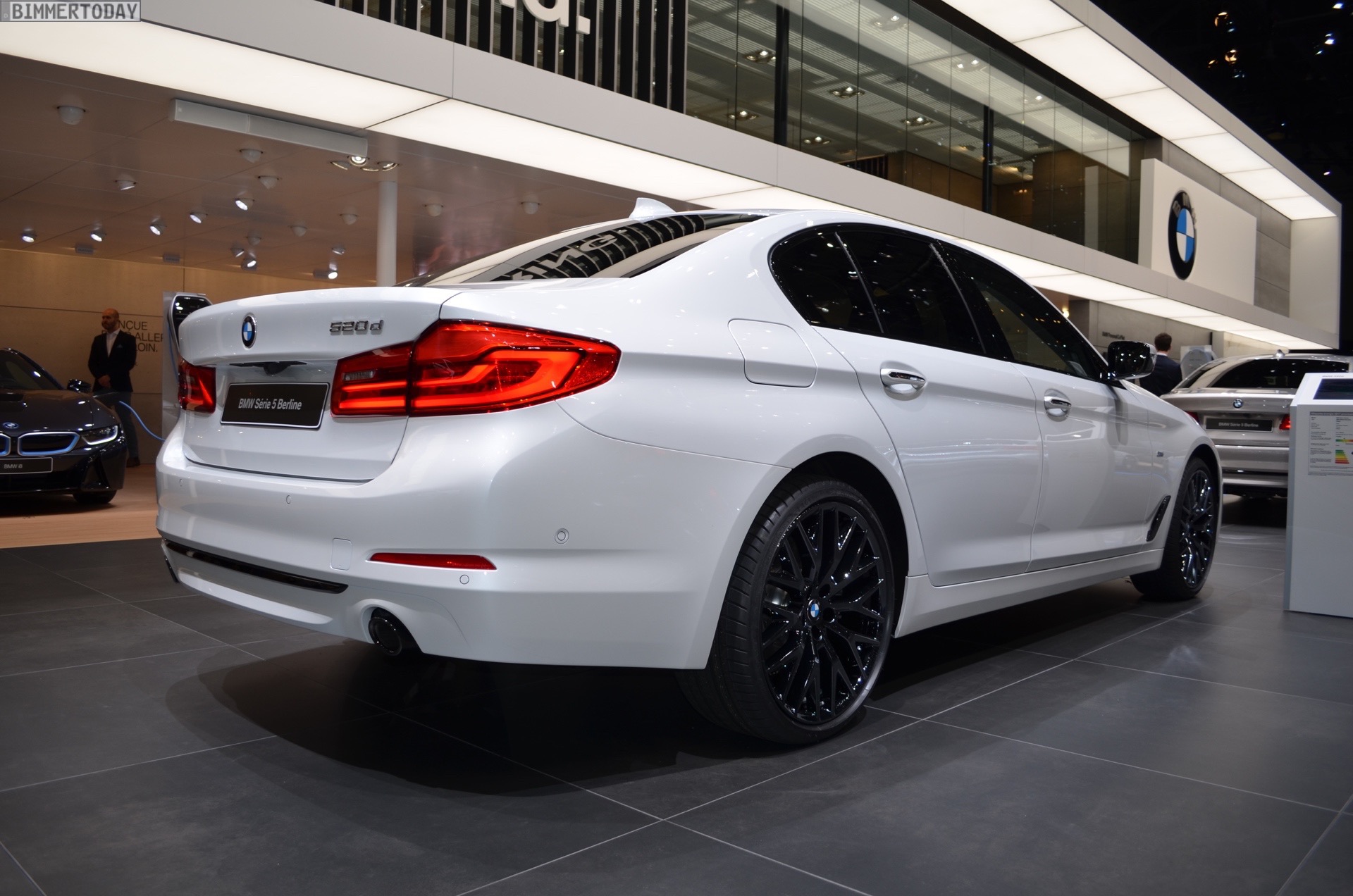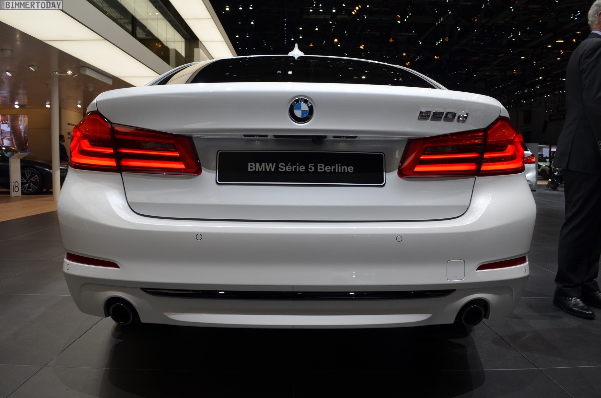 Denn auch wenn die BMW 520d EfficientDynamics Edition beim Blick auf Leistungsangabe und Fahrleistungen nicht unbedingt der dynamischste 5er-Variante ist, lässt sie sich doch sehr sportlich konfigurieren. Auf dem Genfer Autosalon 2017 zeigt der BMW 520d ED einen Ausschnitt dieser Möglichkeiten mit einer edlen Lackierung in Mineralweiß Metallic, der optionalen Sport Line und 20 Zoll großen Leichtmetallrädern im Stil 636 in Liquid Black. Besonderes Augenmerk haben auch die zwei Endrohre verdient, die zumindest gemessen am Look früherer Generationen mit einem Endrohr links und rechts eine souveräne Motorisierung vermuten lassen.
