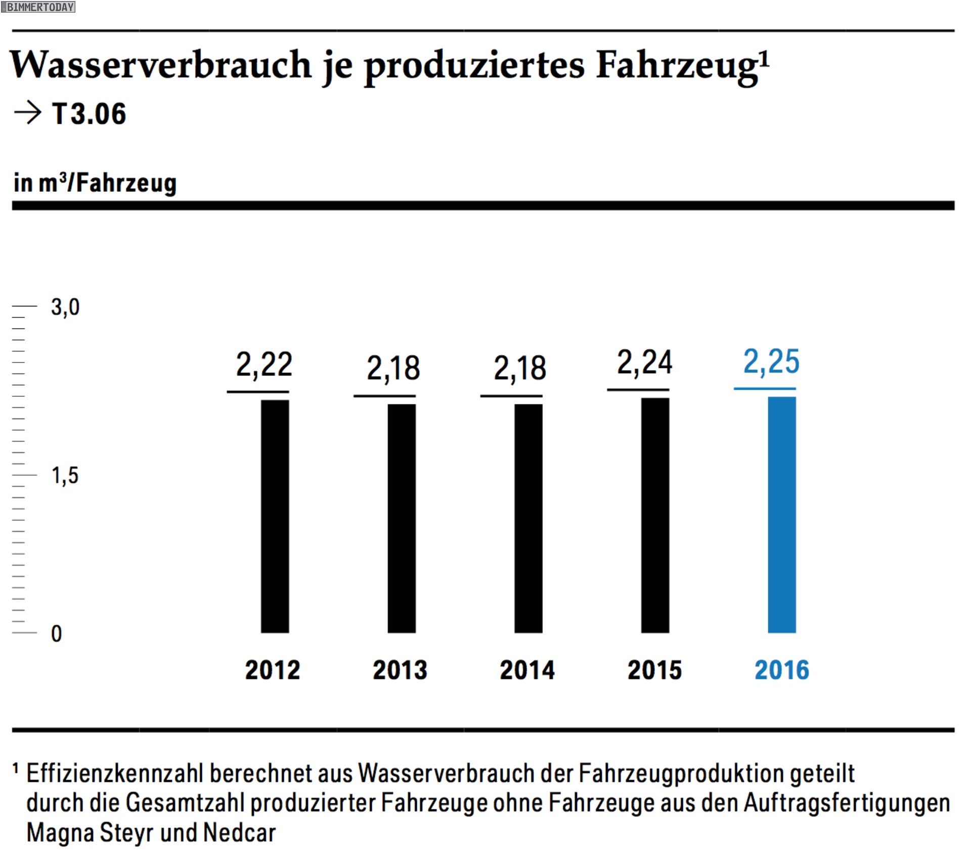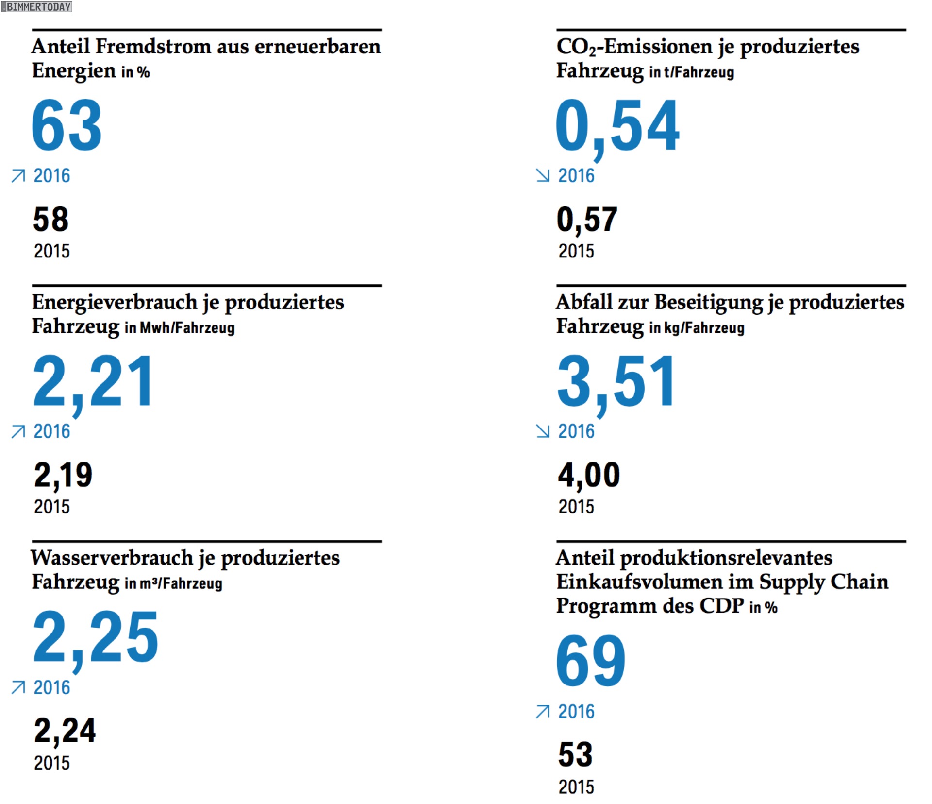 Die BMW Group hat in ihrem Sustainable Value Report 2016 über große Fortschritte in Sachen Nachhaltigkeit berichtet. So konnten nicht nur die CO2-Emissionen der europäischen BMW-Flotte auf durchschnittlich 124 Gramm pro Kilometer reduziert werden, auch die Umweltbelastung durch die Produktion neuer Automobile konnte deutlich gesenkt werden. Im Vergleich zu 2006 konnten der Verbrauch von Energie und Wasser, das Abfall- und Abwasseraufkommen sowie die Emissionen von Lösungsmitteln und CO2 im Durchschnitt halbiert werden. Im Vergleich zu 2015 konnten 2016 erneut Verbesserungen von 4,9 Prozent erzielt werden.