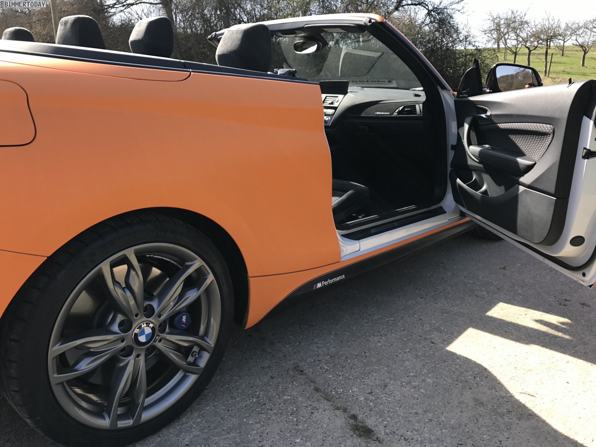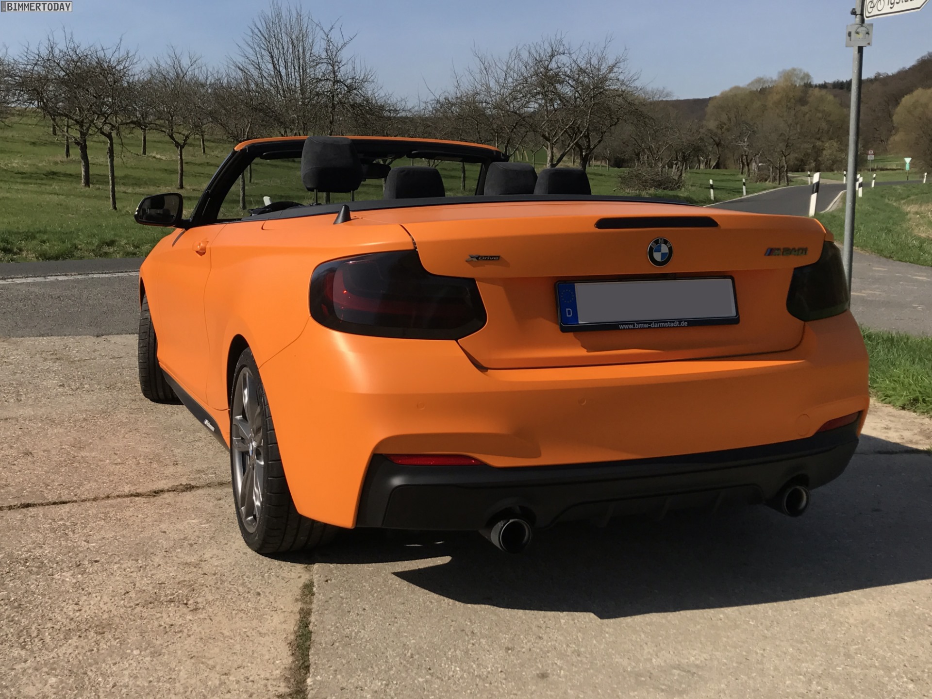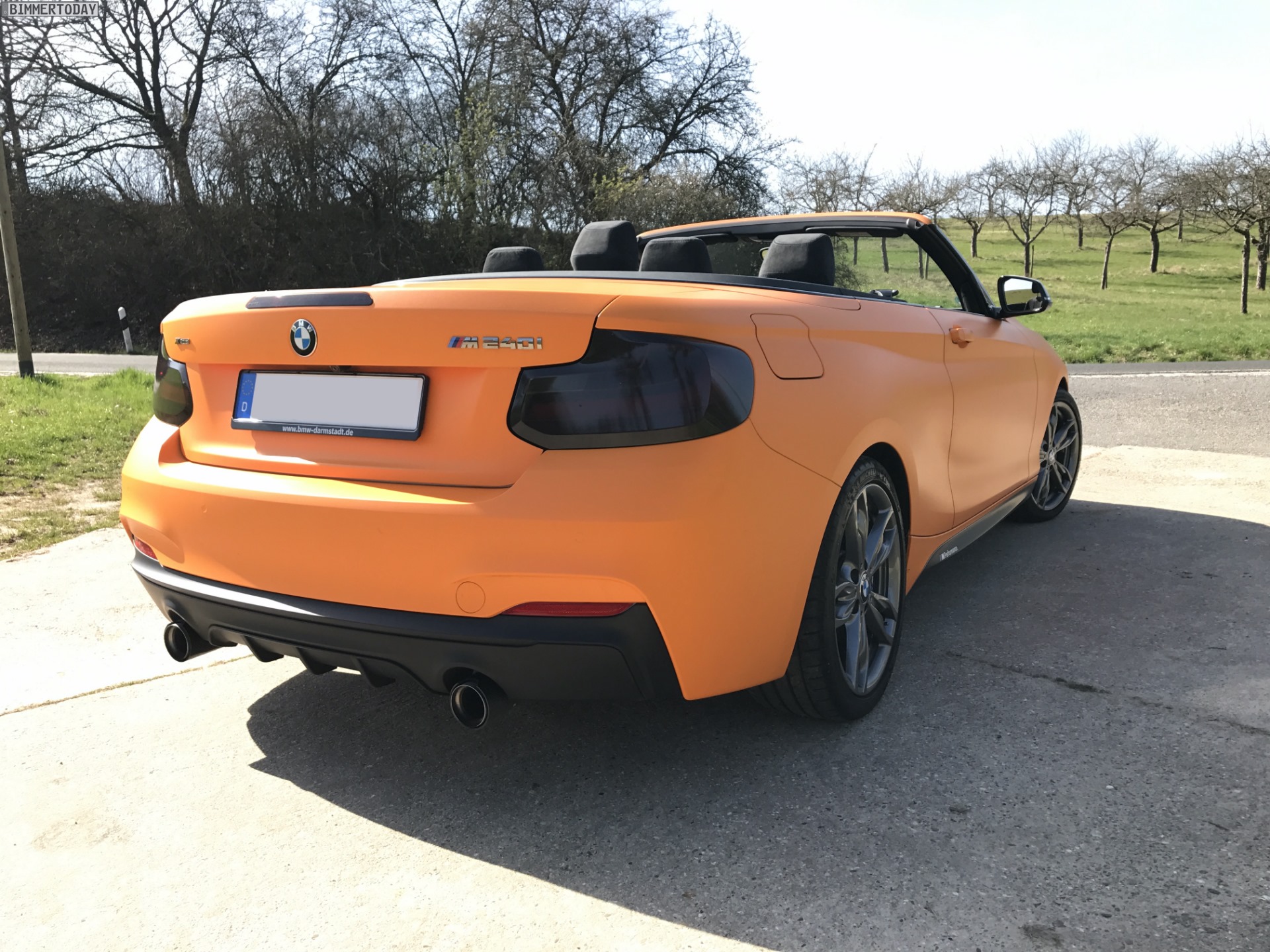 Unser Leser Jannis hat sein im letzten Spätsommer erworbenes BMW M240i Cabrio mittlerweile für die neue Saison vorbereitet und dafür ein ganzes Stück von der Serie entfernt. Die auffälligste Veränderung stellt eine Folierung in mattem Orange dar, die das ab Werk lackierte Weiß vollständig überdeckt und den offenen 2er zum absoluten Hingucker macht. Für Kenner weisen die nicht folierten und daher weiterhin in Cerium Grey glänzenden Außenspiegel-Kappen sowie die gleichfarbigen Stege in den äußeren Lufteinlässen der Frontschürze darauf hin, dass hier das sportlichste ab Werk erhältliche 2er Cabrio unterwegs ist.