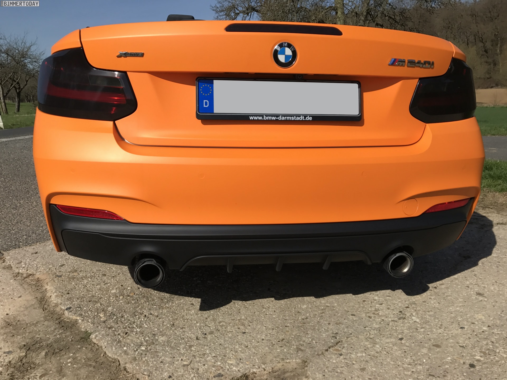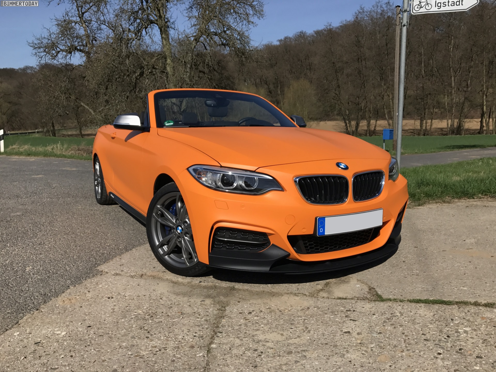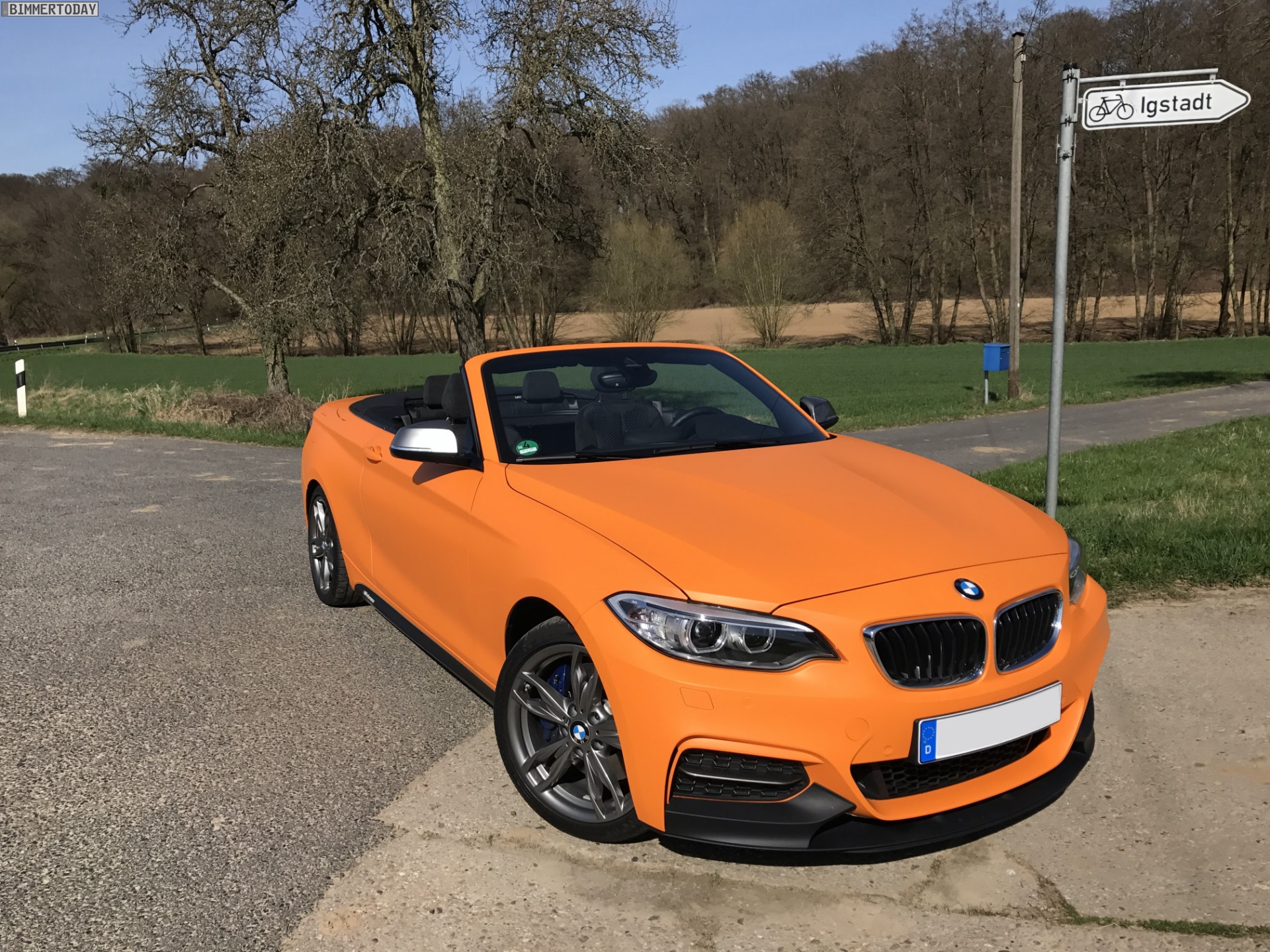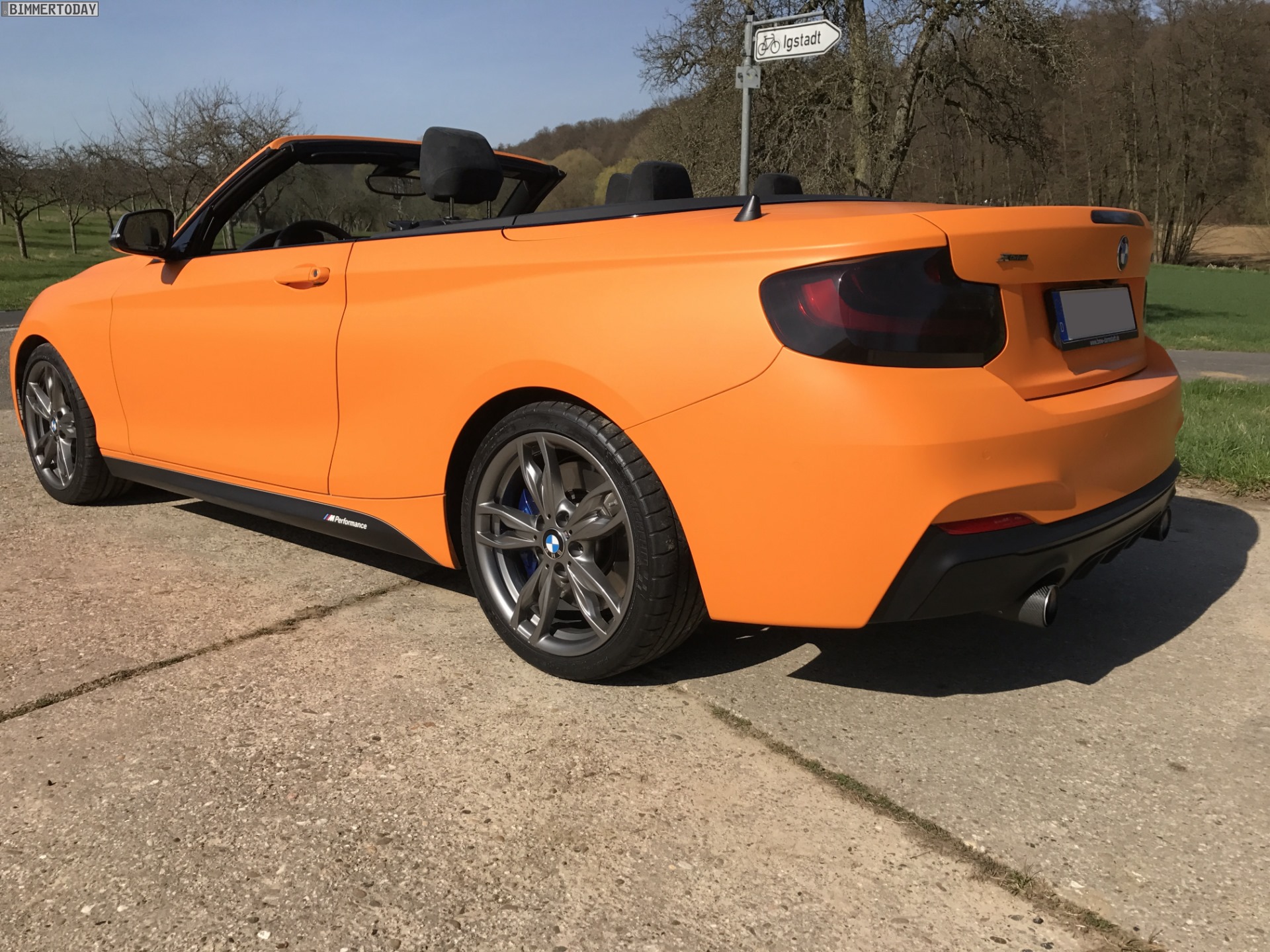 Unser Leser Jannis hat sein im letzten Spätsommer erworbenes BMW M240i Cabrio mittlerweile für die neue Saison vorbereitet und dafür ein ganzes Stück von der Serie entfernt. Die auffälligste Veränderung stellt eine Folierung in mattem Orange dar, die das ab Werk lackierte Weiß vollständig überdeckt und den offenen 2er zum absoluten Hingucker macht. Für Kenner weisen die nicht folierten und daher weiterhin in Cerium Grey glänzenden Außenspiegel-Kappen sowie die gleichfarbigen Stege in den äußeren Lufteinlässen der Frontschürze darauf hin, dass hier das sportlichste ab Werk erhältliche 2er Cabrio unterwegs ist.
