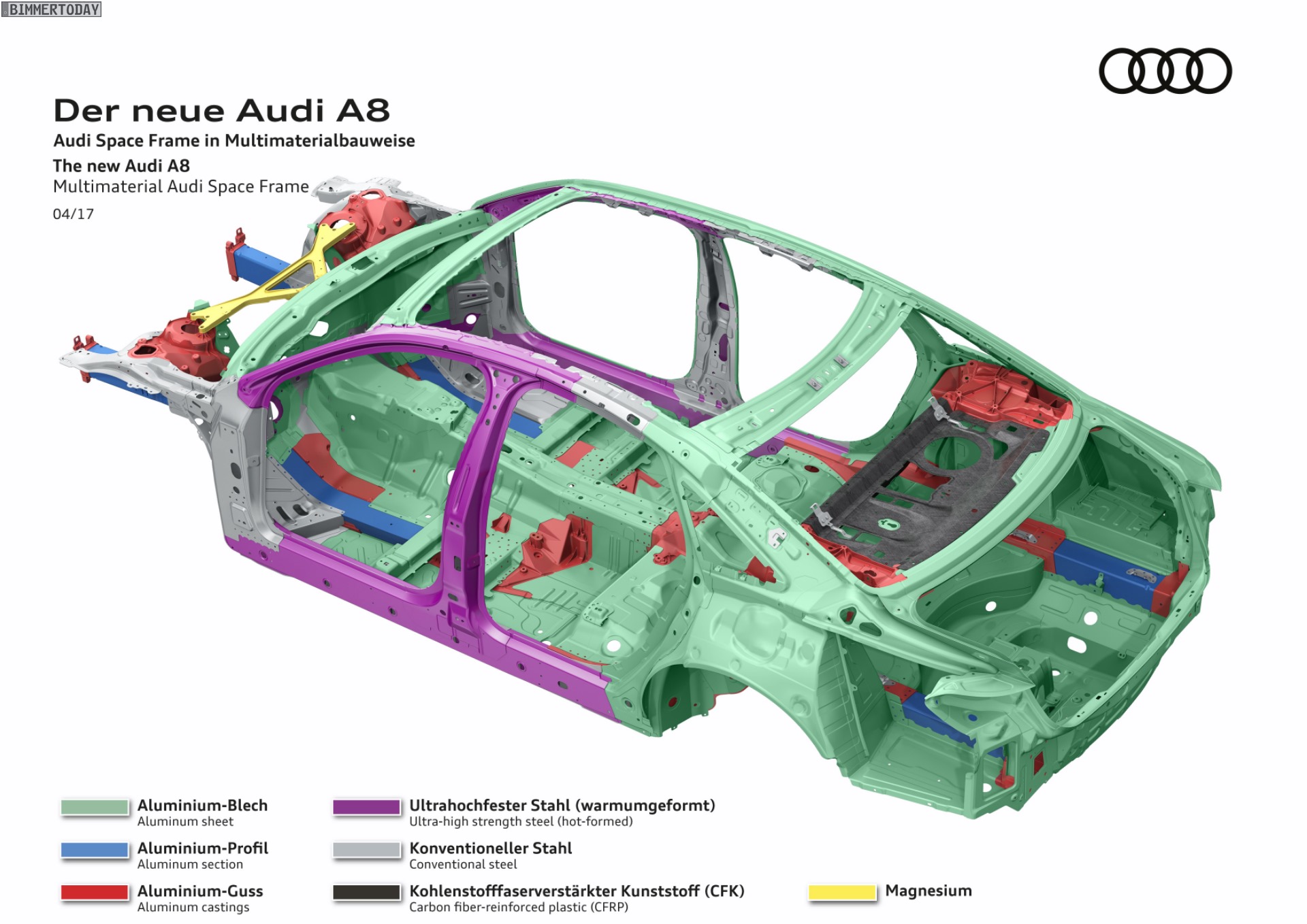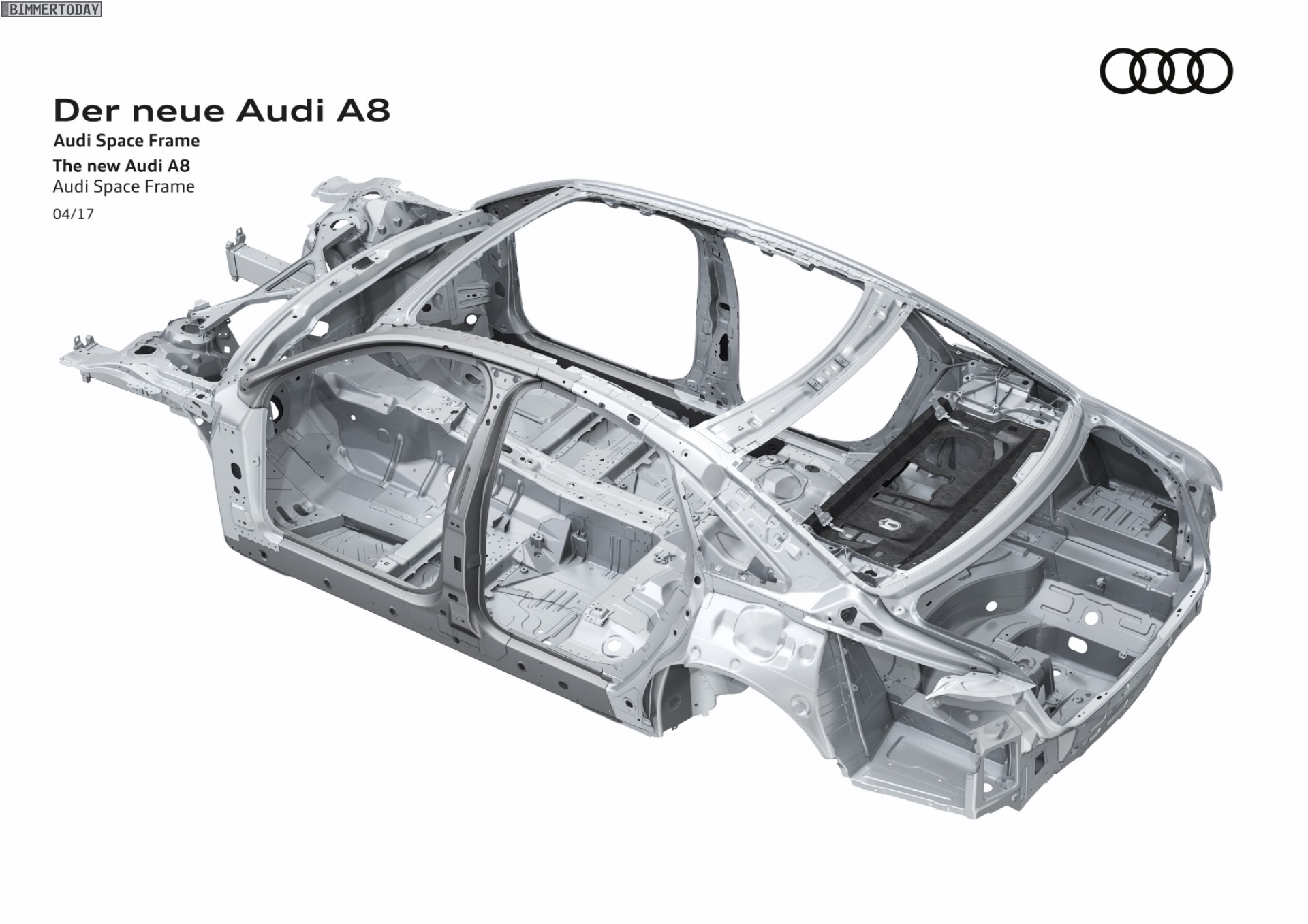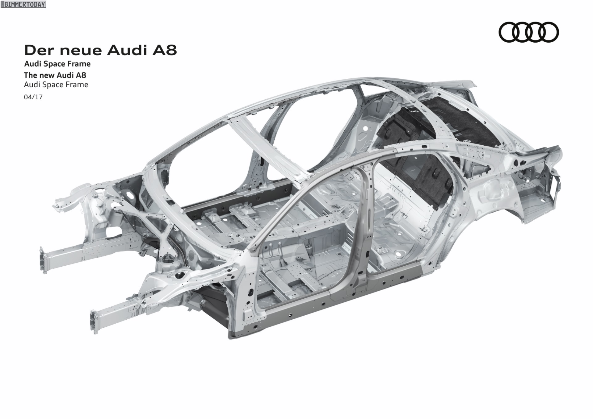 Bis vor wenigen Jahren schien sich die Gewichtsspirale unaufhörlich in die gleiche Richtung zu drehen: Autos wurden immer größer und gleichzeitig immer schwerer. Inzwischen gibt es – auch dank BMW – einige Beispiele dafür, dass Autos auch bei größeren Abmessungen signifikant leichter werden können. Hierbei hilft die intelligente Kombination von höchstfesten Stählen, Aluminium und vergleichsweise jungen Werkstoffen wie Carbon. Auch der Audi A8 2017 gewährt nun einen ersten Blick unter seine Außenhaut, denn lange vor der Premiere auf der IAA verraten die Ingolstädter erste Details zur Karosserie ihrer Luxuslimousine.