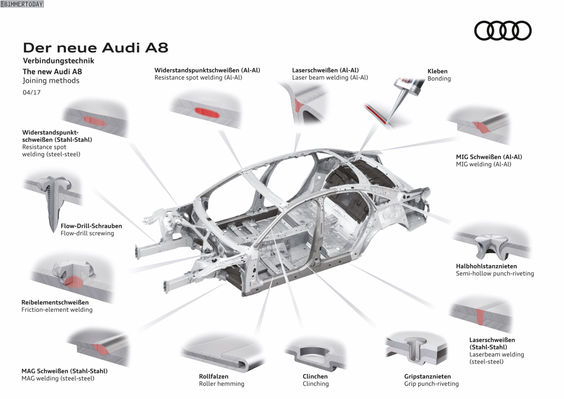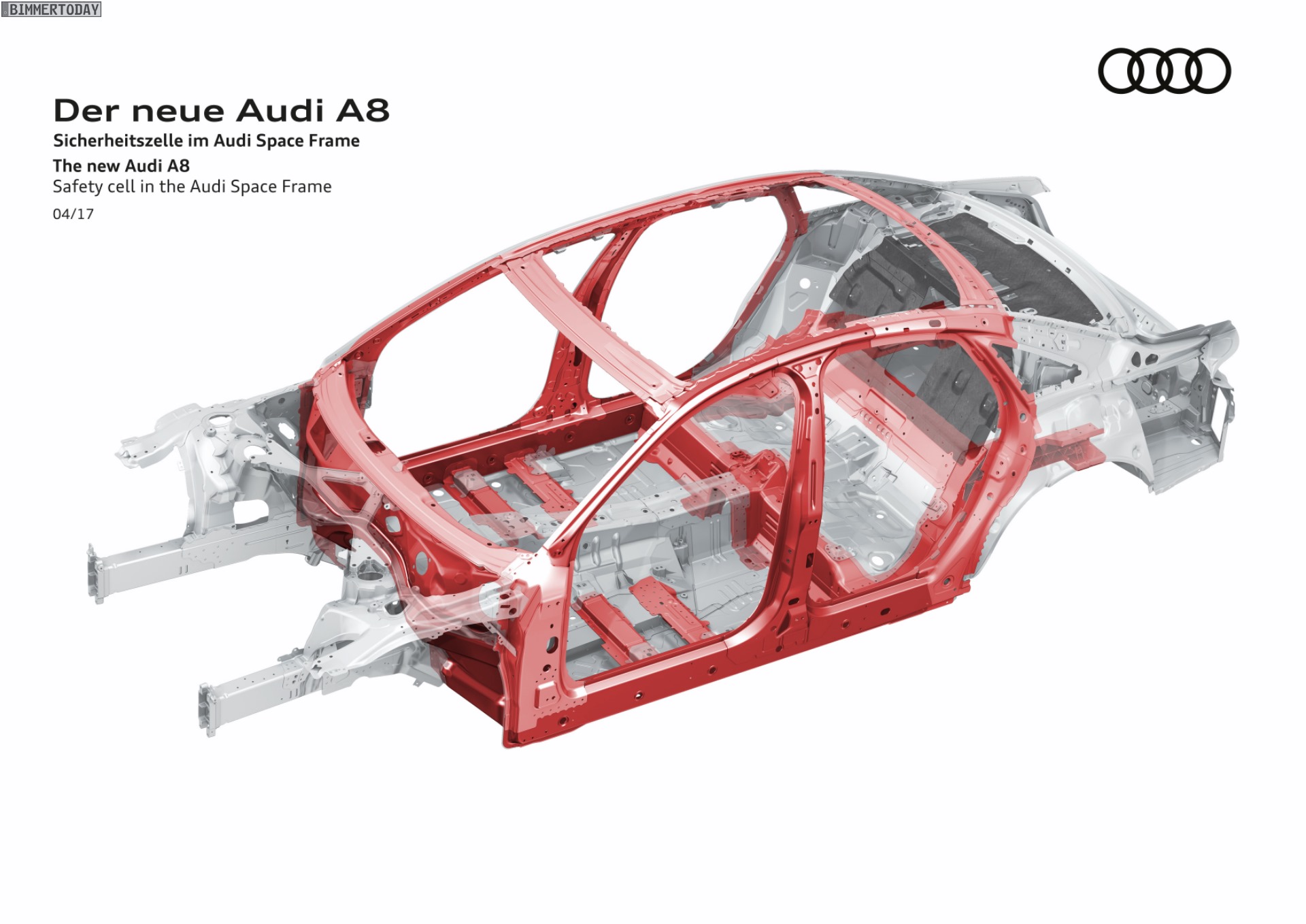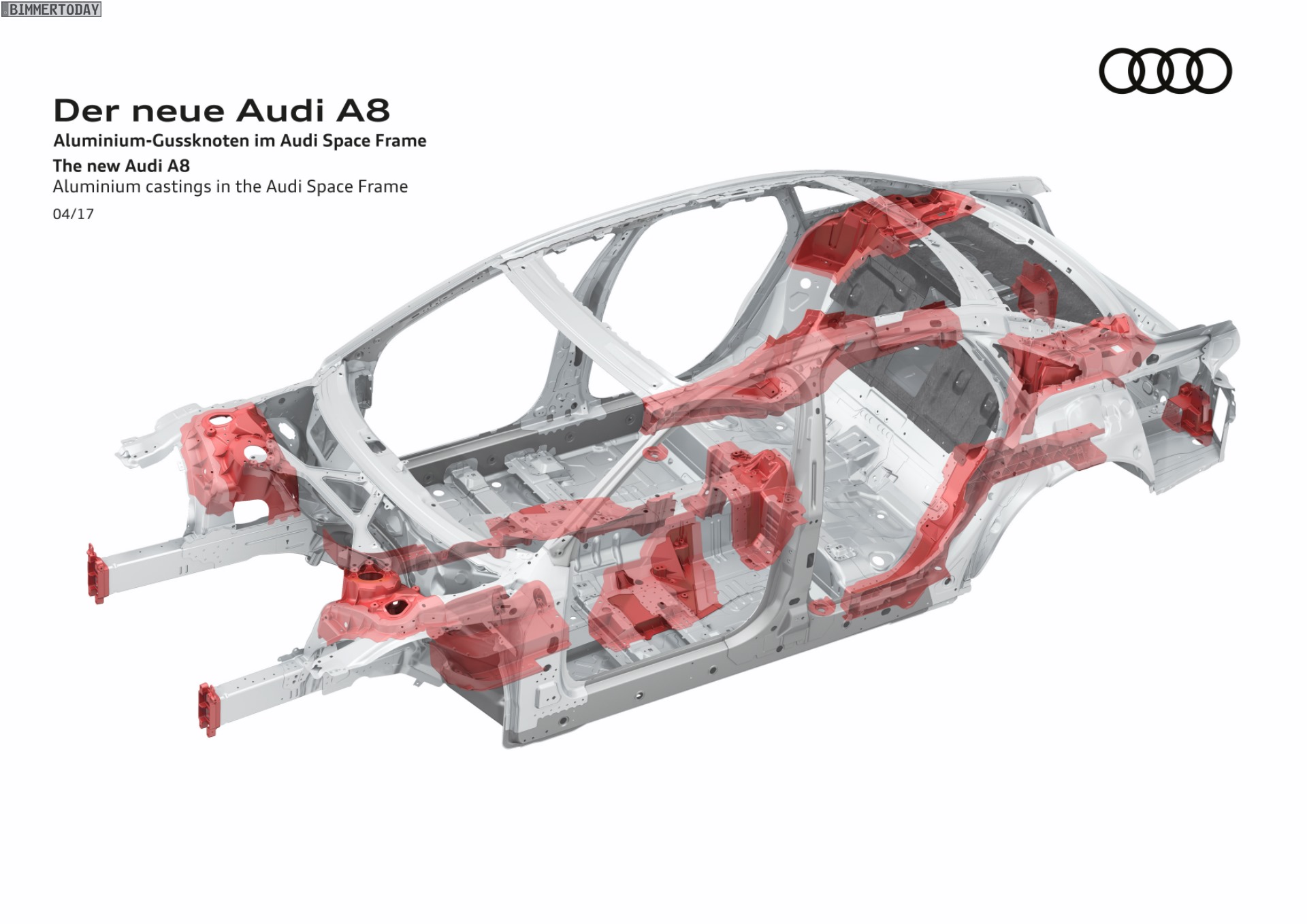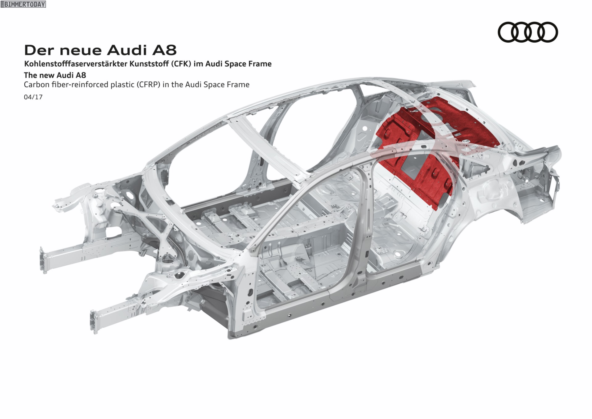 Bis vor wenigen Jahren schien sich die Gewichtsspirale unaufhörlich in die gleiche Richtung zu drehen: Autos wurden immer größer und gleichzeitig immer schwerer. Inzwischen gibt es – auch dank BMW – einige Beispiele dafür, dass Autos auch bei größeren Abmessungen signifikant leichter werden können. Hierbei hilft die intelligente Kombination von höchstfesten Stählen, Aluminium und vergleichsweise jungen Werkstoffen wie Carbon. Auch der Audi A8 2017 gewährt nun einen ersten Blick unter seine Außenhaut, denn lange vor der Premiere auf der IAA verraten die Ingolstädter erste Details zur Karosserie ihrer Luxuslimousine.