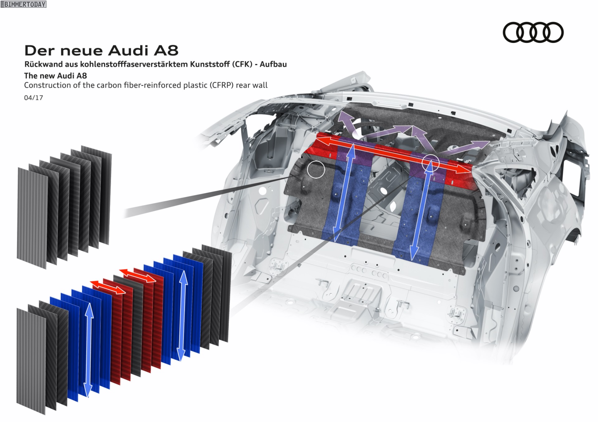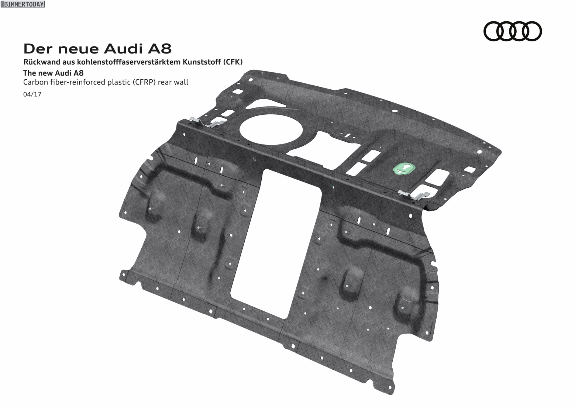 Während der neue BMW 7er mit Carbon Core-Technologie an vielen Stellen auf den leichten Hightech-Werkstoff setzt, muss sich der Audi A8 2017 mit zwei vergleichsweise kleinen Teilen aus kohlefaserverstärktem Kunststoff begnügen: Lediglich die Rückwand zwischen Innen- und Kofferraum und die darüber platzierte Hutablage werden aus CFK gefertigt, die restliche Karosserie besteht aus den konventionellen Werkstoffen Aluminium, Stahl und Magnesium. Den größten Anteil an der Gesamtkarosserie hat mit 58 Prozent Aluminium, es folgen Stahl, Magnesium und Carbon. Der Mix der vier Werkstoffe sorgt laut Audi für mehr Sicherheit und eine um rund ein Viertel verbesserte Verwindungssteifigkeit.