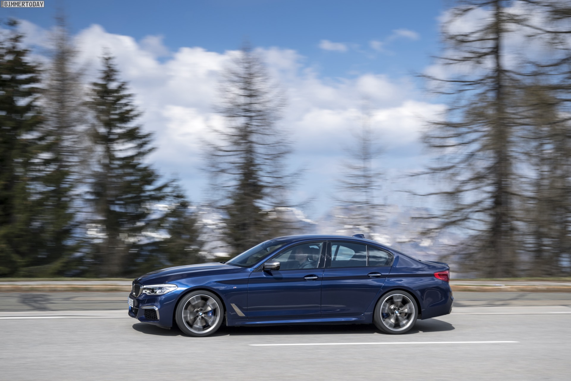 Wie es um die erzielbaren Kurvengeschwindigkeiten bestellt ist, können wir nach unserer ersten Ausfahrt mit dem BMW M550i xDrive leider nur erahnen: Weil die Roßfeldpanoramastraße auch Ende April stellenweise noch von Schnee bedeckt war, gab es keine Alternative zu Winterreifen. Das volle Potenzial des normalerweise auf 19 oder sogar 20 Zoll großen Leichtmetallrädern mit Performance-Bereifung stehenden M550i war für uns folglich nicht zu erkunden. Die ausgeglichene Gewichtsverteilung und das speziell auf das vorläufige Topmodell abgestimmte Fahrwerk haben aber auch auf Winterreifen dafür gesorgt, dass der BMW M550i xDrive lange neutral bleibt und nur dann mit Untersteuern straft, wenn der Fahrer eine deutlich zu hohe Geschwindigkeit für die Einfahrt in die Kurve wählt.