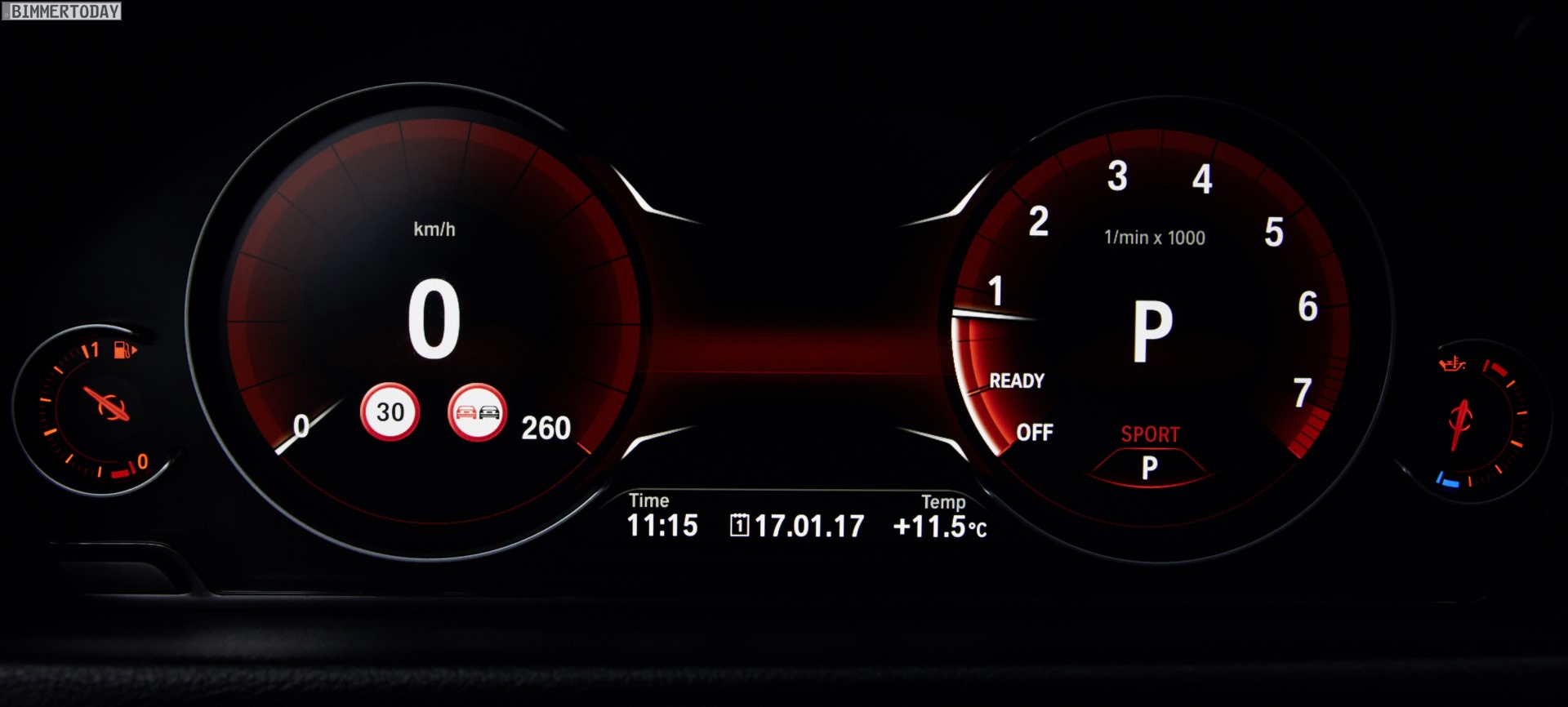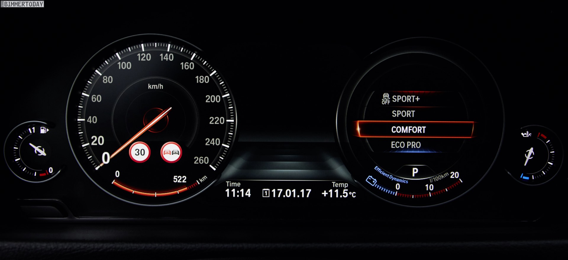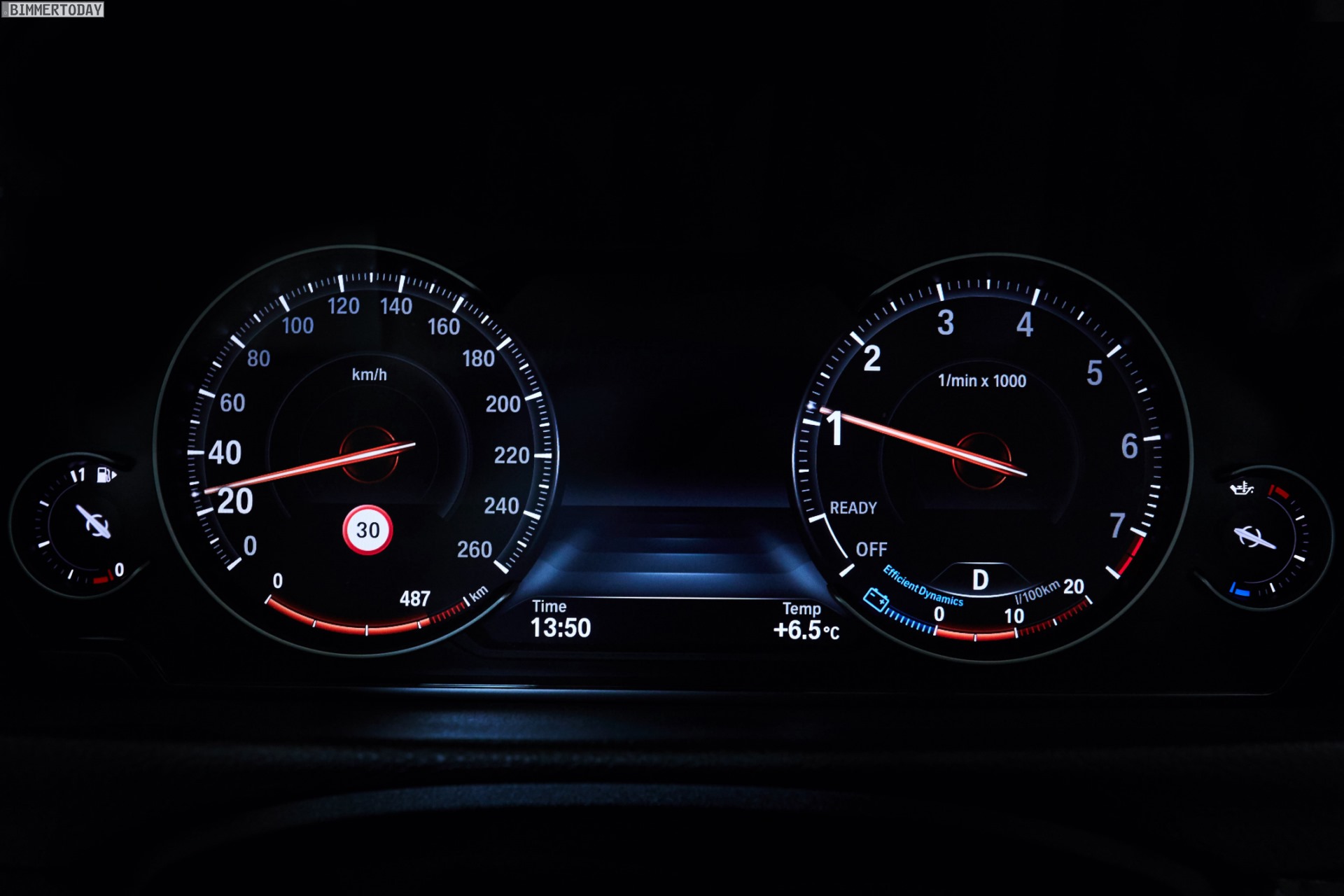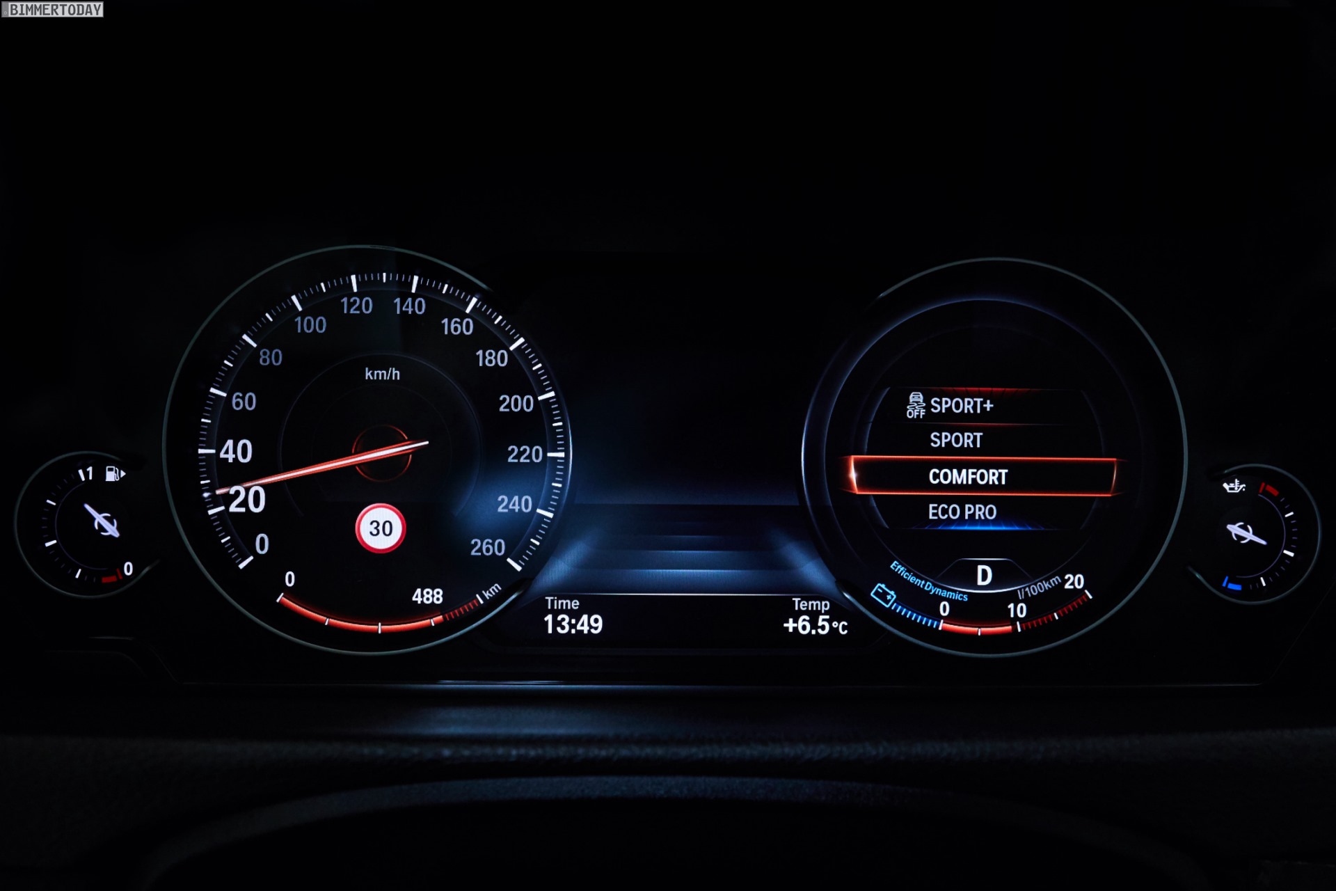 Die prinzipielle Logik bleibt dabei stets unverändert und entspricht dem Grundschema aller BMW-Tachos seit mehreren Jahrzehnten: Im großen Rundinstrument links wird die Geschwindigkeit dargestellt, rechts lässt sich die Drehzahl ablesen. Die Darstellung der Infos lässt sich mit dem Multifunktionalen Instrumentendisplay nun auch in der 3er- und 4er-Reihe je nach Vorliebe und Fahrmodus deutlich verändern: Während die zum Motorstart aktive Ansicht des Comfort-Modus am ehesten den bisherigen Instrumenten entspricht, verändert sich die Darstellung in den Modi Sport und Eco Pro deutlich.