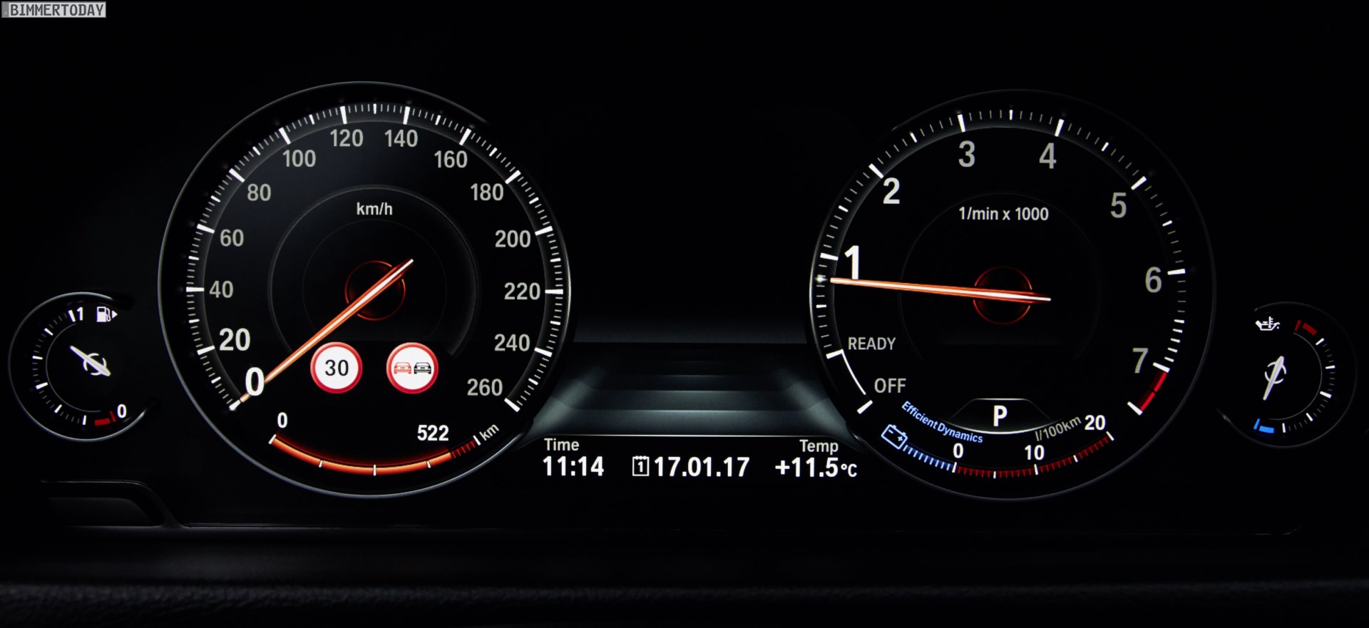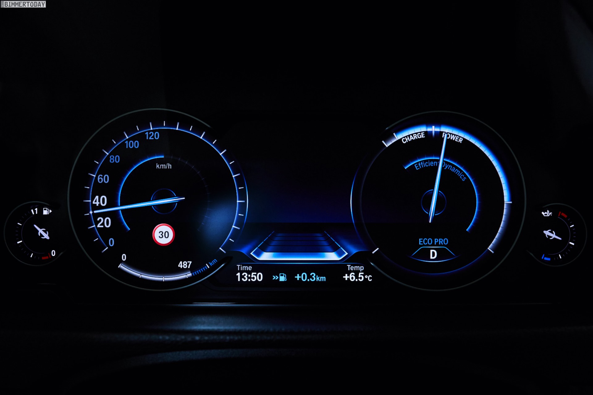 Ganz anders präsentiert sich das Multifunktionale Instrumentendisplay im Modus Eco Pro. Der auf sparsames und verbrauchsoptimiertes Fahren ausgelegte Fahrmodus wird von einem blau unterlegten MFID begleitet und gibt Hinweise zur weiteren Effizienzsteigerung. Der Tacho reicht plakativ nur bis 120 km/h – höhere Geschwindigkeiten sind natürlich auch im Eco Pro-Modus möglich, empfehlen sich aber nicht für das Aufstellen neuer Verbrauchsrekorde. An die Stelle des Drehzahlmessers rückt eine EfficientDynamics-Anzeige, die den Fahrer zu einer sanften Nutzung des Gaspedals motivieren soll. Dringt die digitale Nadel in die linke Hälfte der Anzeige ein, wird Energie rekuperiert und besonders effizient gefahren.