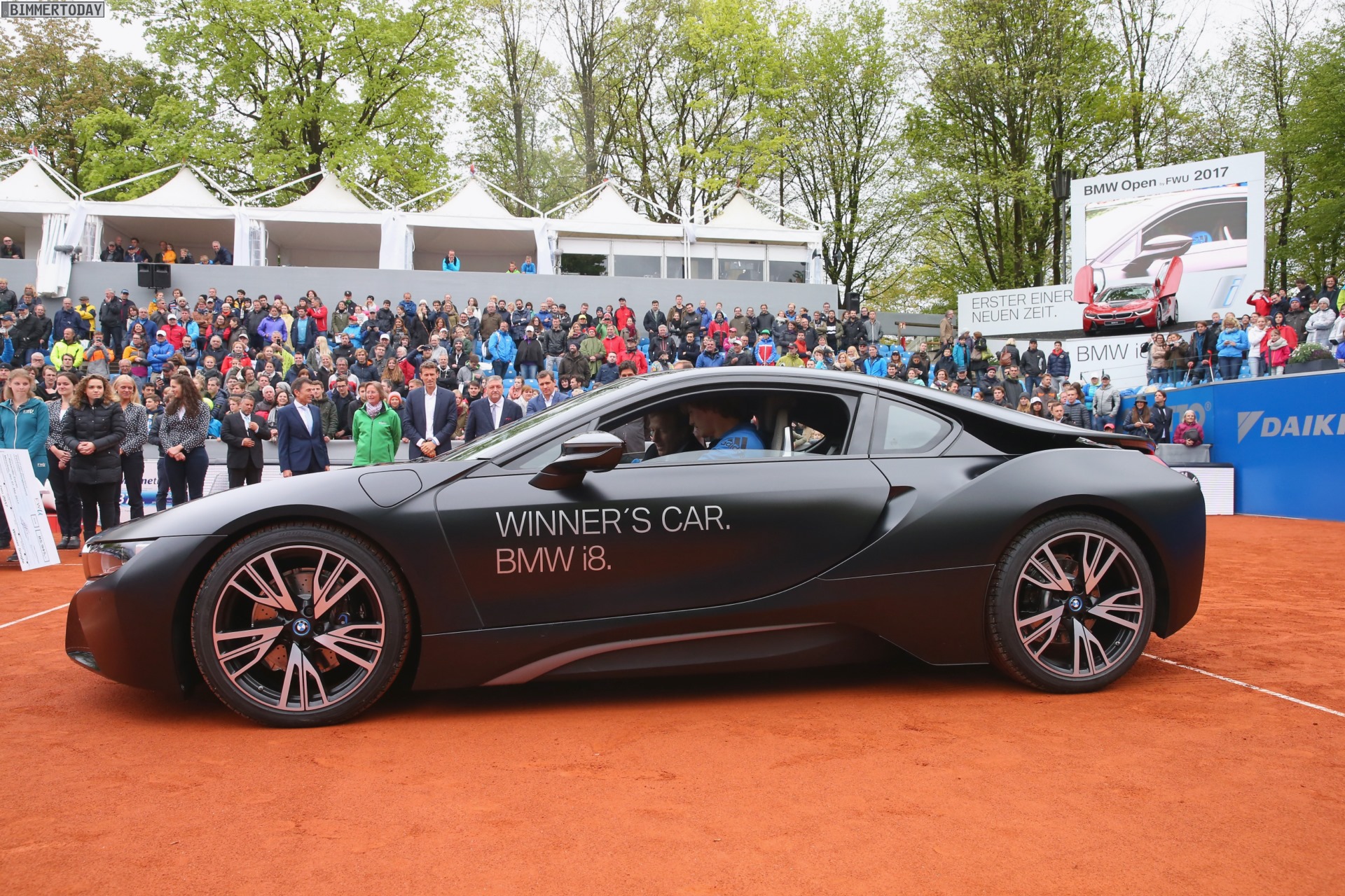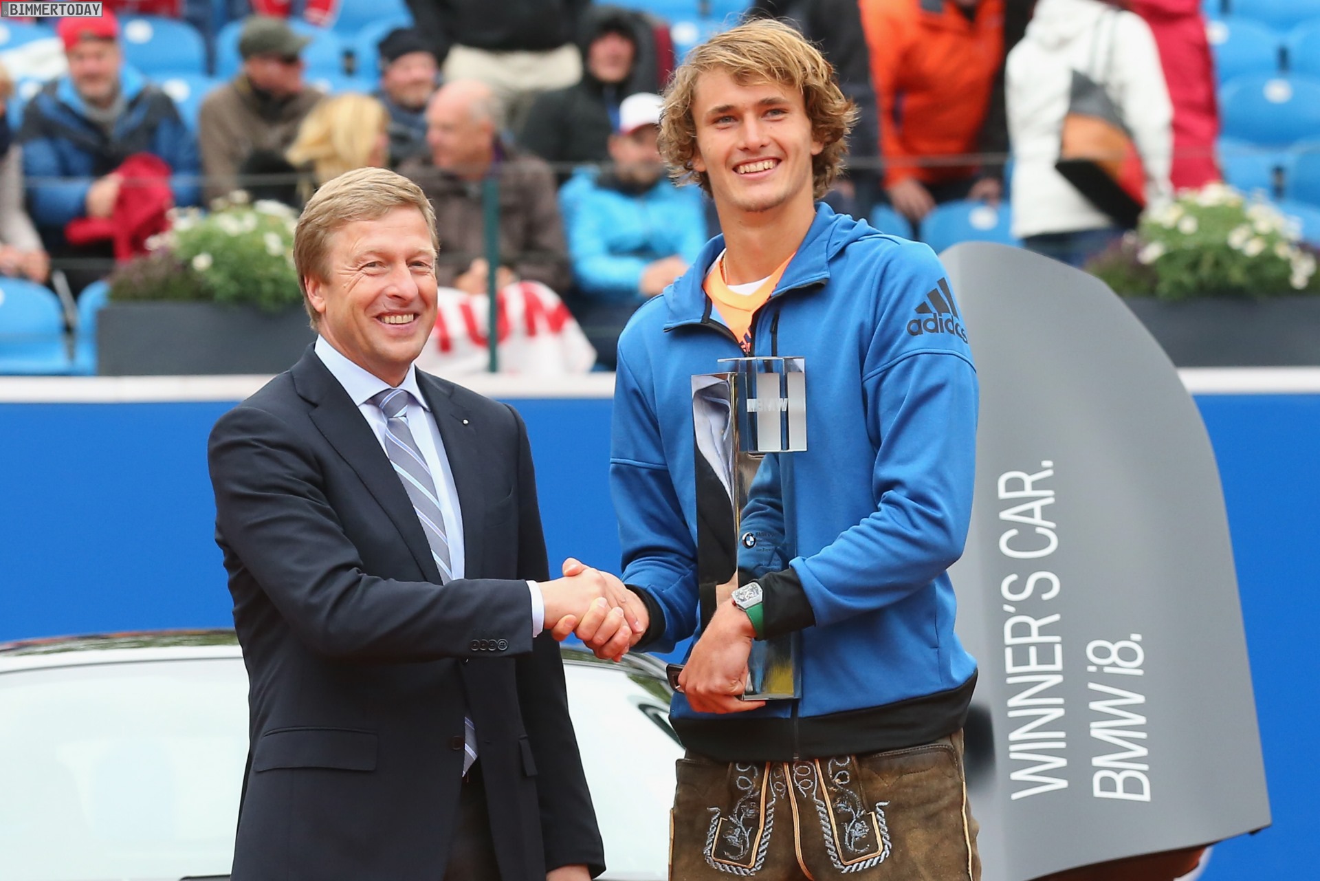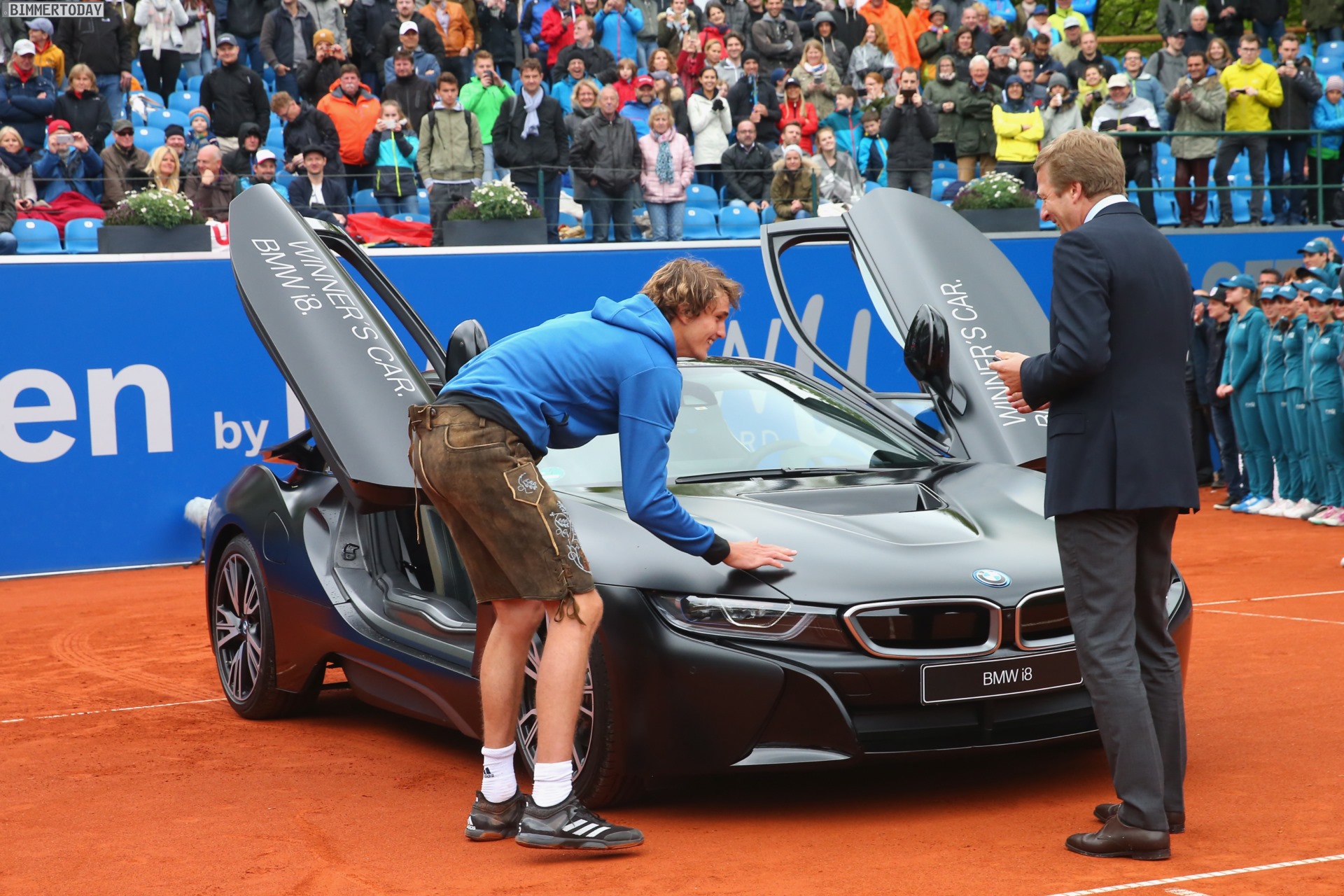 Mit einem 6:4 und 6:3 im Finale der BMW Open 2017 in München sicherte sich der Deutsche Alexander Zverev nicht nur seinen dritten ATP-Titel, sondern darf sich auch über einen BMW i8 Protonic Frozen Black Edition freuen. Das limitierte Sondermodell hat einen Wert von rund 140.000 Euro und ist damit sogar noch deutlich wertvoller als das offizielle Preisgeld in Höhe von 85.945 Euro. Außerdem erhielt Zverev als Gewinner des Münchner Traditionsturniers auch noch eine fesche Lederhose, die er direkt zur Siegerehrung präsentiert hat.