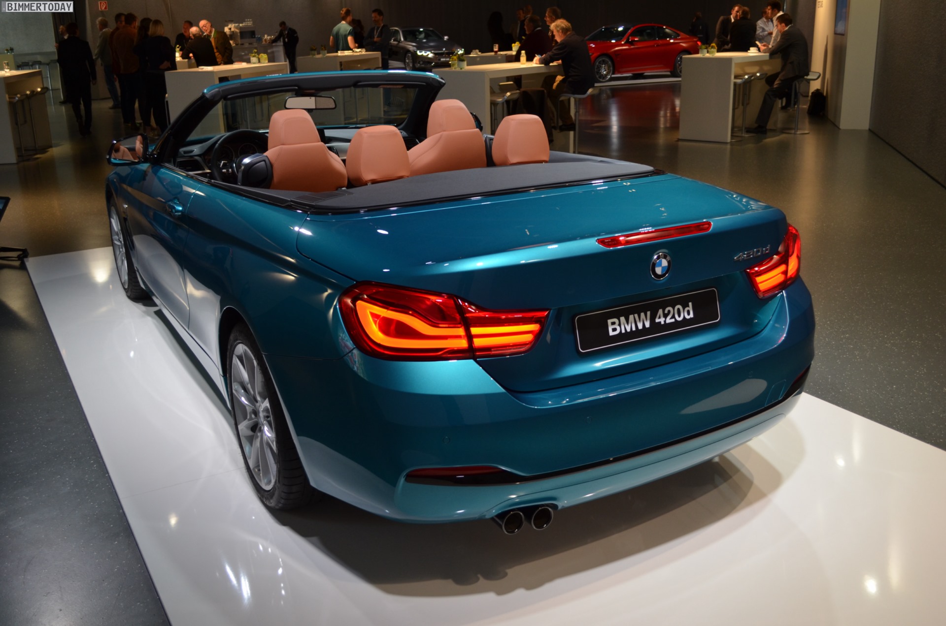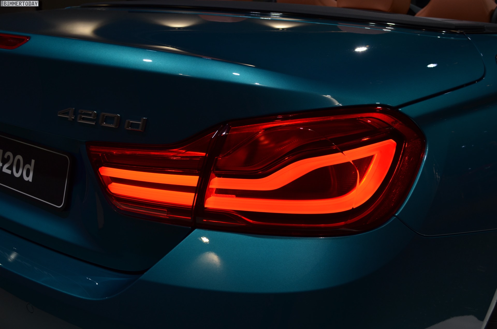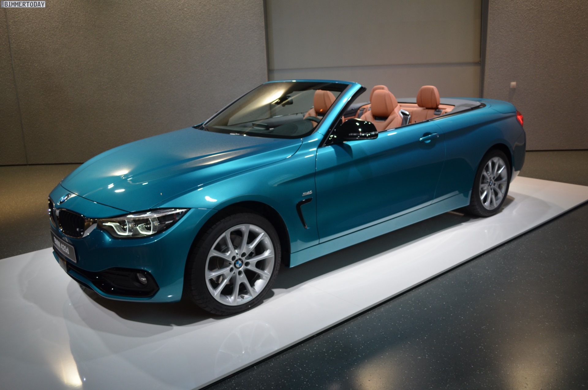 Mit dem BMW 4er Facelift 2017 feiert auch die neue Farbe Snapper Rocks Blue ihr Debüt. Auf allen bisherigen Fotos haben wir die nach einem beliebten Surfer-Strand in Australien benannte Lackierung auf dem Coupé gesehen, nun zeigen unsere Fotos auch das BMW 4er Cabrio 2017 in dem kräftigen Türkis-Blau. Die offene Variante der 4er-Reihe steht in Deutschland für rund 25 Prozent der verkauften 4er und liegt damit zwar klar hinter dem dominierenden Gran Coupé, aber auch relativ deutlich vor dem zweitürigen Coupé, das nur auf einen Anteil von 15 Prozent kommt.