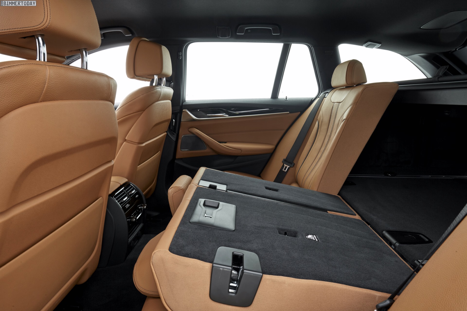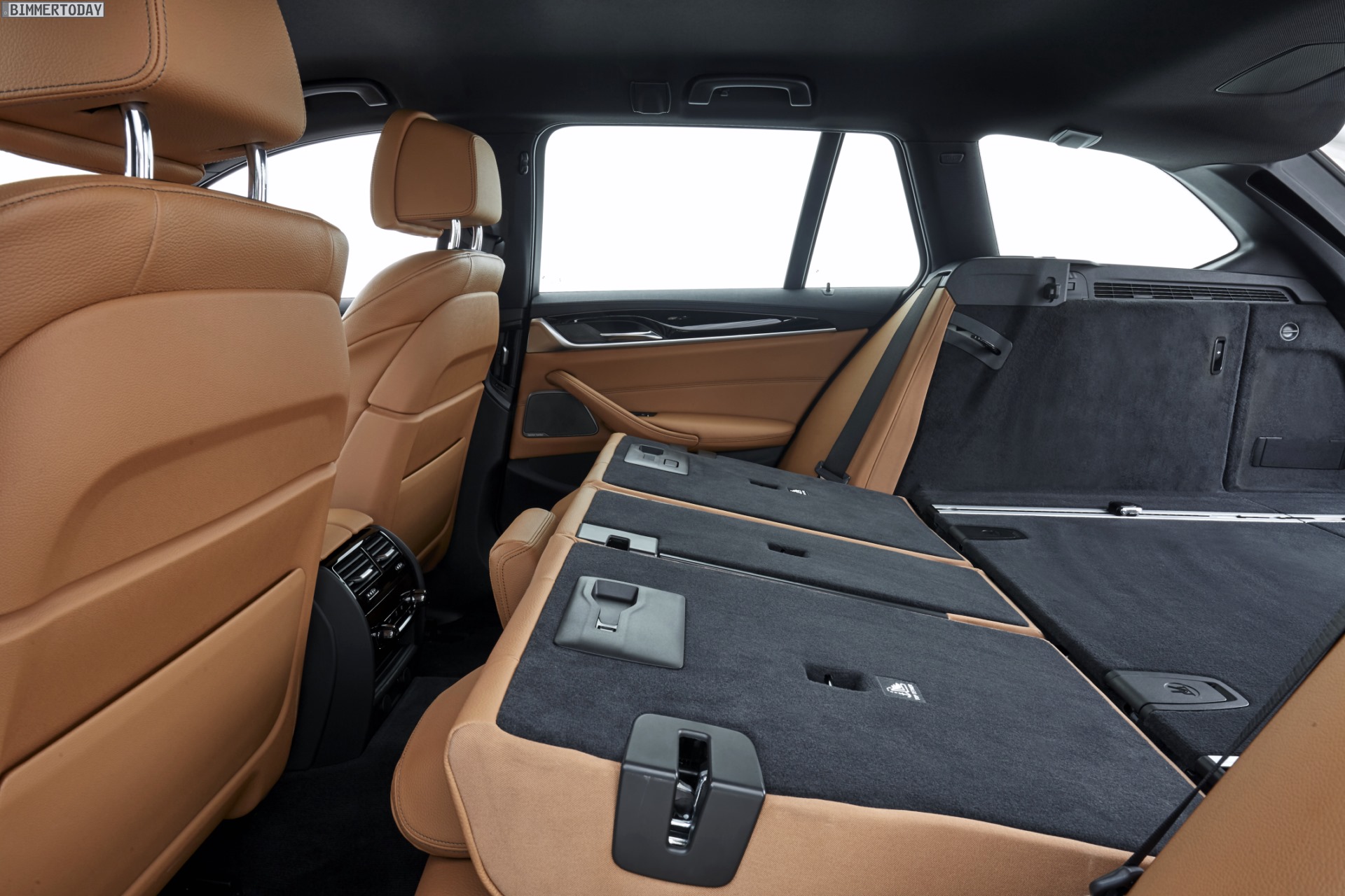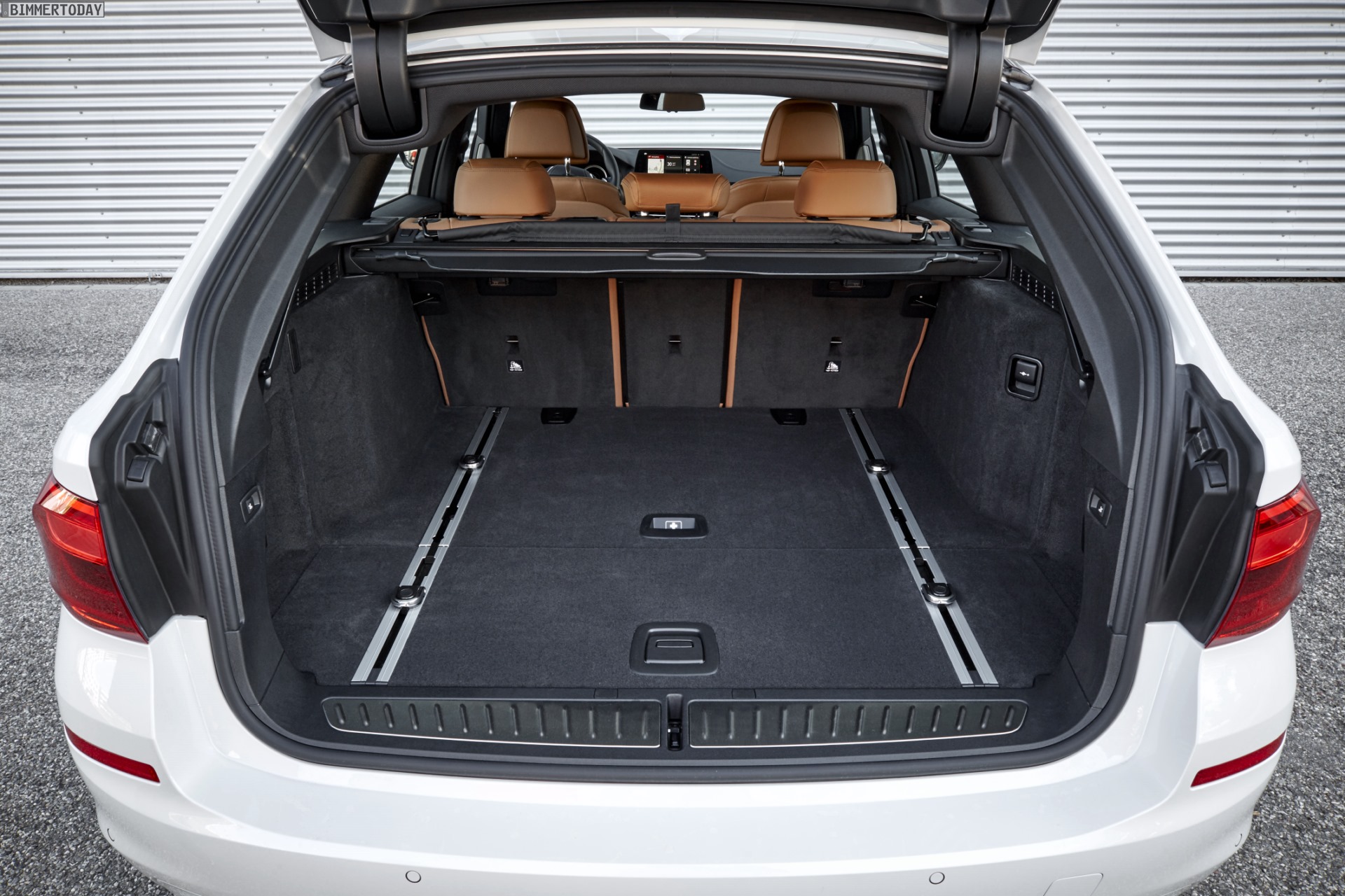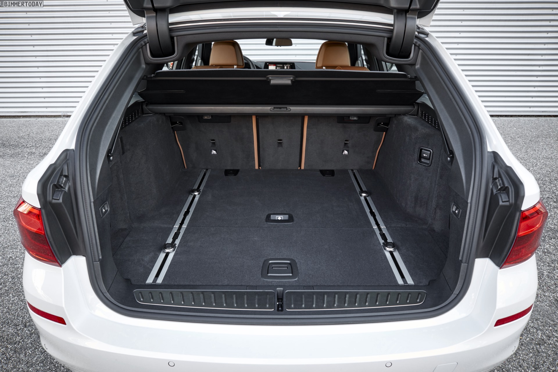 Mindestens so wichtig wie diese Eckdaten sind vielen G31-Kunden die Fortschritte im Innenraum, denn bei der Wahl zwischen Limousine und Touring geben in aller Regel die inneren Werte den Ausschlag. Hinter der Heckklappe mit separat zu öffnender Scheibe stecken nun 570 bis 1.700 Liter Kofferraumvolumen, dank etwas breiterer Ladefläche und komfortabel im Kofferraumboden verstaubarer Rollos lässt sich der Platz nun auch noch besser nutzen. Auf die Waage muss man dabei ebenfalls nicht mehr so genau schauen, denn die maximale Zuladung konnte im Vergleich zum Vorgänger um bis zu 120 auf maximal 730 Kilogramm gesteigert werden. Die serienmäßig im Verhältnis 40:20:40 teil- und umklappbare Rückbank bietet außerdem Platz für bis zu drei Kindersitze, was die Familien-Kombi-Qualitäten des neuen 5er Touring unterstreicht.