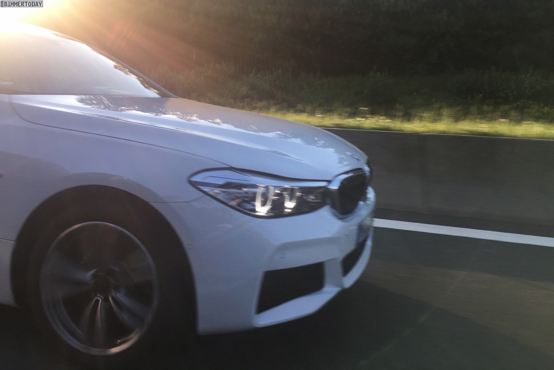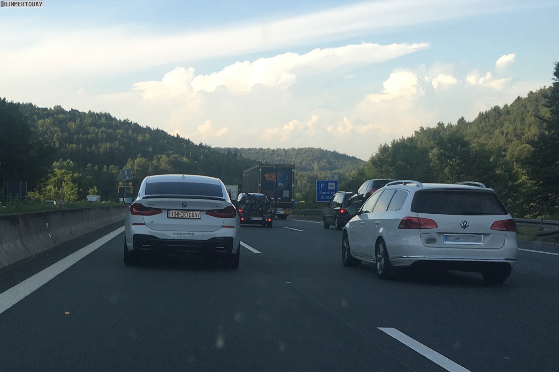 Mit etwas Glück ist der neue BMW 6er GT G32 schon lange vor seinem Marktstart am 11. November 2017 ungetarnt zu sehen. Einer unserer Leser hat am Wochenende ein dezent als Werkstestwagen gekennzeichnetes Exemplar auf der Autobahn erwischt und gleich ein paar Fotos für uns gemacht. Der ungetarnte Gran Turismo trägt dabei das M Sportpaket und fährt mit ausgefahrenem Heckspoiler: Das aerodynamische Hilfsmittel fährt bei über 120 km/h automatisch aus und wird bei unter 80 km/h wieder eingefahren. Der Heckflügel ist ein Element, das zur beachtlichen Verbesserung des cW-Werts von 0,29 auf 0,25 beiträgt.
