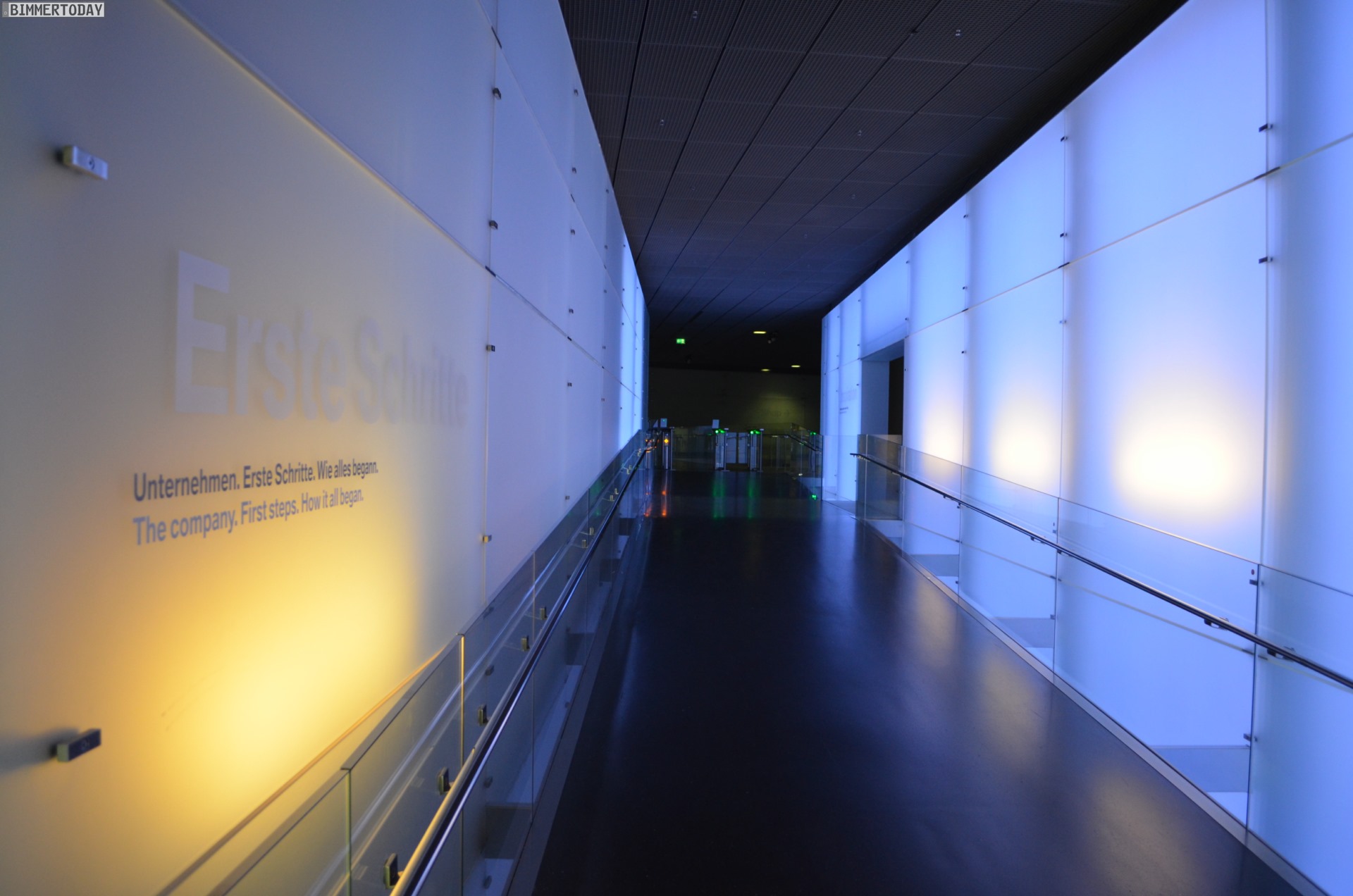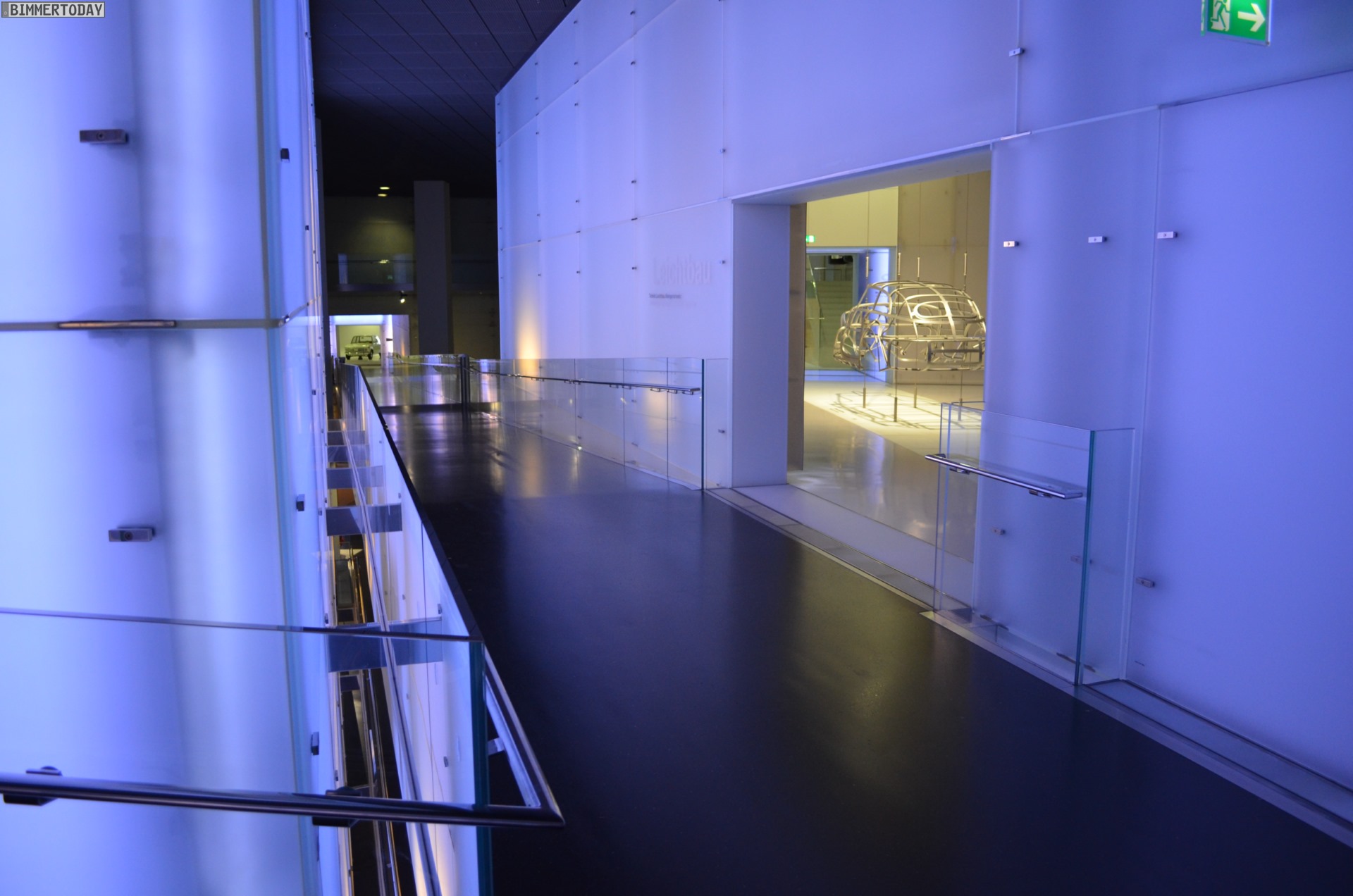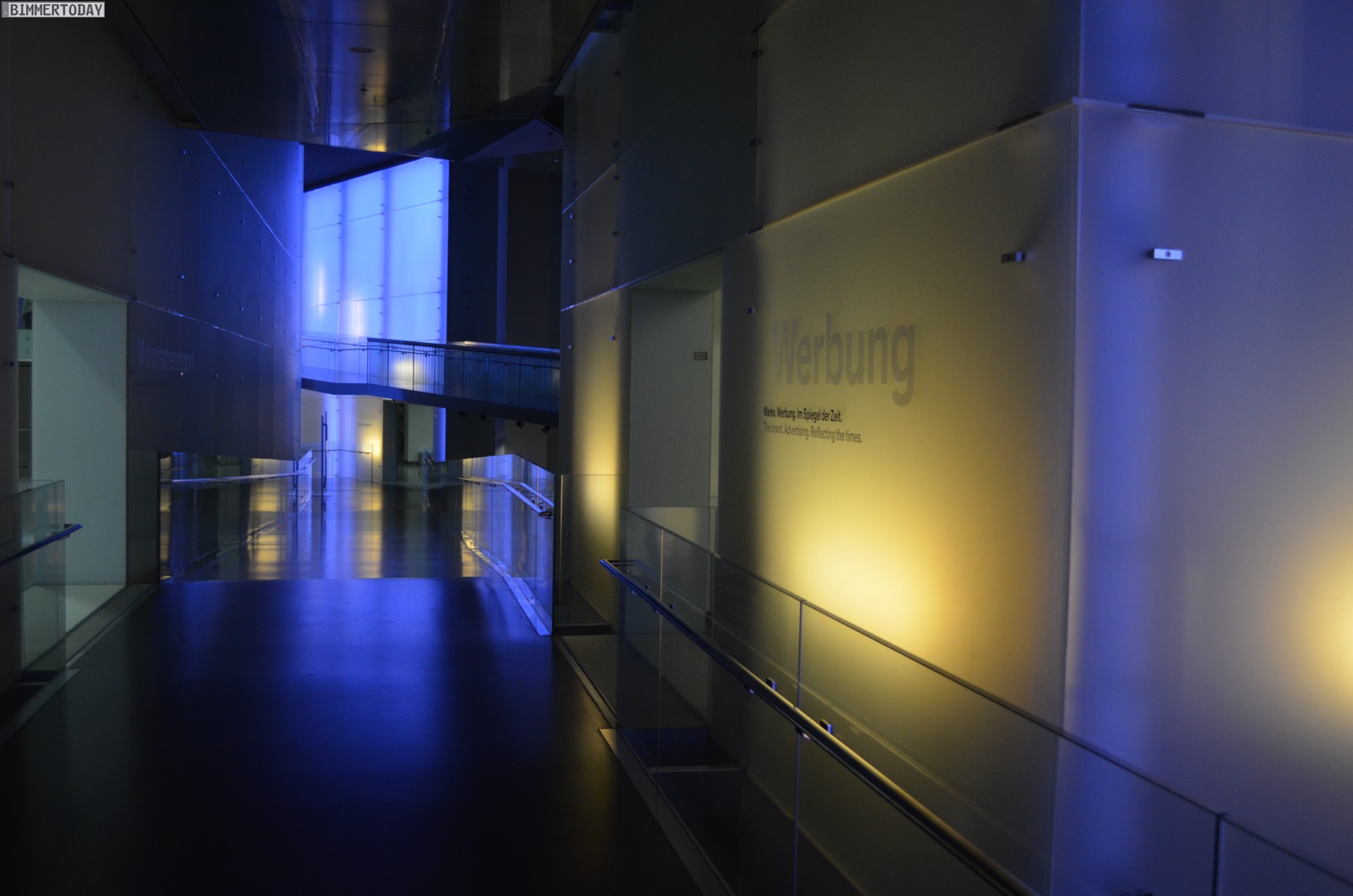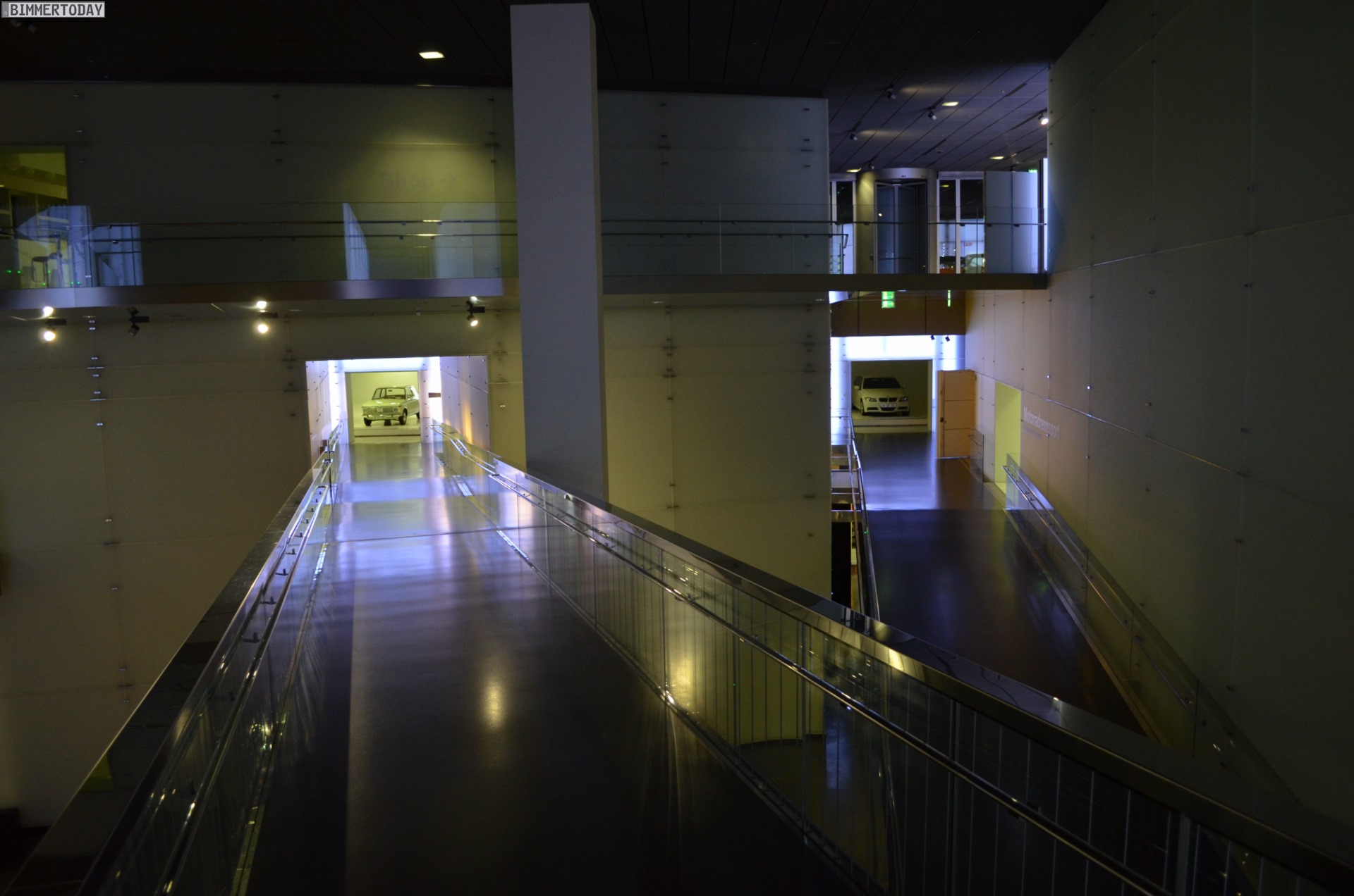 Auf eine besondere Art ließ sich während der Nacht im BMW Museum auch die Architektur des Gebäudes erleben. Die menschenleeren und nur schwach illuminierten Gänge lieferten eine einzigartige Kulisse: