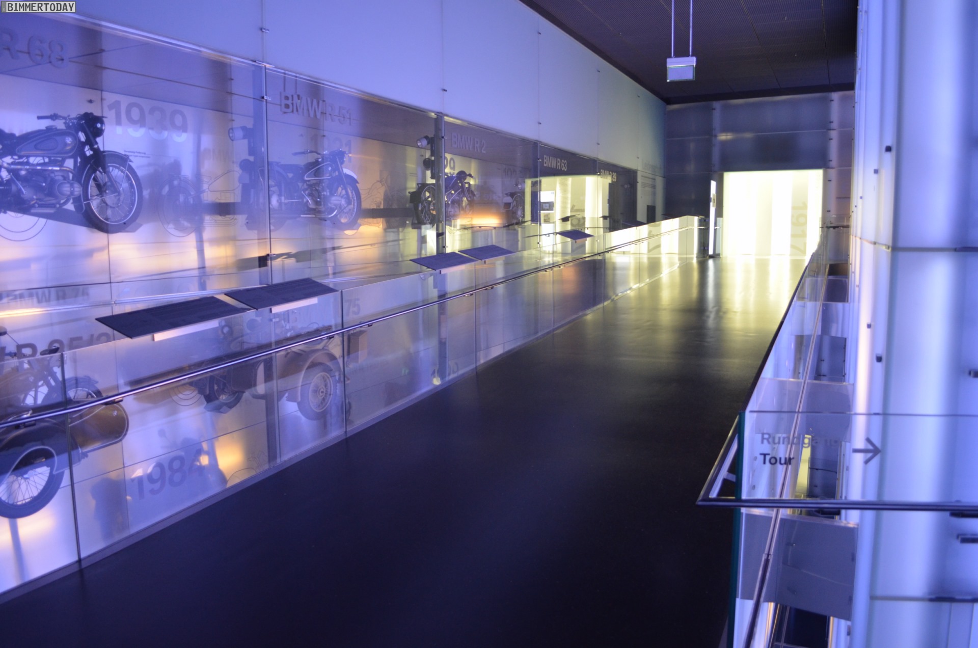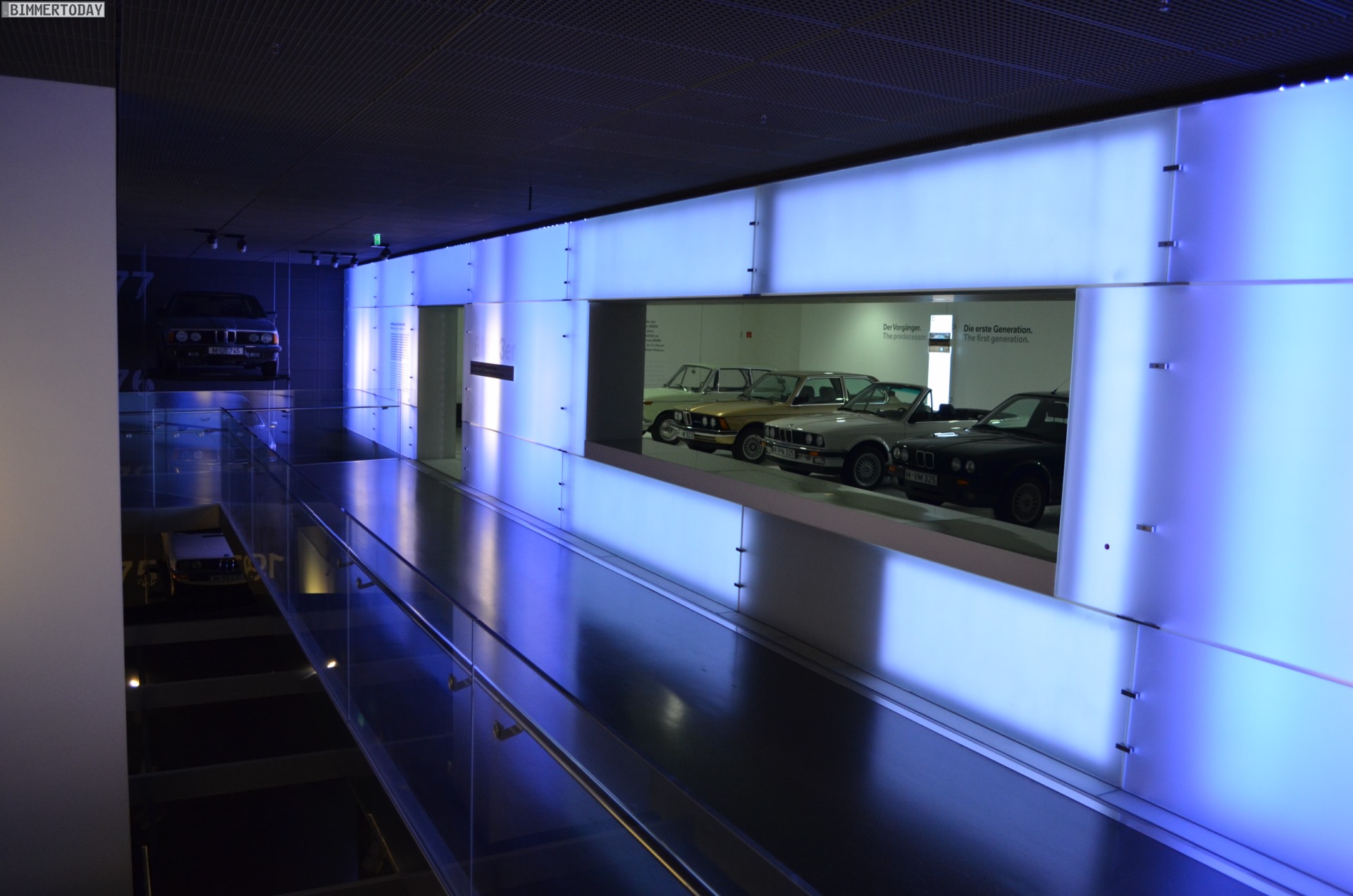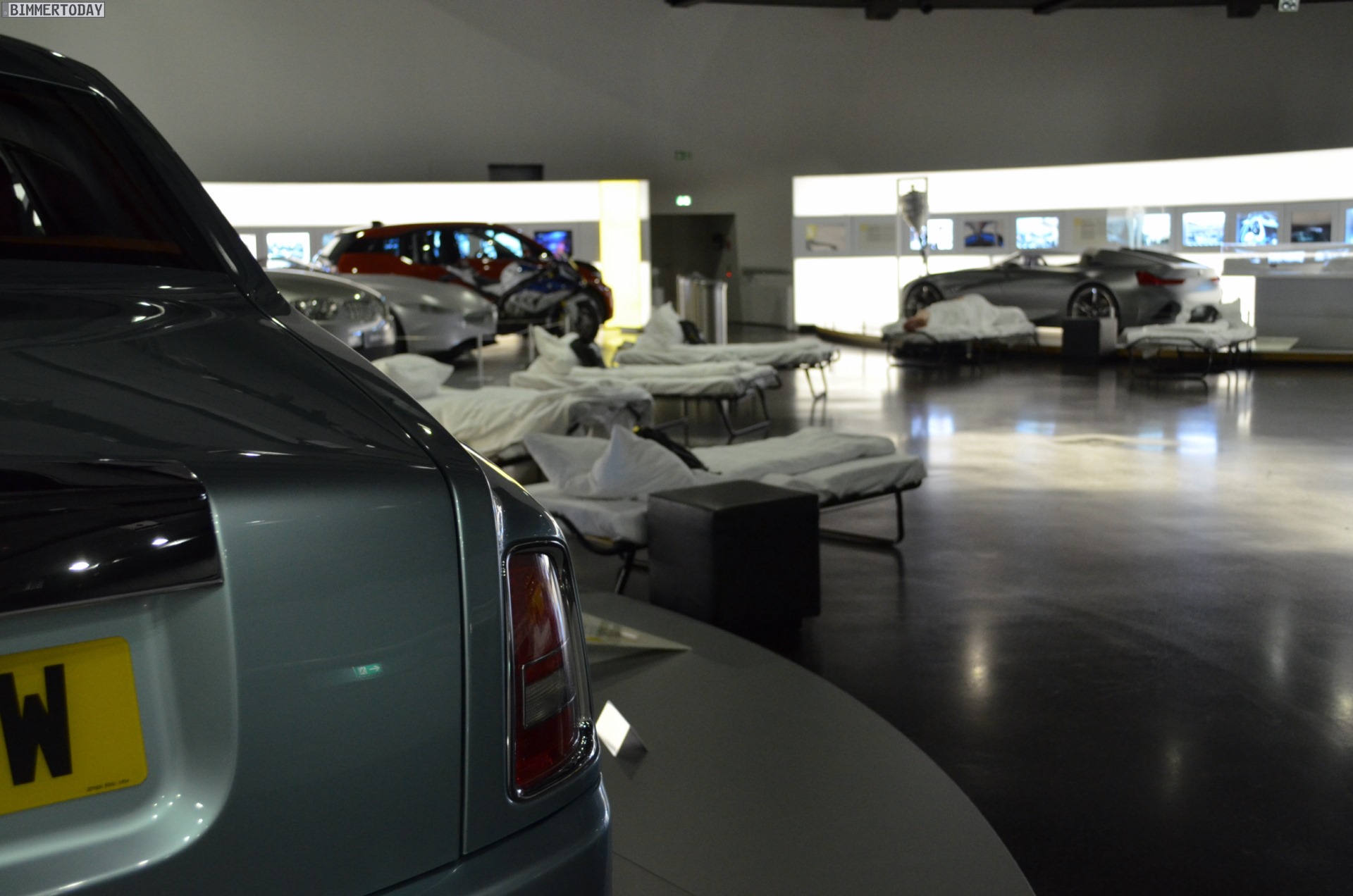 Auf eine besondere Art ließ sich während der Nacht im BMW Museum auch die Architektur des Gebäudes erleben. Die menschenleeren und nur schwach illuminierten Gänge lieferten eine einzigartige Kulisse: