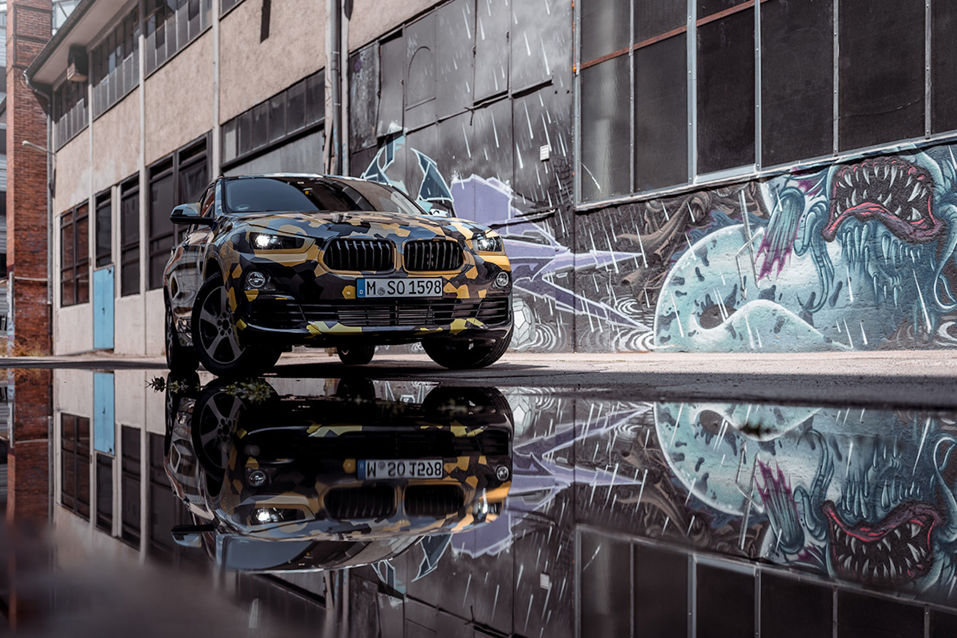 Auf den Bildern rollt ein im auffälligen Camouflage-Look getarnter Erlkönig durch München. Coole Industrie-Locations, Menschen, die den bunten Offroader interessiert beobachten – bereits diese ganz speziellen Erlkönig-Fotos machen deutlich, dass sich der neue BMW X2 in der urbanen und modebewussten City am wohlsten fühlt. Ganz bewusst bleiben die tatsächlichen Dimensionen des mit der Baureihenbezeichnung F39 versehenen Crossovers noch verhüllt.
