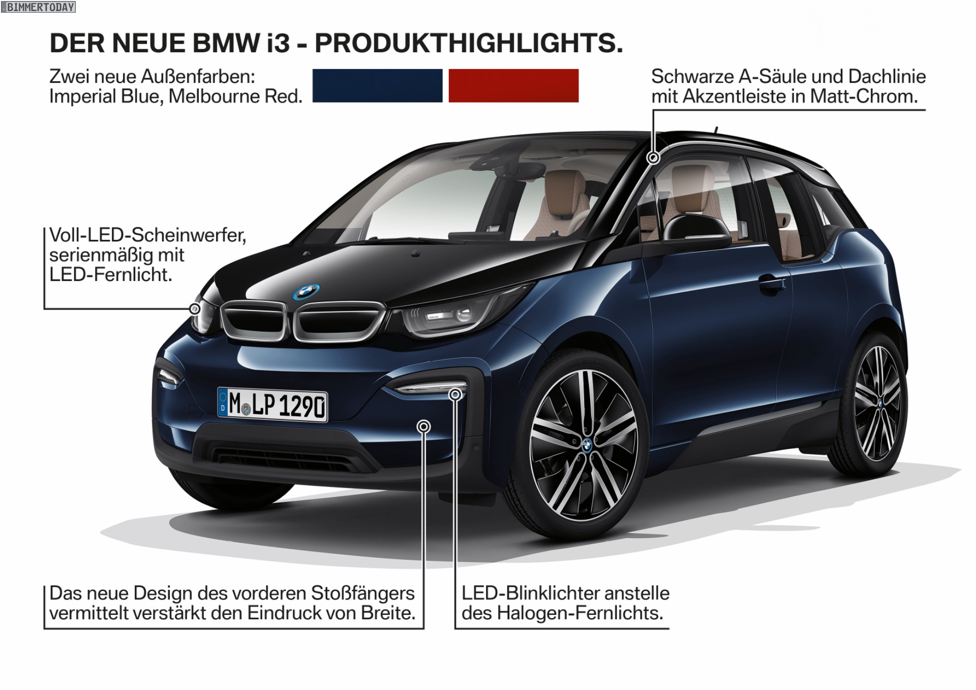 Einen wesentlichen Beitrag zur aufgefrischten Optik des BMW i3 Facelift 2017 leisten die neuen Lackierungen Imperialblau und Melbourne Rot, die mit ihren kräftigen Farben auch im bunten Stadtverkehr für Aufsehen sorgen können. Die nun in Schwarz gehaltenen A-Säulen und Dach-Elemente betonen die seit Marktstart vom Black Belt eingeführten Kontraste.