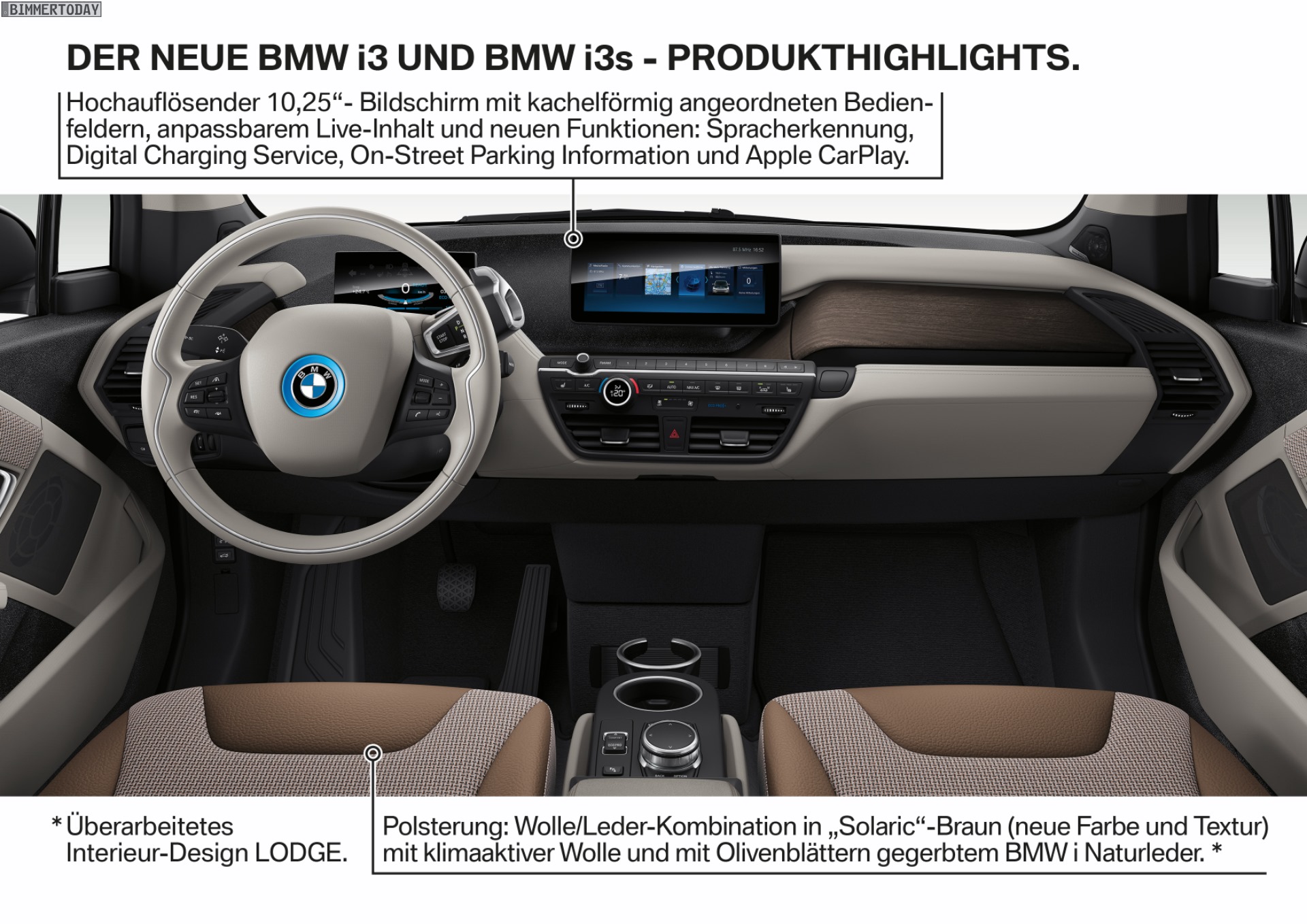 Im Innenraum sorgt nicht nur das überarbeitete Lodge-Design für frischen Wind, auch das Infotainment-System iDrive wird zum Facelift auf den neuesten Stand gebracht. Das 10,25 Zoll große Display bietet nun das bereits von anderen Modellen bekannte Kachel-Design mit sogenannten Live-Kacheln, die bereits im Hauptmenü eine Vorschau auf wichtige Inhalte des jeweiligen Menüpunkts liefern: