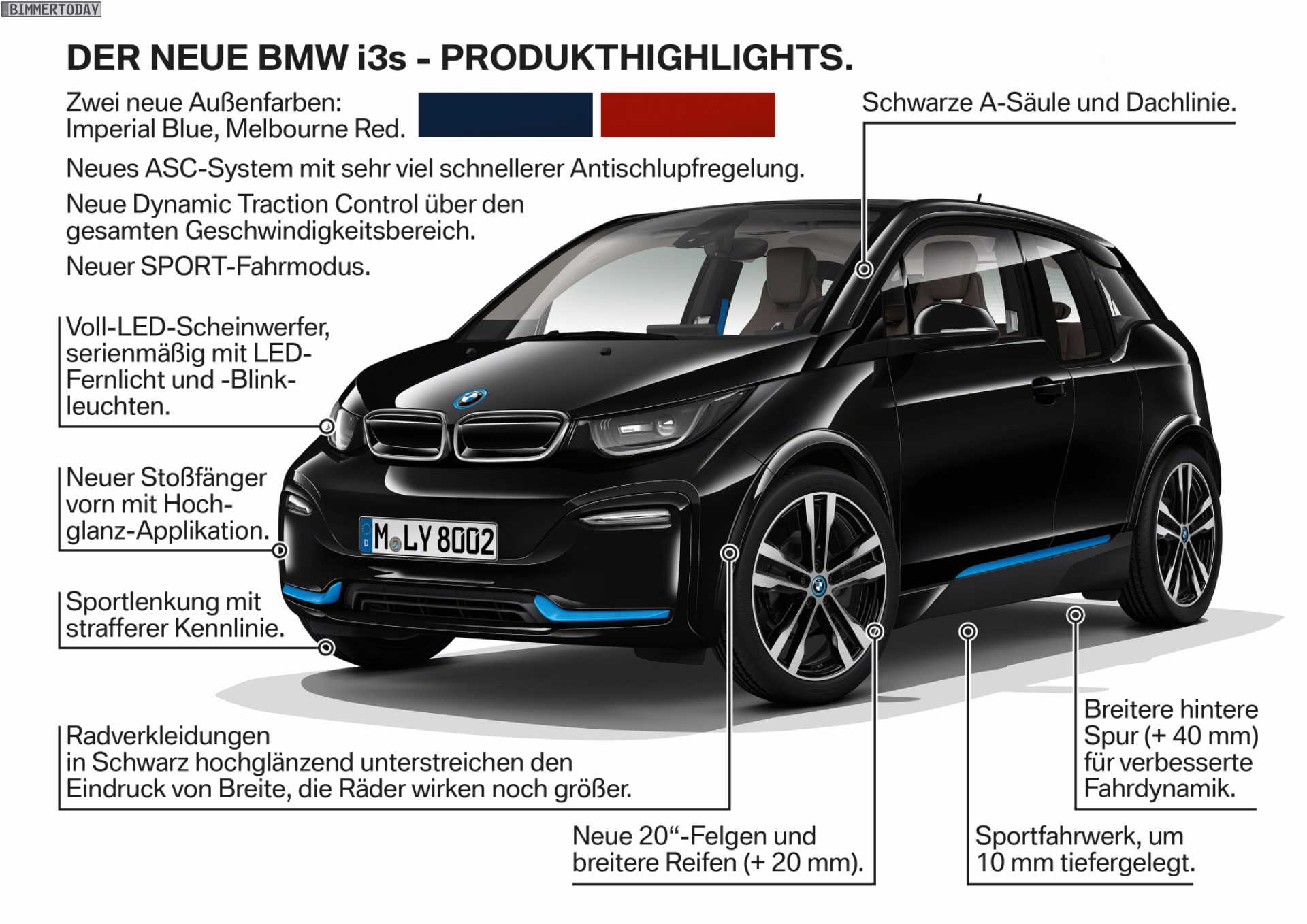 Der unverändert 170 PS starke Elektromotor des BMW i3 wird zum Facelift mit einer neuen DSC-Abstimmung kombiniert, die für noch mehr Fahrspaß sorgen soll. Die dynamische Traktions-Kontrolle DTC ist ganz bewusst sportlicher abgestimmt und soll nun auch kleinere Drifts erlauben. Das volle Fahrspaß-Paket bietet der neue BMW i3s mit 184 PS, der zudem über eine eigenständige Fahrwerksabstimmung mit 40 Millimeter breiterer Spur, 20 Millimeter breiterer Bereifung sowie einer Tieferlegung um 10 Millimeter verfügt.