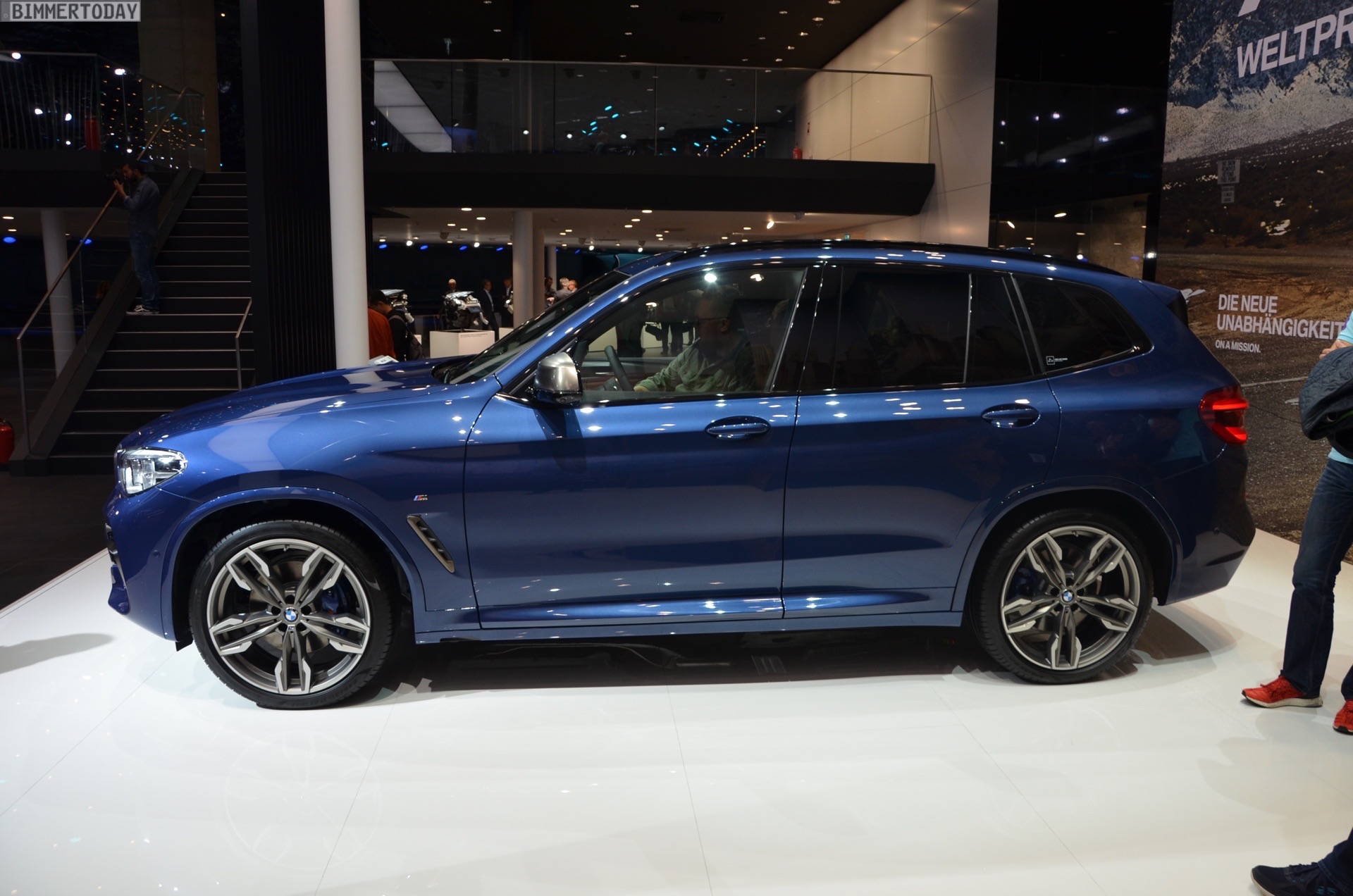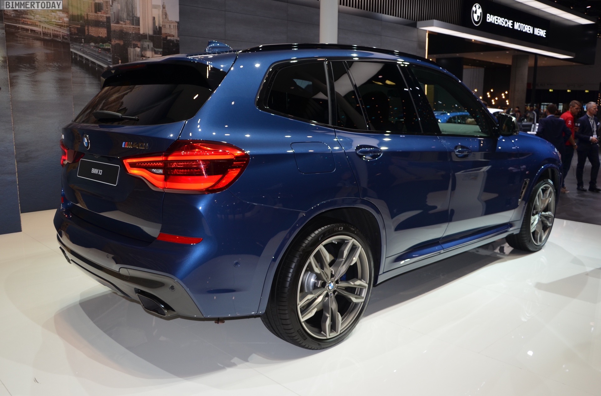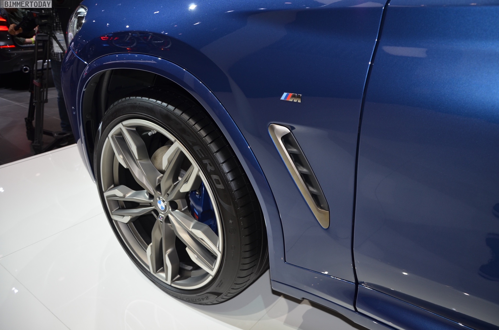 Zur Weltpremiere auf der IAA 2017 glänzt der BMW X3 M40i in der völlig neuen Lackierung Phytonic Blue, die in Deutschland unter dem Namen Phytonicblau bestellt werden kann. Das Power-SUV steht dabei auf den optionalen 21 Zoll-Felgen im Design Doppelspeiche 718 M mit breiter Mischbereifung, was den dynamischen Auftritt zusätzlich unterstreicht.