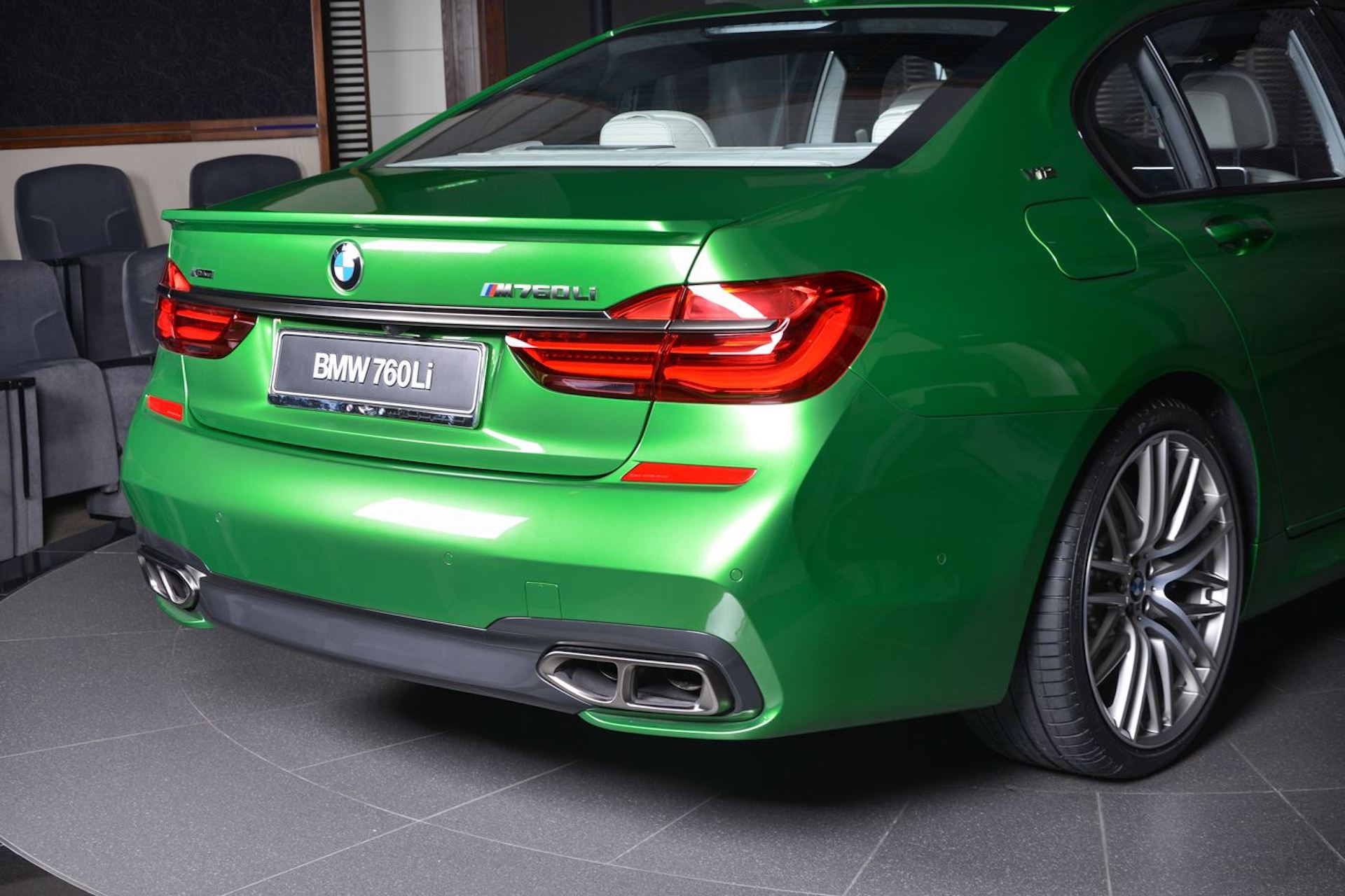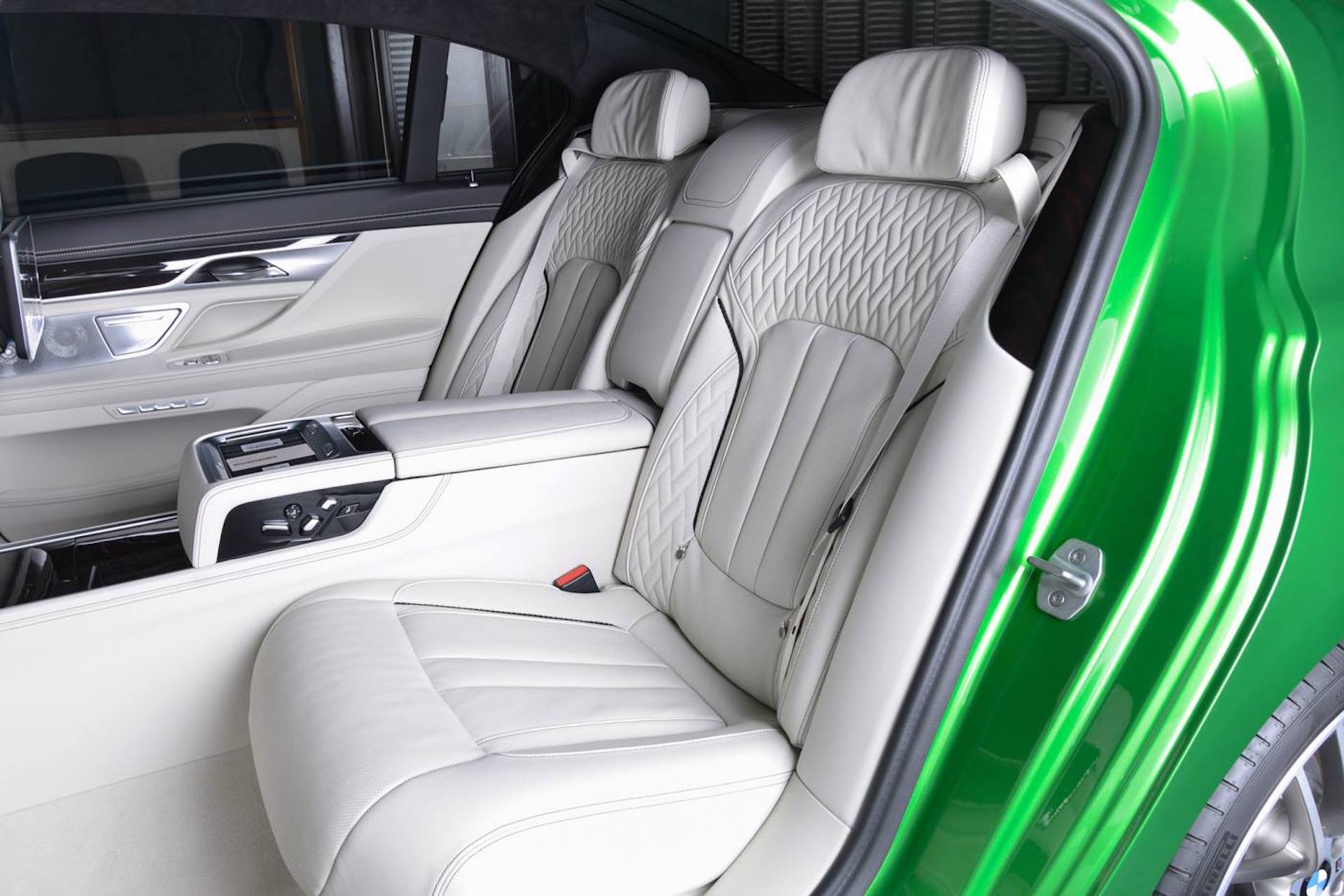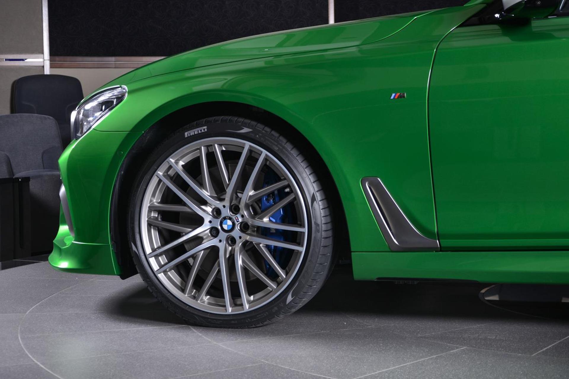 An dieser Stelle könnte man sich als Besitzer entspannt im großzügig mit rauchweißem Individual-Leder ausgekleideten Fond zurücklehnen und einfach den Druck aufs Gaspedal dieser Ausnahme-Limousine für sich sprechen lassen. Oder man macht aus dem BMW M760Li xDrive endgültig einen ultrapräsenten Supersportler. Rallye Green heißt die Lackfarbe der BMW Individual Manufaktur, für die sich der Händler bei diesem Fahrzeug in aller Konsequenz entschieden hat.