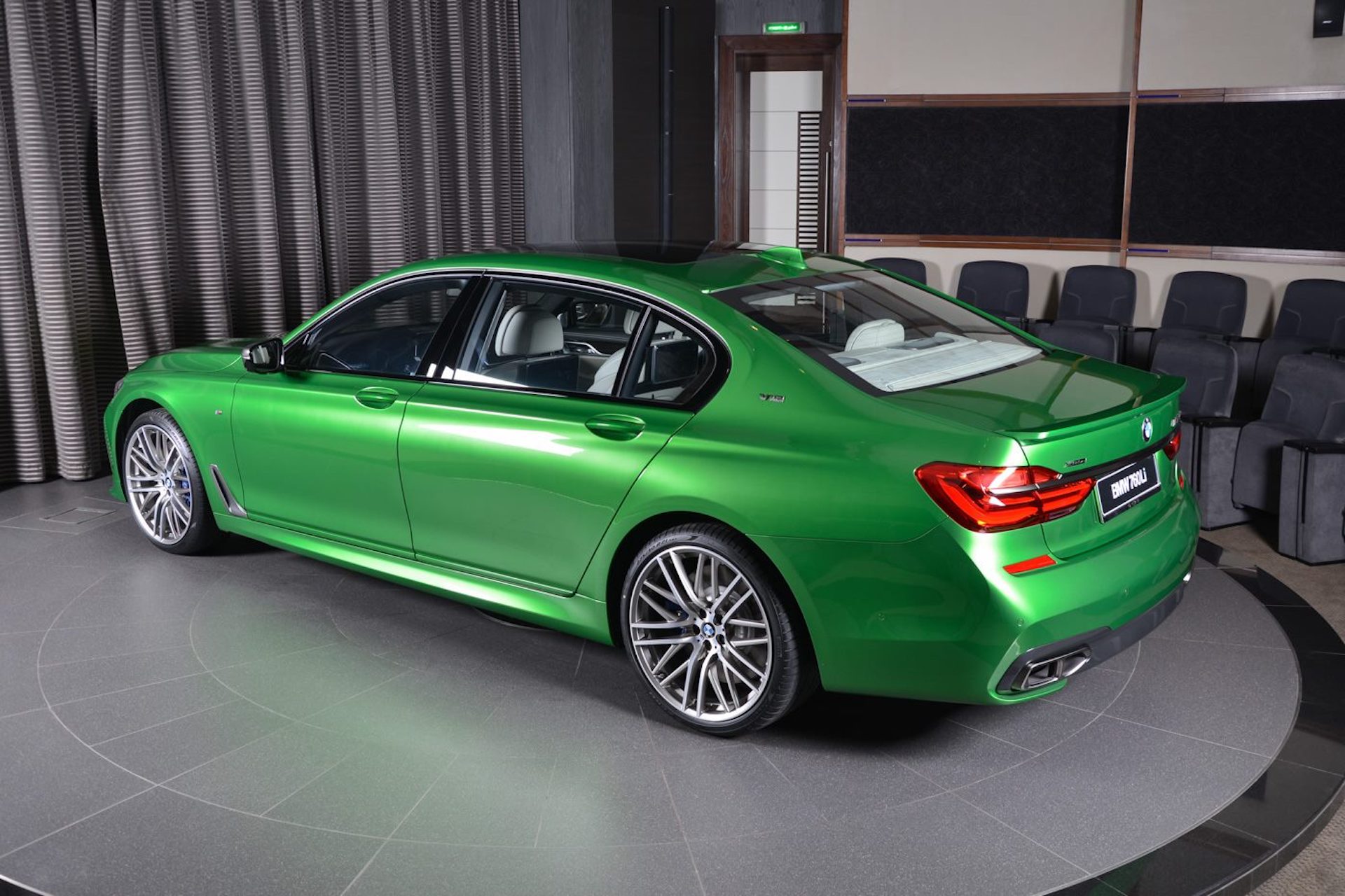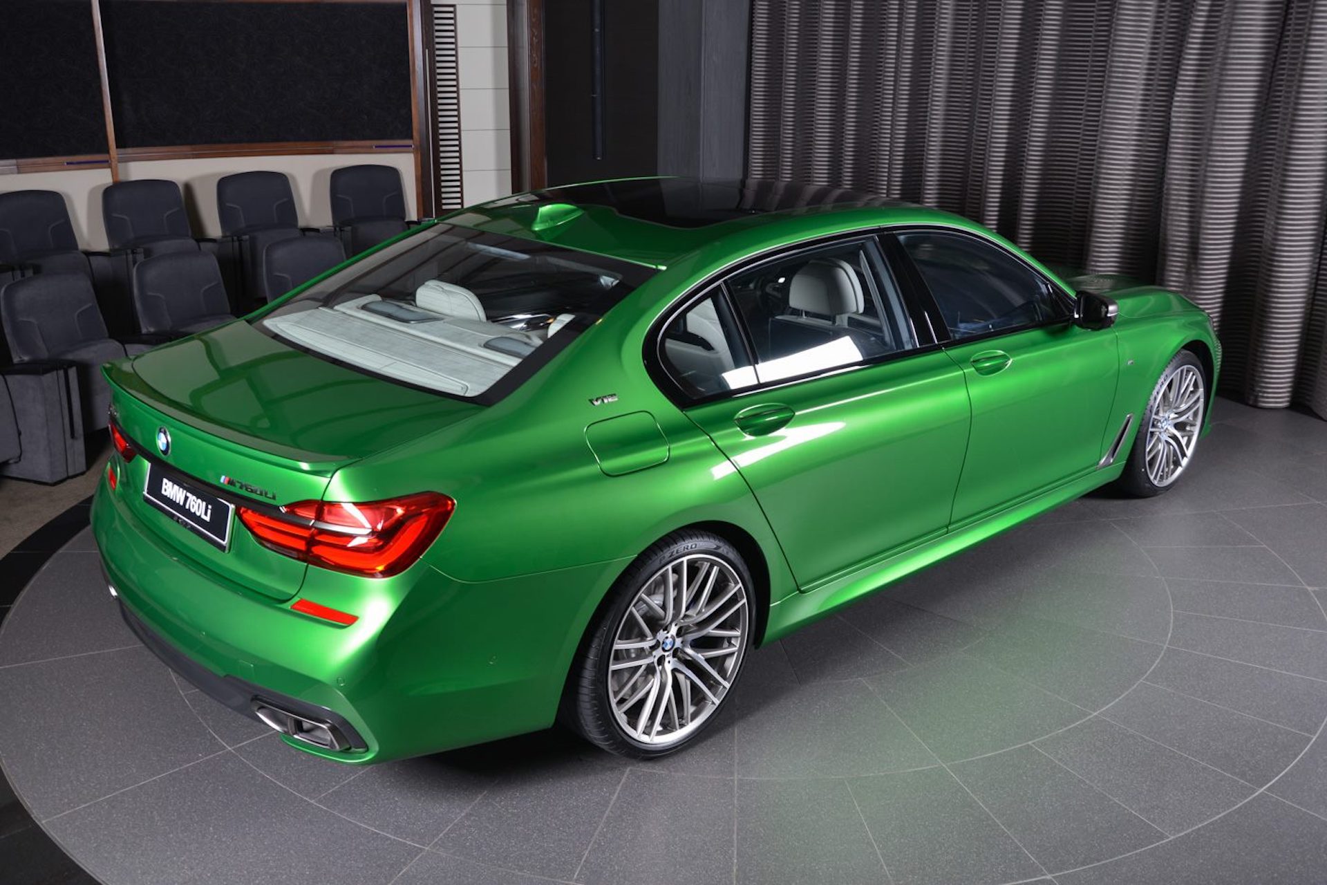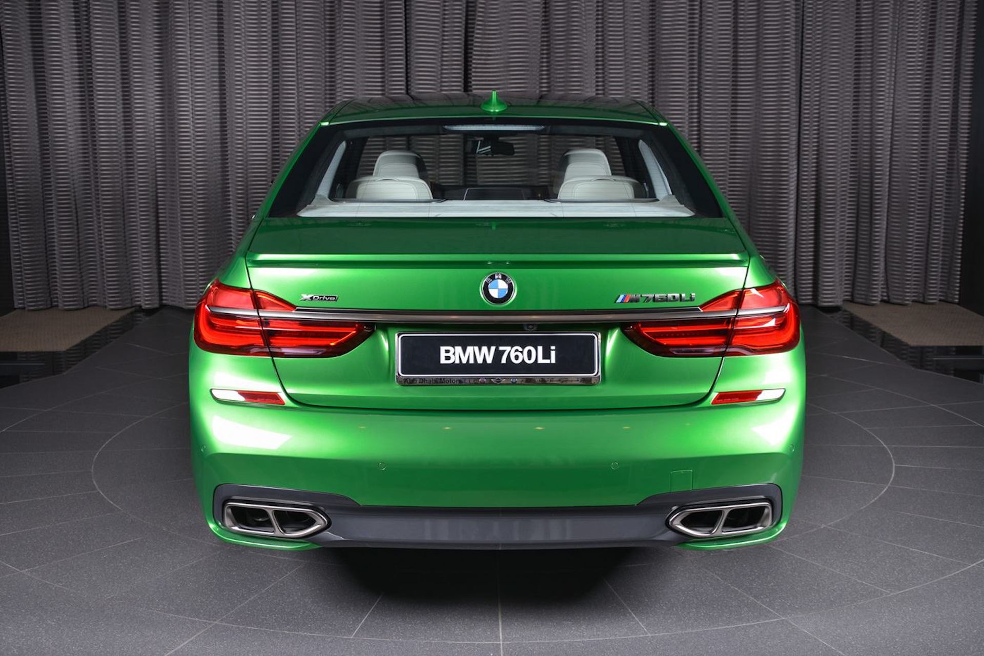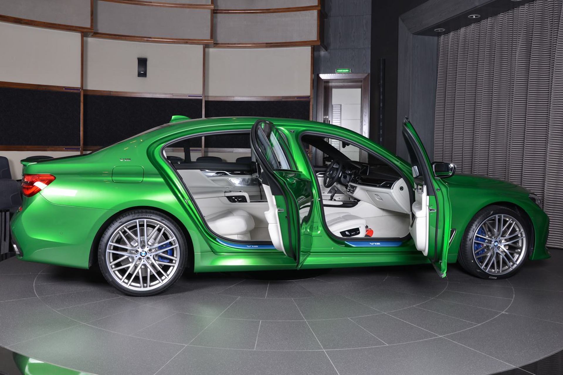 An dieser Stelle könnte man sich als Besitzer entspannt im großzügig mit rauchweißem Individual-Leder ausgekleideten Fond zurücklehnen und einfach den Druck aufs Gaspedal dieser Ausnahme-Limousine für sich sprechen lassen. Oder man macht aus dem BMW M760Li xDrive endgültig einen ultrapräsenten Supersportler. Rallye Green heißt die Lackfarbe der BMW Individual Manufaktur, für die sich der Händler bei diesem Fahrzeug in aller Konsequenz entschieden hat.