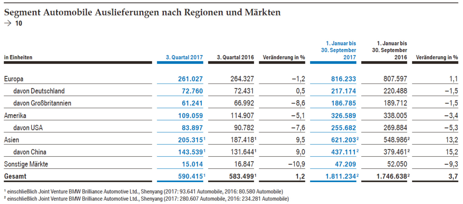 Betrachtet man die Absatzzahlen nach Regionen getrennt, so ist in Europa und Amerika ein leichtes Minus zu verzeichnen. Auf dem europäischen Kontinent gingen die Verkäufe mit -1,2 Prozent leicht zurück und auch in Amerika gab es erneut ein Absatz-Minus (-5,1 %). Weiterhin stark entwickeln sich die Absätze an Fahrzeugen auf dem asiatischen Markt. Dort konnte man im dritten Quartal 2017 um 9,5 % zulegen. Und auch auf dem Kernmarkt China gab es ein Plus von 9,0 Prozent.
