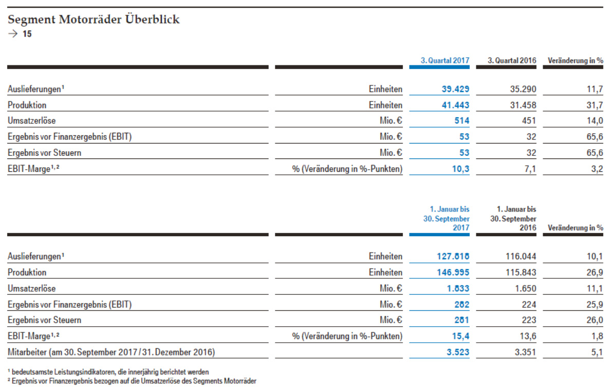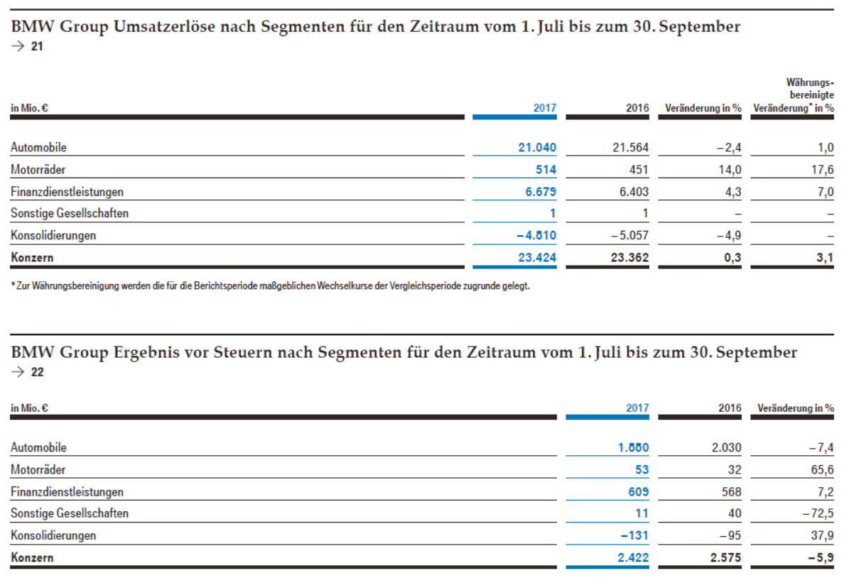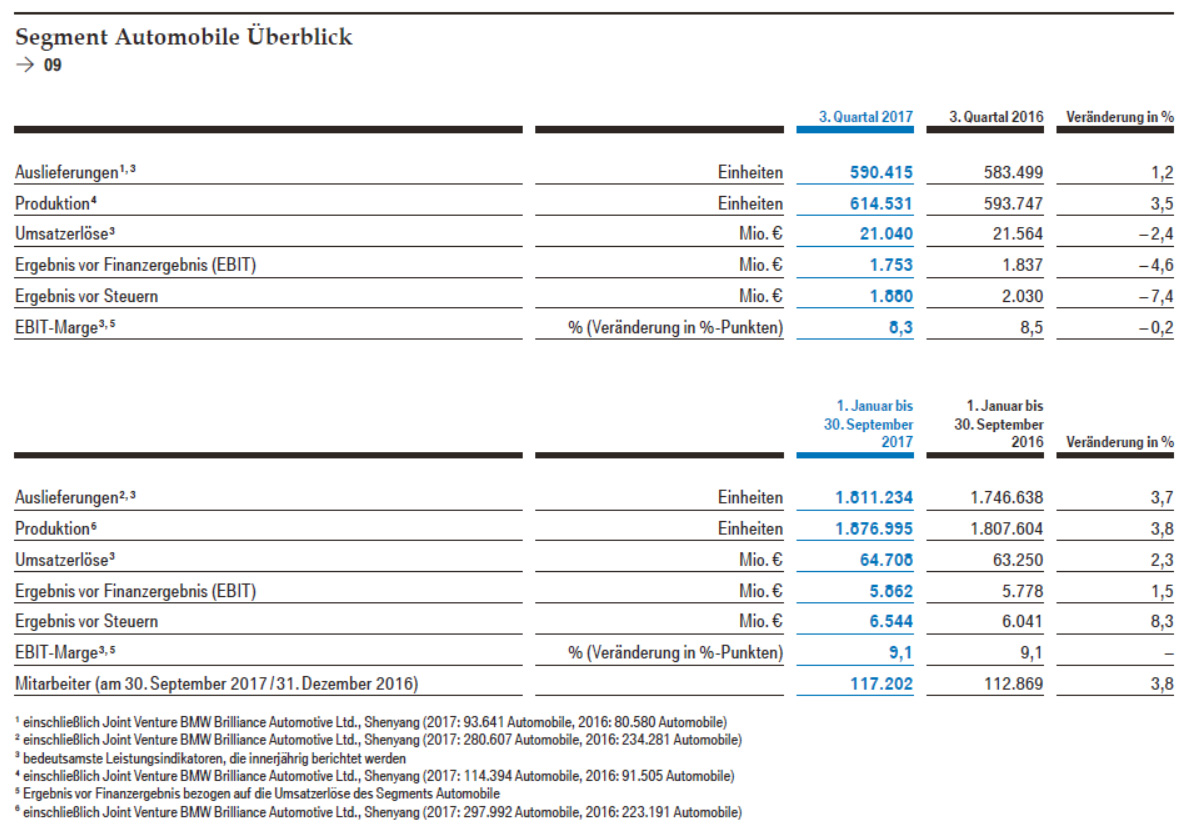Beim Konzernergebnis vor Steuern (EBT) vermeldet BMW einen Rückgang auf 2,422 Milliarden Euro, was einem Minus von 5,9 Prozent entspricht. Dadurch gab es im dritten Quartal 2017 leichte Einbußen beim Gewinn, der um 1,8 Prozent auf 1,789 Milliarden Euro sank.