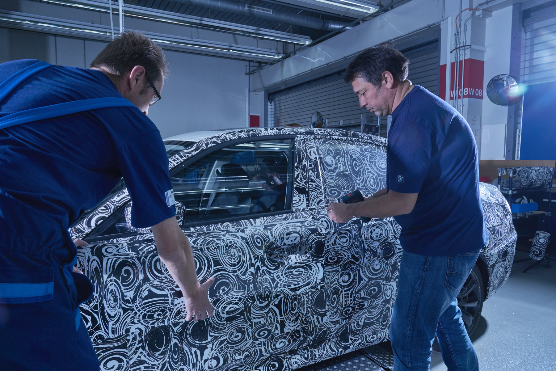 Die Folien auf den Fahrzeugen aufzubringen ist eine Wissenschaft für sich. „Zwei Personen brauchen etwa einen Tag, um zu diesem frühen Zeitpunkt der Testfahrten die Maximaltarnung aufzubringen“, erklärt Markus Schwab aus dem Tarnbereich von BMW, „hierzu werden nicht nur Folien aufgebracht, sondern auch Schalen aufgeschraubt. Wenn es schneller gehen soll, arbeiten gleichzeitig vier oder fünf Personen an einem Auto.“ Gerade wird die Schulterlinie des an sich weißen BMW 3er Prototypens mit drei Millimeter dicken ABS-Kunststoffteilen verbastelt. „Pro Auto sind es rund 20 Elemente“, ergänzt Markus Schwab. Details wie Türgriffe, Außenspiegel und insbesondere die Leuchten werden dabei besonders liebevoll abklebt oder mit Modulen versehen, die gar nichts mit dem zukünftigen Modell zu tun haben. Jovica Petrovic hat gerade die hinteren Seitenscheiben mit einer Lochfolie abgedeckt und fitzelt gerade die Tarnfolie rund um den hinteren Türgriff. An der Wand vor dem Prototyp steht ein großes Regalsystem, in dem sich die einzelnen Techniker bei der Verplankung des Testwagens bedienen. „Die Kunststoffschalen machen den Wagen nur rund zehn Kilogramm schwerer und beeinträchtigen die Fahrtests nur minimal“, erklärt Markus Schwab weiter, „das ist den Entwicklern besonders wichtig.“