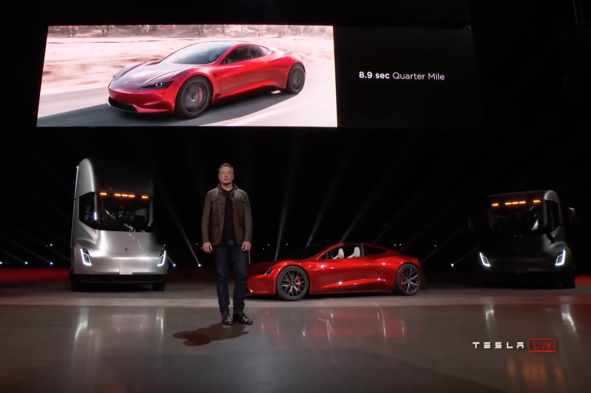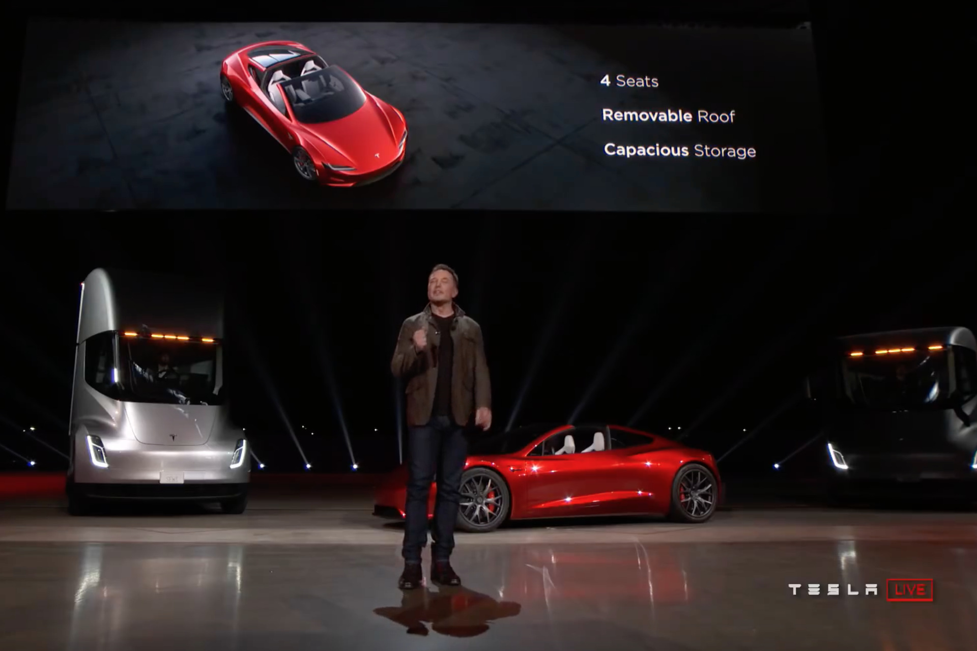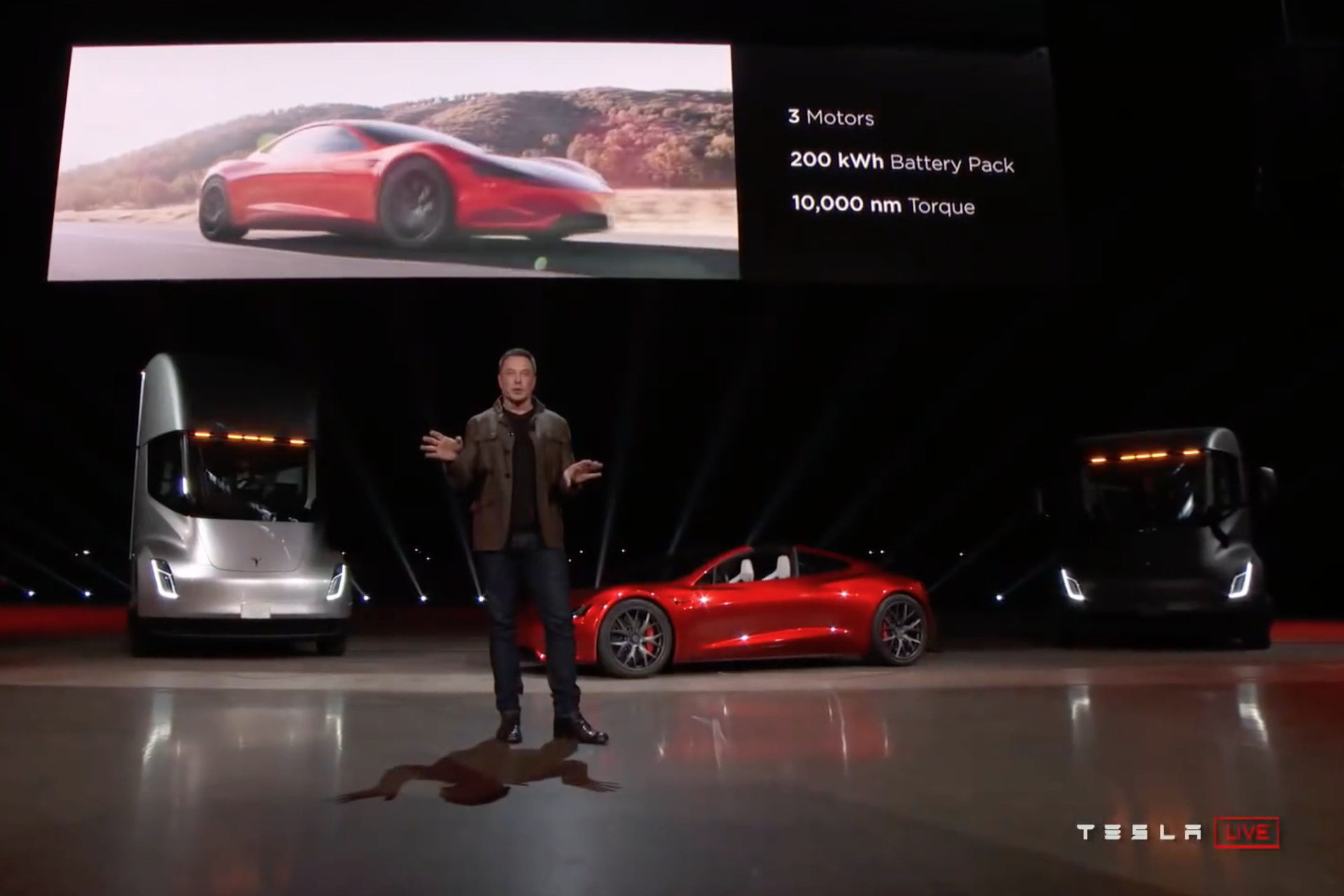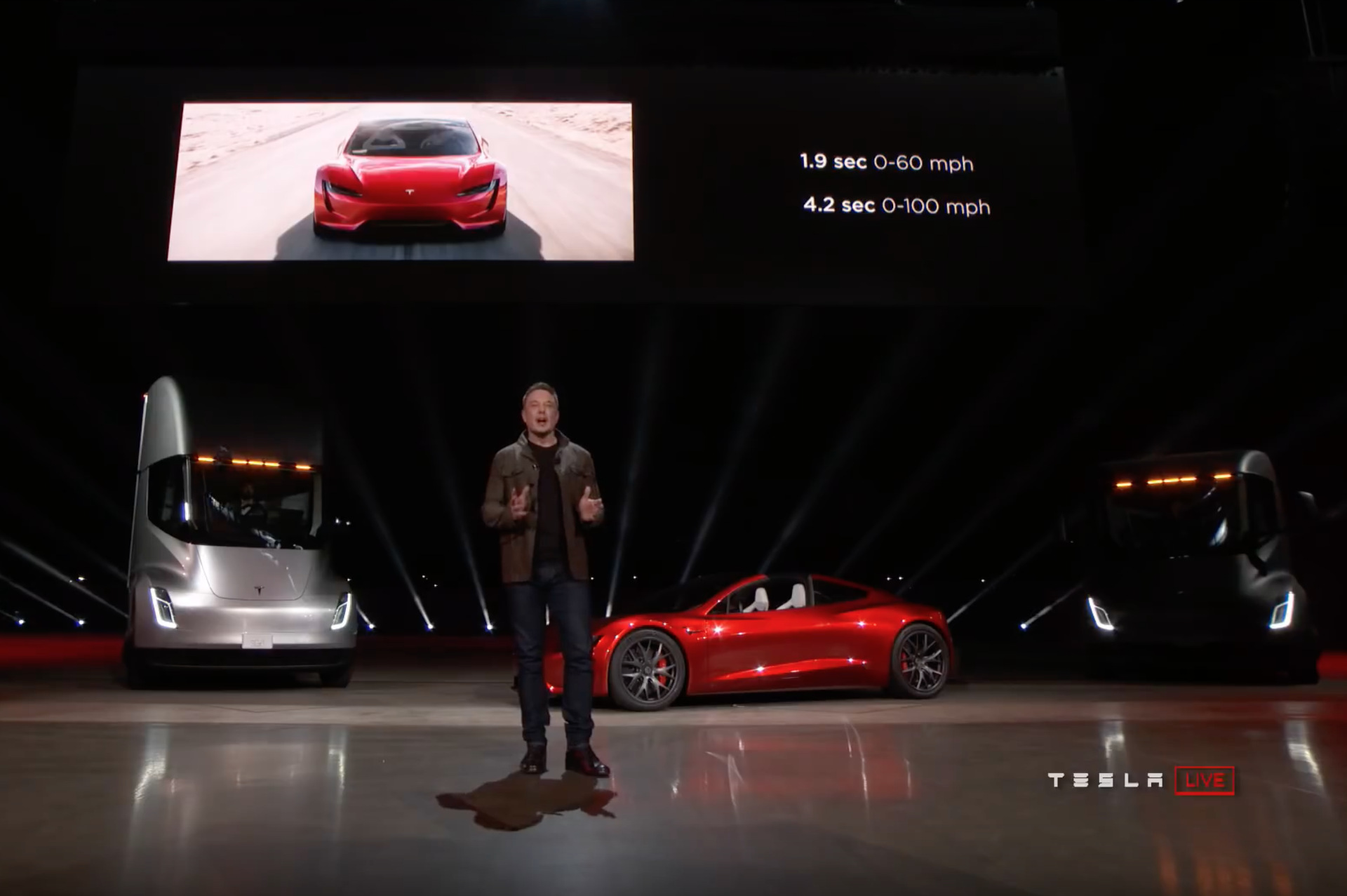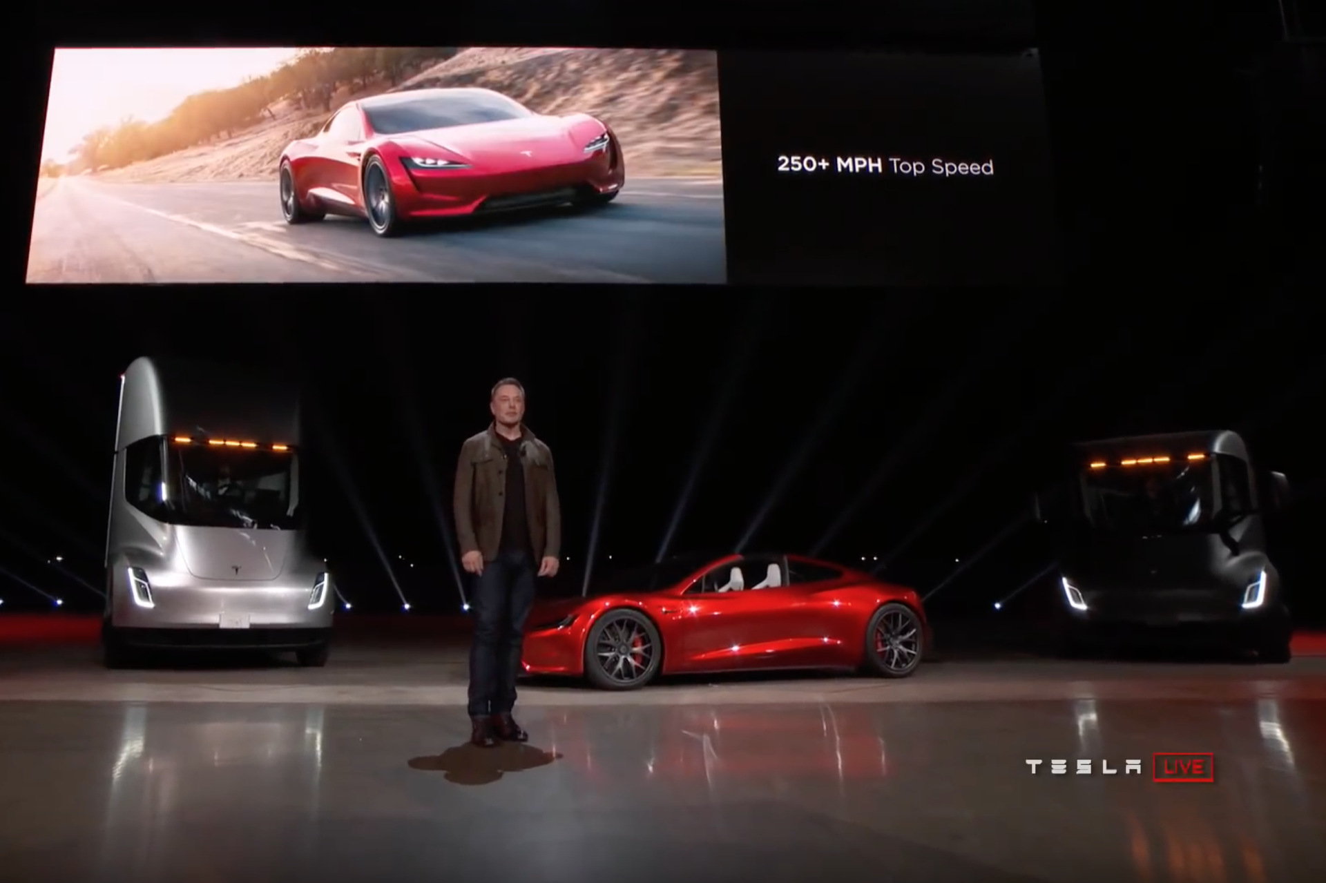Mit dem Tesla Semi stellte Elon Musk außerdem einen Truck vor, der mit 500 Meilen Reichweite eine ebenso saubere wie leistungsstarke Alternative zu Lkws mit konventionellem Antrieb darstellen soll. Aber zurück zum neuen Tesla Roadster: Der Sportwagen soll bereits in seiner Basisversion in nur 1,9 Sekunden aus dem Stand auf 60 Meilen pro Stunde (96 km/h) beschleunigen und würde damit in dieser Disziplin zu einem der schnellsten Serien-Fahrzeuge der Welt zählen. Über noch stärkere und schnellere Varianten will Elon Musk erst später sprechen, ausgeschlossen sind diese aber keineswegs.