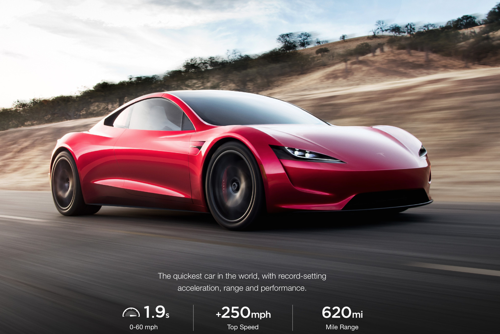 Die 100-Meilen-Marke (160 km/h) soll die Einstiegsvariante des Tesla Roadster II nach vielleicht sogar noch beeindruckenderen 4,2 Sekunden knacken – ein Zeitpunkt, zu dem viele veritable Sportwagen gerade erst die 100 km/h-Marke hinter sich gelassen haben. Die für Amerikaner ebenfalls wichtige Viertelmeile soll der neue Tesla Roadster in 8,9 Sekunden absolvieren, die ohnehin nur auf dem deutschen Markt relevante Höchstgeschwindigkeit gibt Tesla mit über 250 Meilen (!) pro Stunde an – also über 400 km/h!