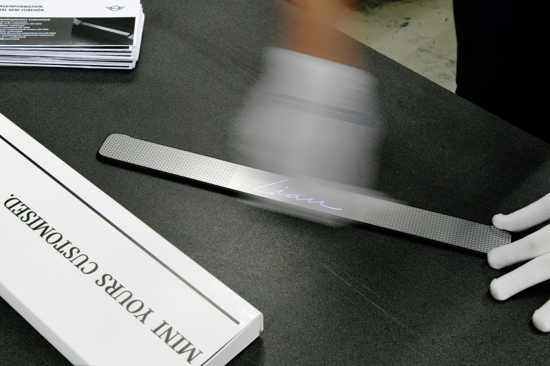 Weiter geht es mit personalisierten Einstiegsleisten, auch hier kann ein Name als beleuchteter Schriftzug für die persönliche Begrüßung sorgen. Abgerundet wird das Individual-Programm mit vom Kunden gestalteten Interieur-Leisten, die vor dem Beifahrer angebracht und beispielsweise die Skyline der Heimat- oder Lieblingsstadt zeigen können.