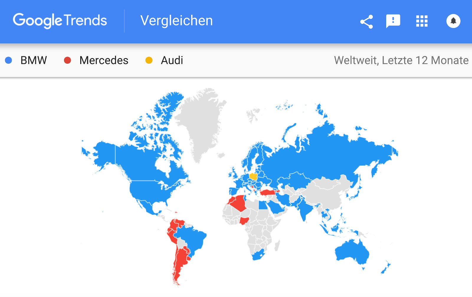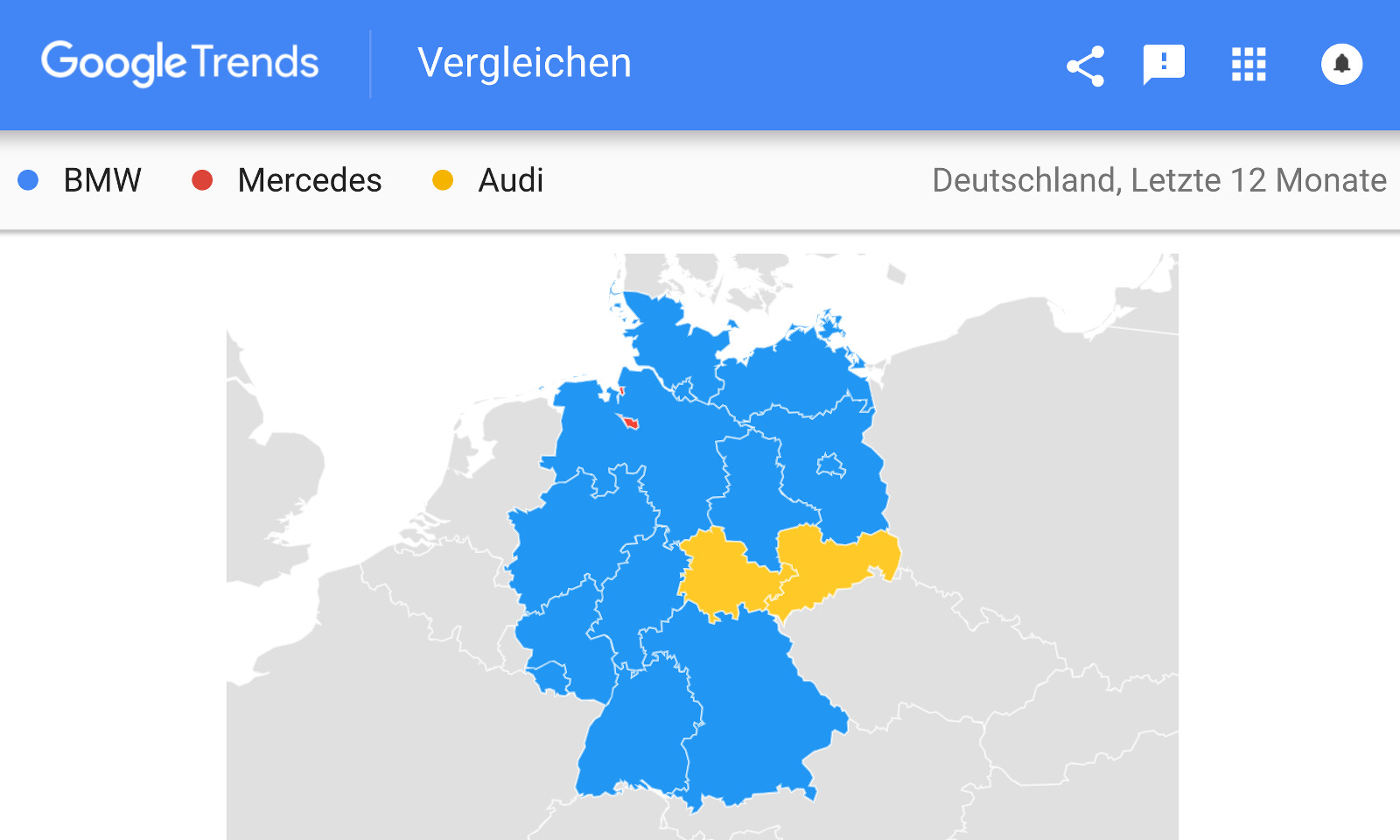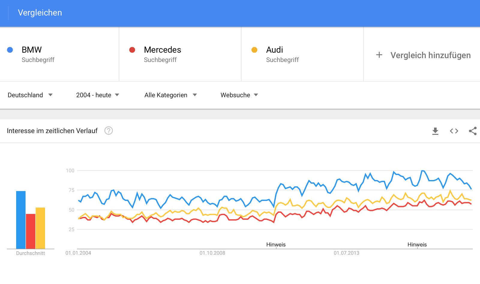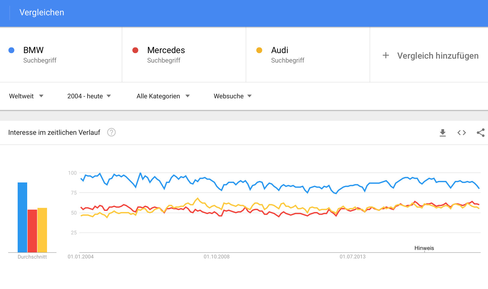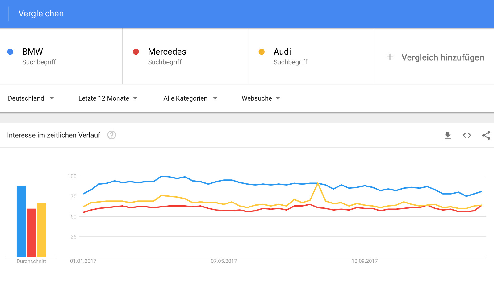 Die Google Trends 2017 zeichnen dabei ein klares Bild: BMW war auch in den letzten zwölf Monaten die meistgesuchte der drei Automarken, sowohl weltweit betrachtet als auch auf dem Heimatmarkt Deutschland. Während sich Mercedes und Audi ein Kopf-an-Kopf-Rennen um den Platz des stärksten Verfolgers liefern, scheint die Spitzenposition von BMW derzeit unangefochten: Im Durchschnitt der letzten zwölf Monate wird nach den beiden Wettbewerbern nur rund zwei Drittel so oft gesucht wie nach BMW.
