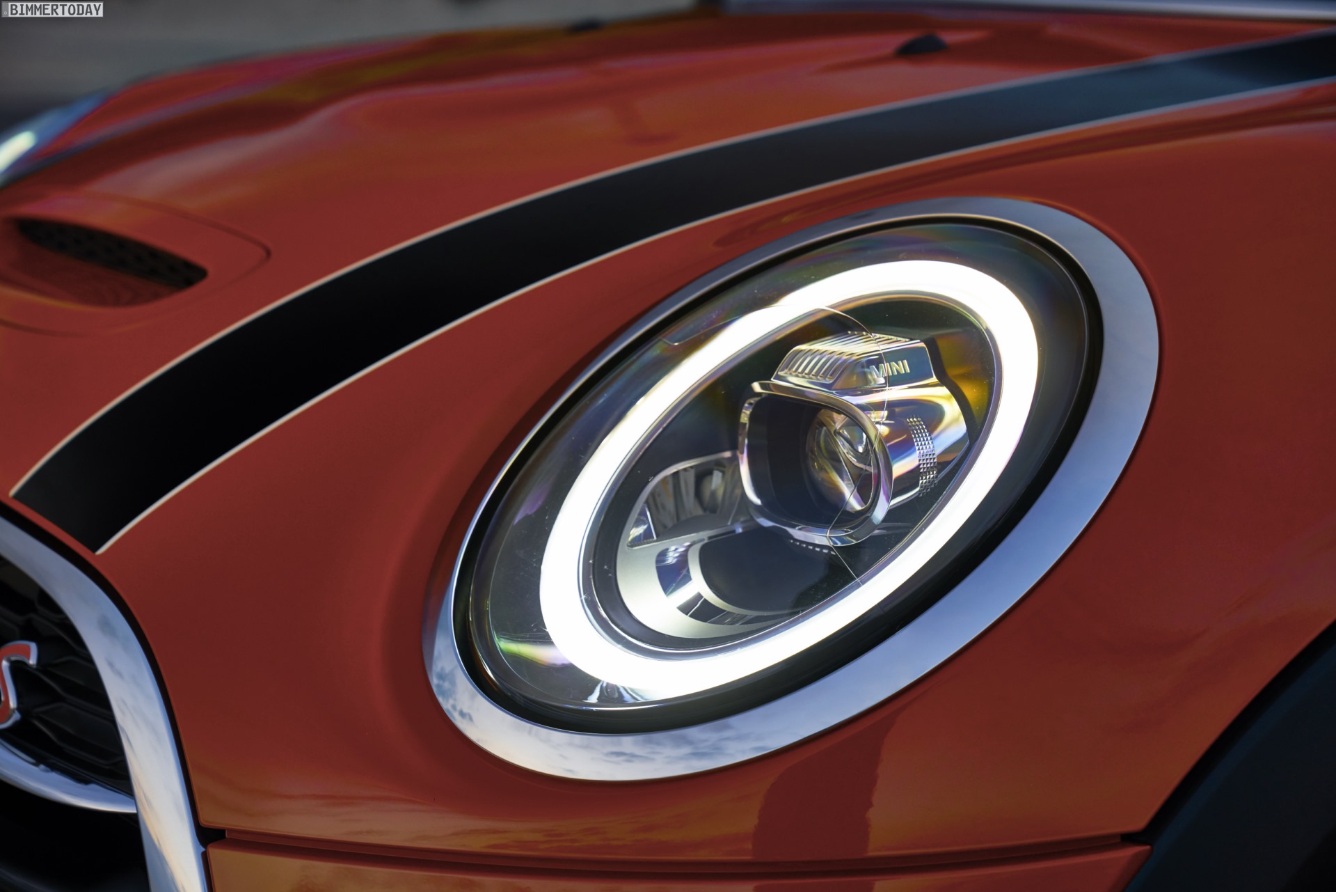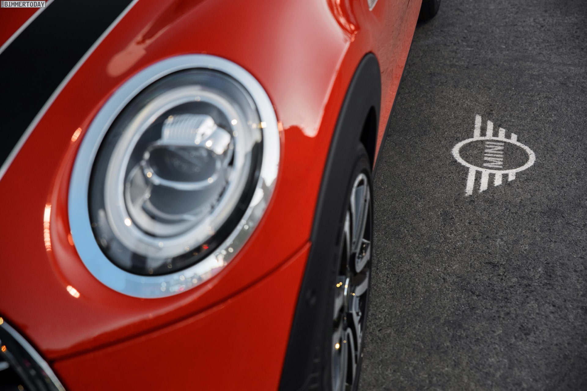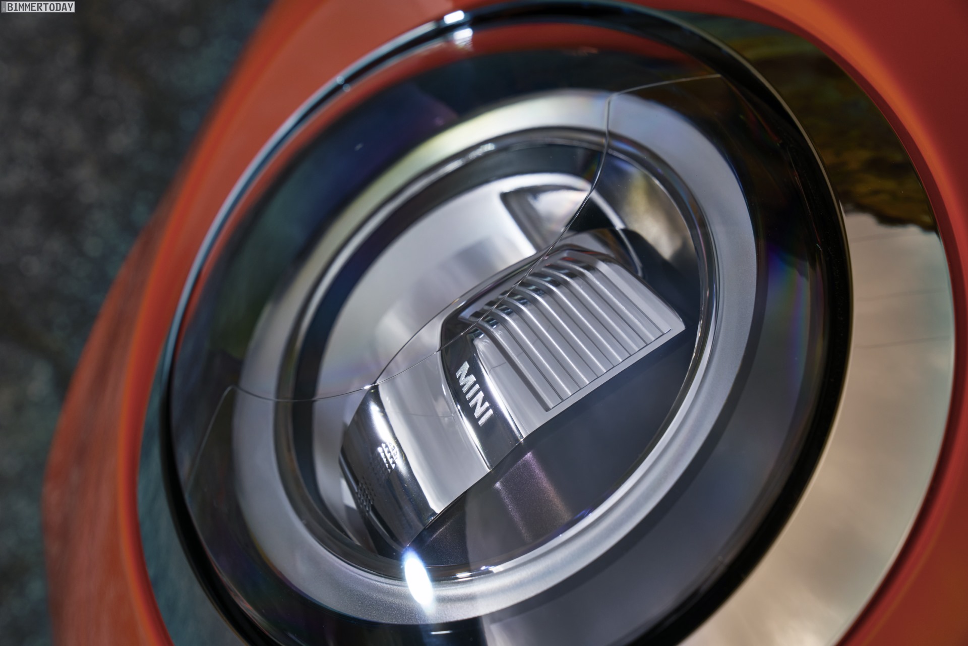 Neue Lichttechnik gibt es auch an der Front, denn das MINI Facelift 2018 geht mit durchgehender LED-Umrandung für die charakteristischen Scheinwerfer an den Start. Das kreisrunde Tagfahrlicht wird beim Blinken vollflächig orange und dürfte alle anderen Verkehrsteilnehmer unmissverständlich über die Absichten des MINIs informieren. Ebenfalls neu sind die Logos an Front und Heck des Fahrzeugs, denn F55, F56 und F57 sind die ersten Serienfahrzeuge mit dem reduzierten MINI-Logo auf der Außenhaut. Für noch mehr frischen Wind sorgen außerdem neue Felgen und die neuen Lackierungen Solaris Orange und Starlight Blue, die wir auch auf den ersten Fotos betrachten dürfen: